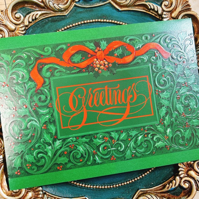 こちらヴィンテージのクリスマスカードです。深い緑を基調としたゴージャスなデザインが特徴的です。表面には赤いリボンとヒイラギがあしらわれ、「Greetings」というエレガントなフォントが描かれています。内側には浮き彫りの装飾が施され、「Greetings of the season and best wishes for the coming year.」というシンプルで温かいメッセージが印字されています。 このカードは、「Paper Magic Group」の製品で、製造国はアメリカ(Made in USA)と明記されています。おそらく1990年代ごろの製品と思われ、保存状態も良好で、ヴィンテージの魅力を持つ一品です。 クリスマスカードとしてだけでなく、季節のディスプレイやコレクションとしても活躍するアイテムです。