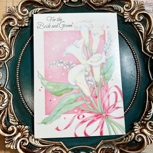 淡いピンクの背景に白いカラーの花束が描かれた、やさしく上品な雰囲気のウェディングカードです。表紙には「For the Bride and Groom」の文字が入り、結婚という特別な節目を祝うための一枚であることが静かに伝わってきます。透明感のある色彩で描かれたカラーの花と小花、リボンのモチーフが、水彩画のようなやわらかなタッチで表現されており、全体に清楚で穏やかな印象です。 カードを開くと、右ページに「CONGRATULATIONS! May your wedding and your life together be filled with joy and love.」というシンプルで温かいメッセージが印刷されています。左ページは無地のため、贈る相手への言葉を書き添えやすく、実用性も兼ね備えています。フォントは落ち着いたセリフ体で、甘くなりすぎず、大人のウェディングカードとして使いやすいデザインです。 裏面には1996年 Marian Heath Greeting Cards の表記があり、アメリカ製のカードであることがわかります。リサイクルペーパー表記もあり、紙質はしっかりしつつもややマットで、手触りに温かみがあります。未使用品のため、全体的に状態は良好です。結婚祝いのメッセージカードとしてはもちろん、額装してインテリアとして飾ったり、ウェディングをテーマにしたコラージュや撮影小物としてもおすすめの一枚です。