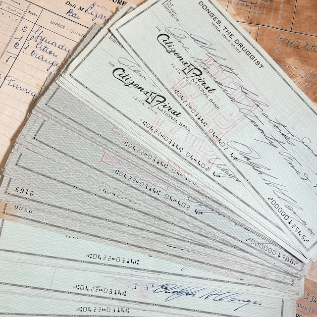 アメリカ・オハイオ州ゼニアの Citizens First National Bank 発行のヴィンテージ小切手20枚セットです。 小切手(チェック)とは、口座の持ち主が銀行に対して「この金額を受取人に支払ってください」と指示するための支払い証書です。印刷された銀行名や住所、口座番号のほか、 ・日付を書く欄 ・受取人名(Pay to the Order of)の欄 ・金額を数字で記入する欄 ・金額を英語で綴る欄 ・署名欄 などがレイアウトされており、実際の金融取引に使われていた書類ならではの整然としたデザインが特徴です。 本セットは実際に使用済みの小切手で、手書きのサインや金額、日付、銀行印や処理スタンプなどが残っています。インクのにじみや筆跡の個性が一枚ごとに異なり、当時のやり取りや生活の痕跡を感じられる一点物の紙ものです。 淡いグリーンの地模様には細かなセキュリティパターン(偽造防止のための装飾模様)が施され、クラシックなタイポグラフィと相まってとても美しい佇まいです。裏面には銀行の処理印やナンバリングが入っているものもあり、紙の質感や経年による色味の変化も魅力のひとつです。 角の擦れやシワ、小さな破れなどヴィンテージならではのダメージが含まれる場合がありますが、それも含めて古い書類の味わいとしてお楽しみいただけます。 コラージュやジャンクジャーナル、ラッピング、撮影小物、ディスプレイなど幅広くご活用いただけます。ランダムで20枚をお届けいたします(写真は一例です)。 サイズ:約21.2 × 8cm 年代:詳細不明(20世紀後半頃)