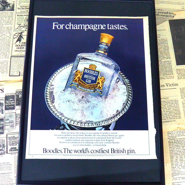 Boodlesの広告切り抜きです。 画像2枚目は裏面となっております。 Boodlesは英国発祥のジンブランドで、伝統的な製法と高級感を重んじることで知られています。厳選されたボタニカルと純粋なスピリッツを用い、独特の滑らかさと芳醇な風味を実現しています。英国の上質なクラフトマンシップを象徴するBoodlesのジンは、特に洗練された味覚を持つ消費者に愛されており、シンプルなカクテルからクラシックなマティーニまで幅広く用いられています。その品質の高さは世界でも認められており、ジン愛好家やバーテンダーからも高い評価を受けています。 広告サイズについては、 LIFE: 約34.5センチx26.5センチ エスクワイヤー: 約33センチx26.5センチ TIME: 約32センチ × 27センチ NYT(ニューヨークタイムズ): 約20.8センチ × 27.5センチ となっております!
