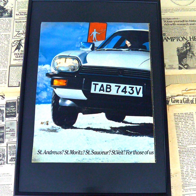 Triumphの広告切り抜きです。 画像2枚目は裏面となっております。 Triumphはイギリス発祥の自動車メーカーで、長い歴史の中で数々の名車を世に送り出してきました。スポーティかつエレガントなデザインを特徴とし、特にロードスターやスポーツカー分野で世界的に知られています。優れた走行性能と時代に合わせた先進的な技術で、欧州を中心に多くのファンを惹きつけてきました。今回の広告では、Triumph車が雪道を颯爽と走る様子が撮影されており、ドライバーの冒険心や自由なライフスタイルを象徴しています。 広告サイズについては、 LIFE: 約34.5センチx26.5センチ エスクワイヤー: 約33センチx26.5センチ TIME: 約32センチ × 27センチ NYT(ニューヨークタイムズ): 約20.8センチ × 27.5センチ となっております!