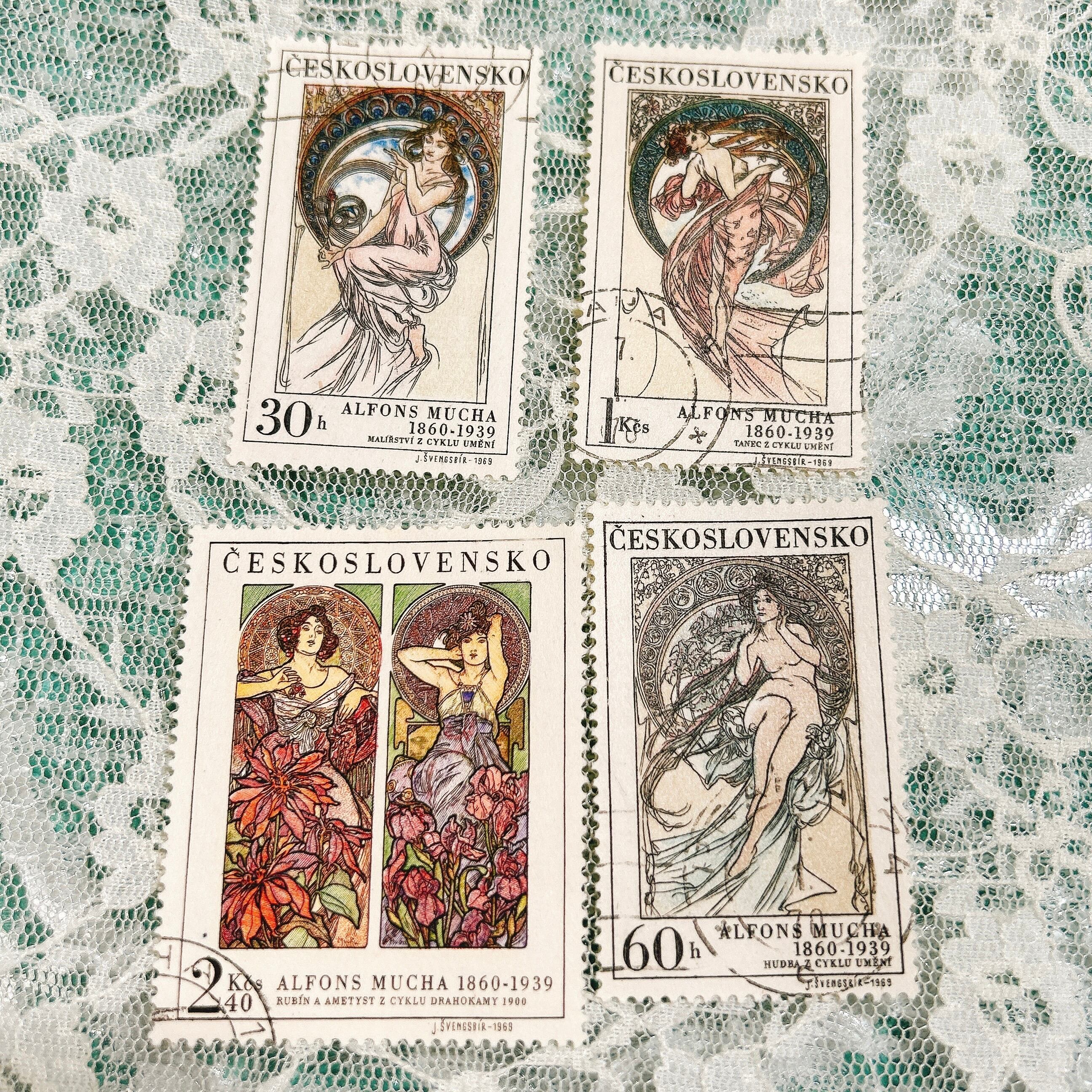 これらの切手は、1969年にチェコスロバキアで発行されたもので、当時の優れた印刷技術によってミュシャの作品の魅力を余すことなく再現しています。消印が付いたものもありますが、それもまた歴史を感じさせる味わい深い要素となっています。美術やアール・ヌーヴォーに興味のある方には特におすすめのセットであり、コレクションに加えることで、ミュシャの世界観をより身近に感じることができます。