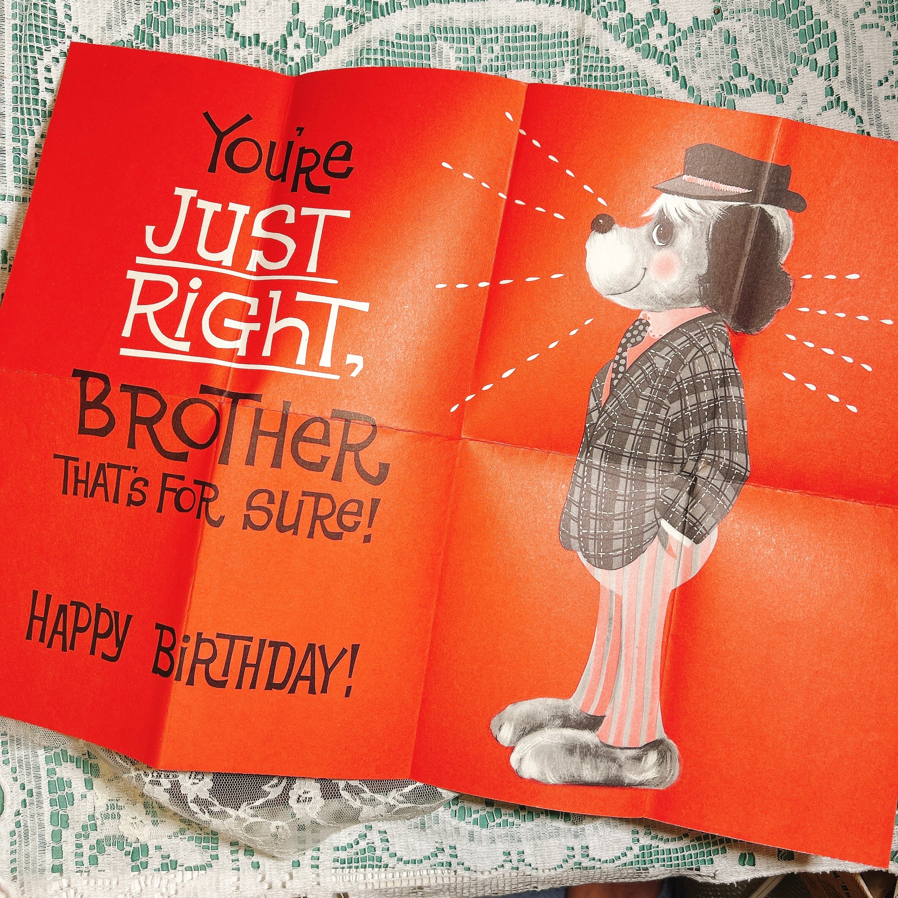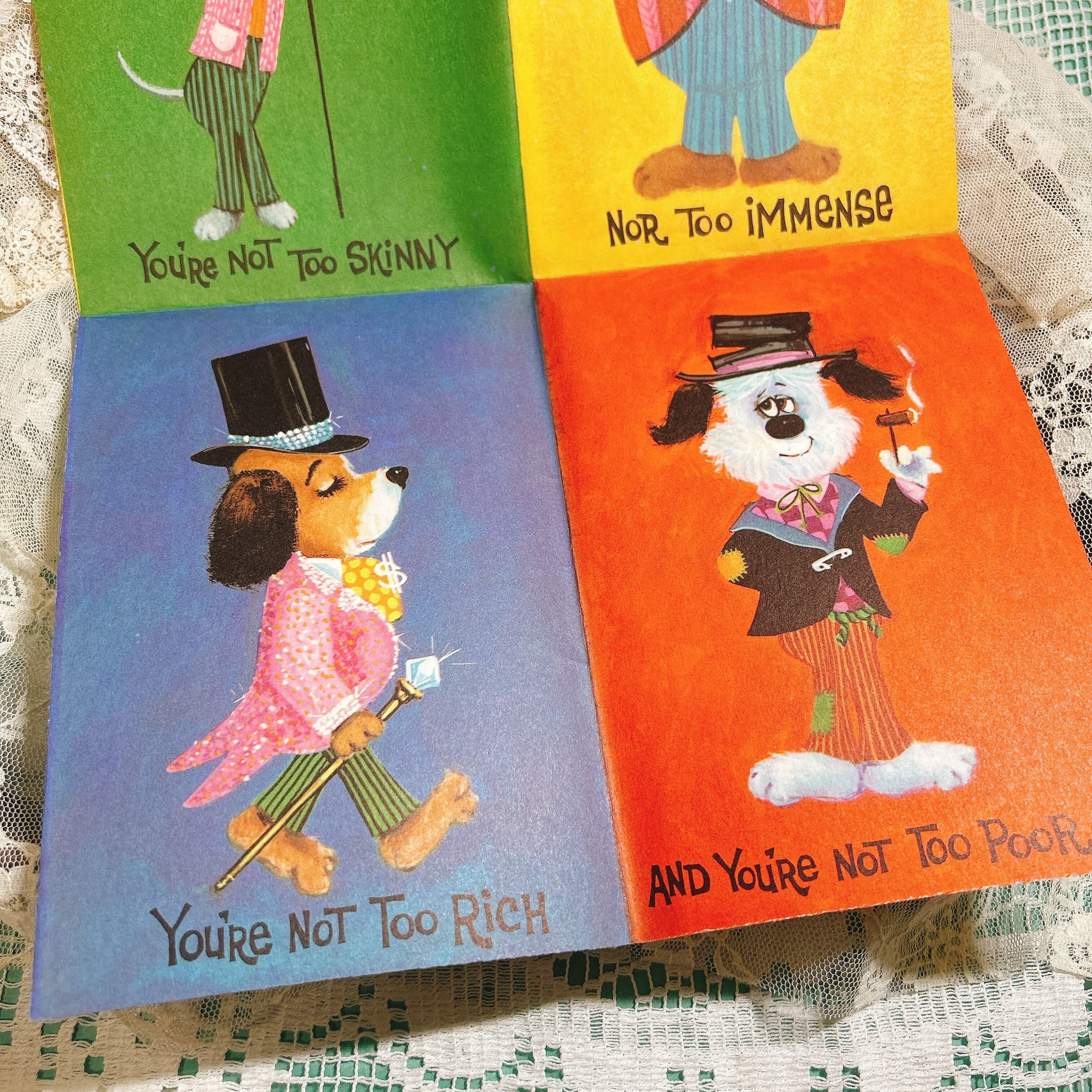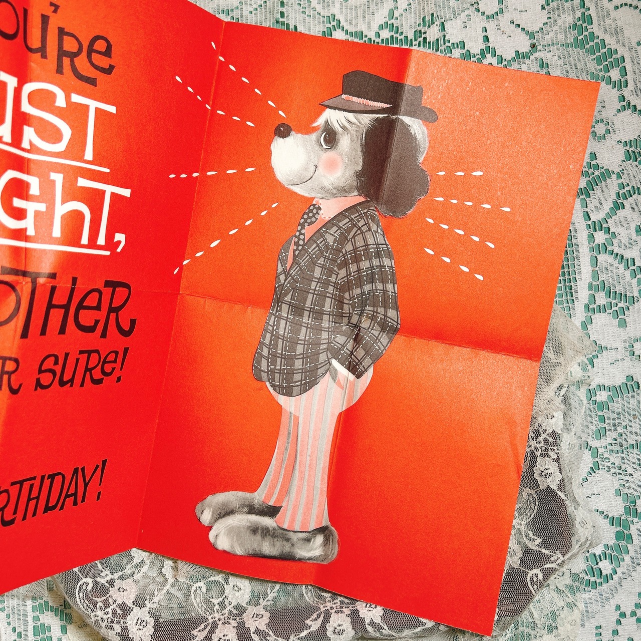 カードを開くと、色とりどりの背景にさまざまな服装をした犬たちが登場し、「You’re Not Too Skinny」「Nor Too Immense」「You’re Not Too Rich」「And You’re Not Too Poor」と続き、最終的に「You’re Just Right, Brother That is for Sure! Happy Birthday!」という心温まるメッセージで締めくくられます。カードは大きく展開するタイプで、見た目にもインパクトがあり、思わず笑みがこぼれるような構成になっています。