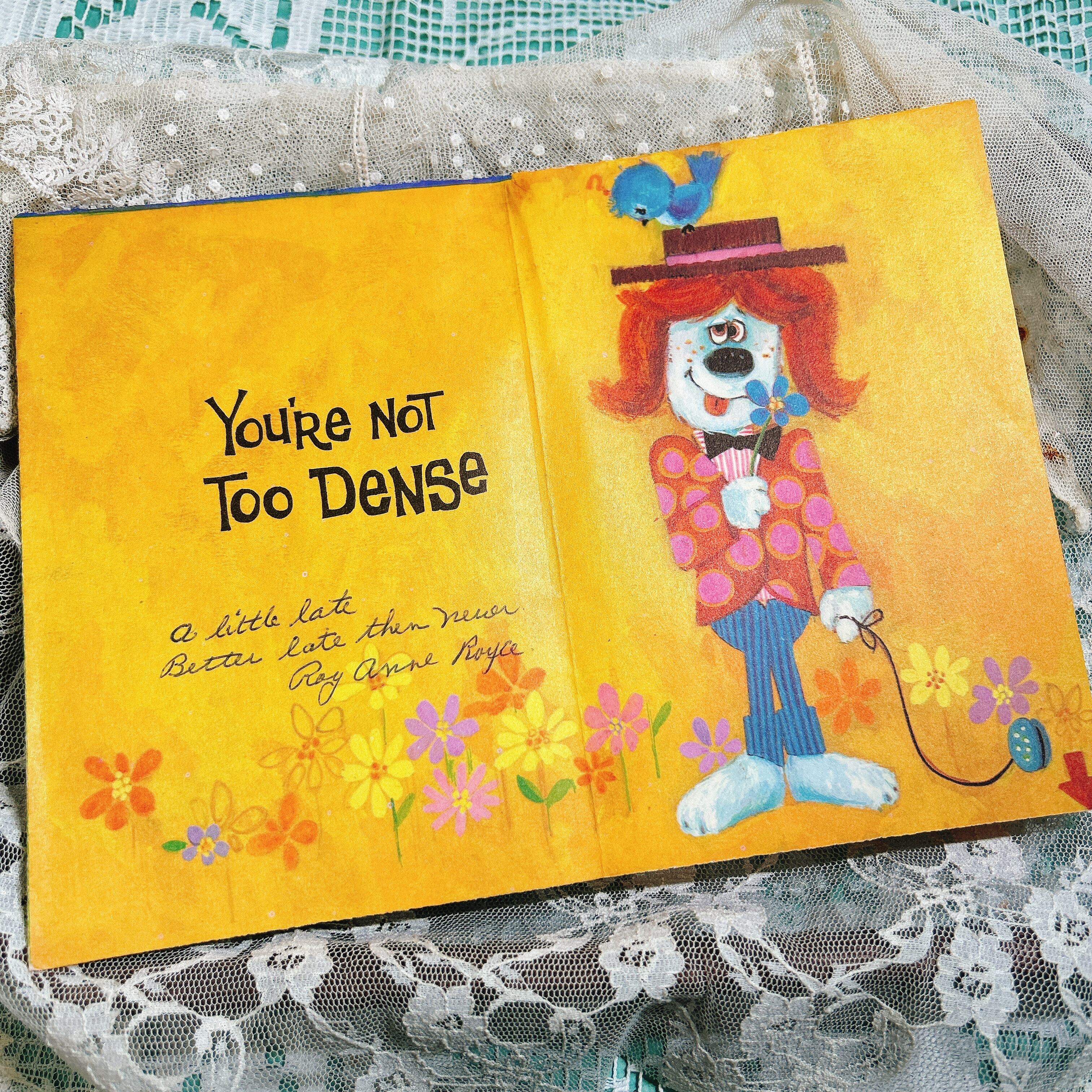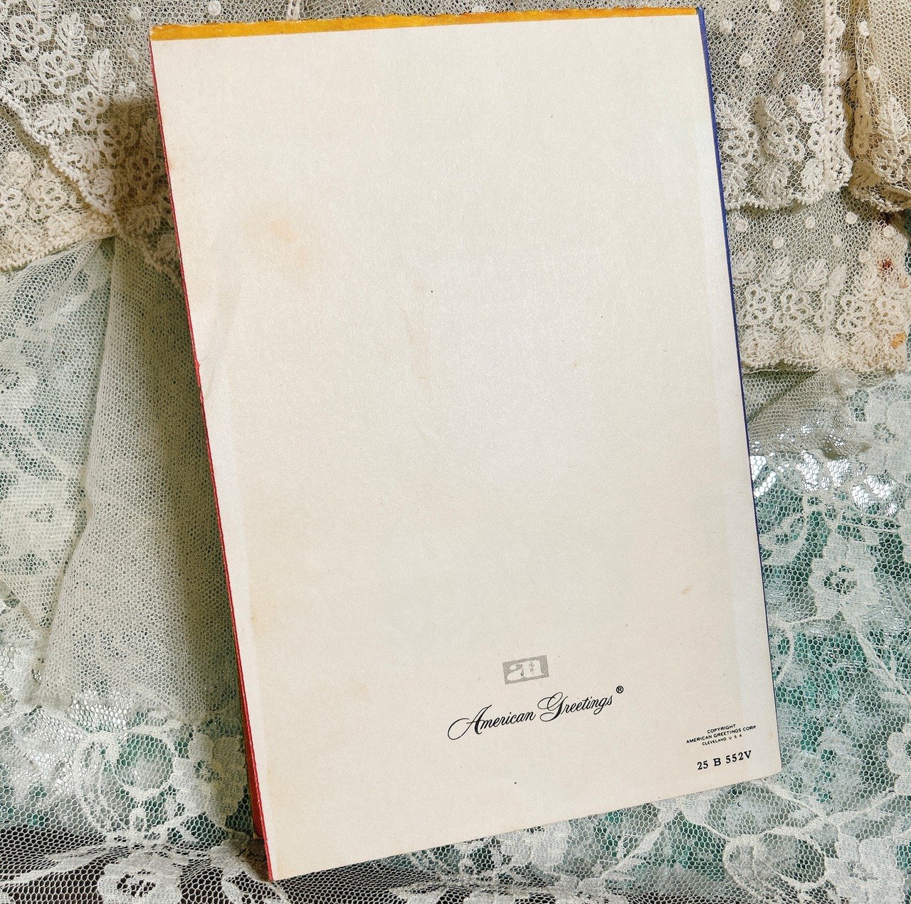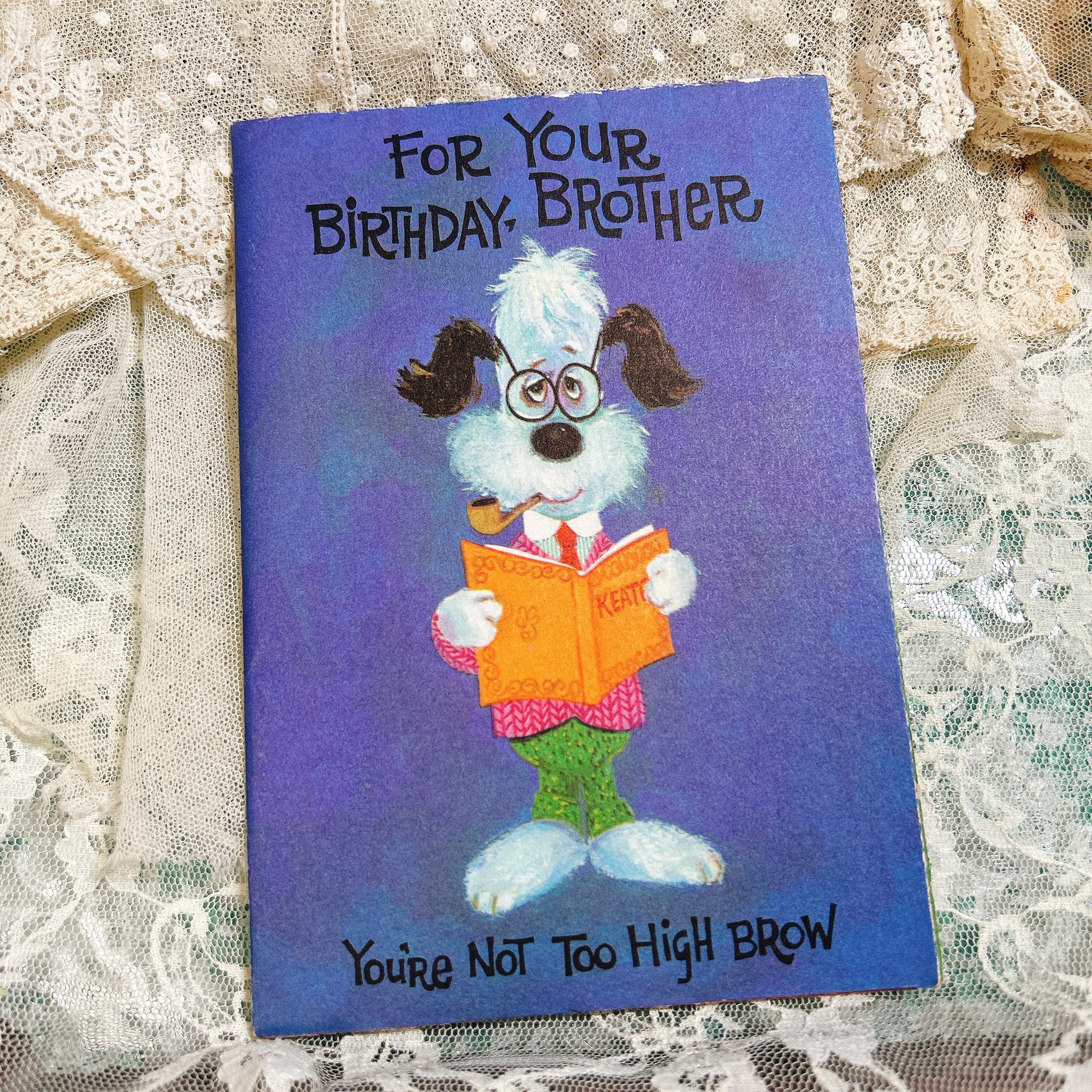 こちらは、アメリカン・グリーティングス社によって制作されたヴィンテージのバースデーカードです。ユニークで愛嬌のあるタッチのイラストが魅力で、表紙には眼鏡をかけた犬のキャラクターが登場し、「For Your Birthday, Brother」と書かれたメッセージと共に、パイプをくわえ詩集を読むユーモラスな姿が描かれています。犬が手にしている本のタイトルは“KEATS”となっており、文学好きな兄弟へのちょっとした皮肉と愛情が込められた構成になっています。