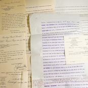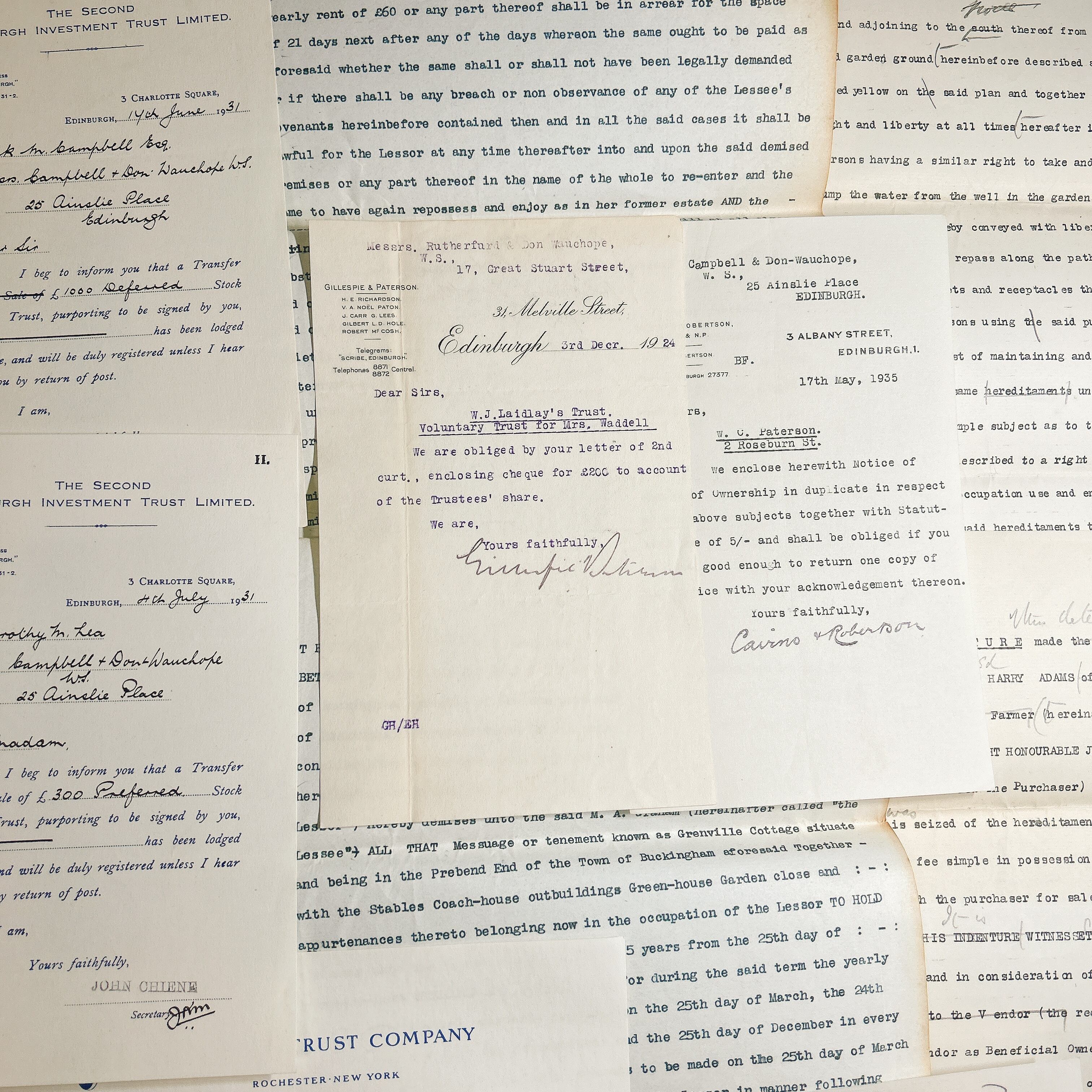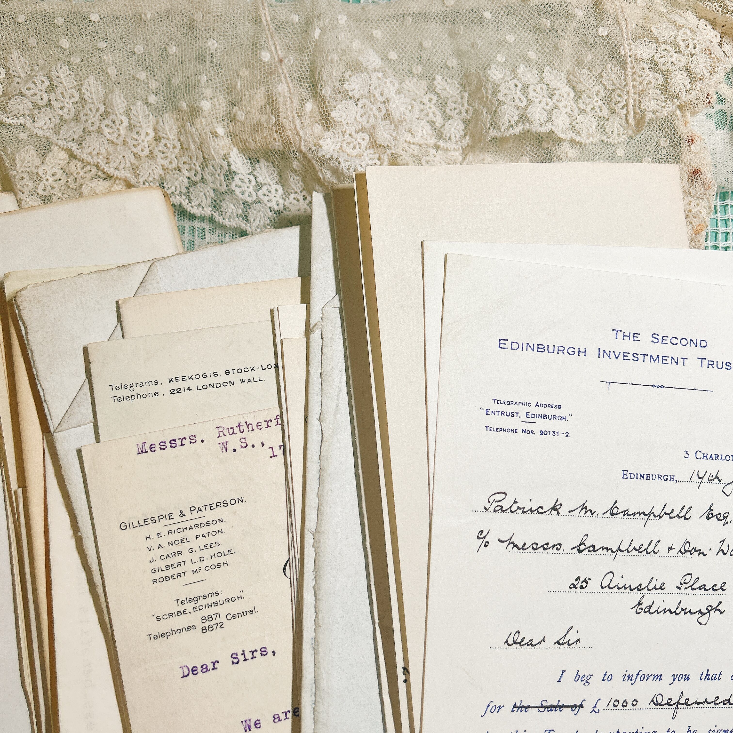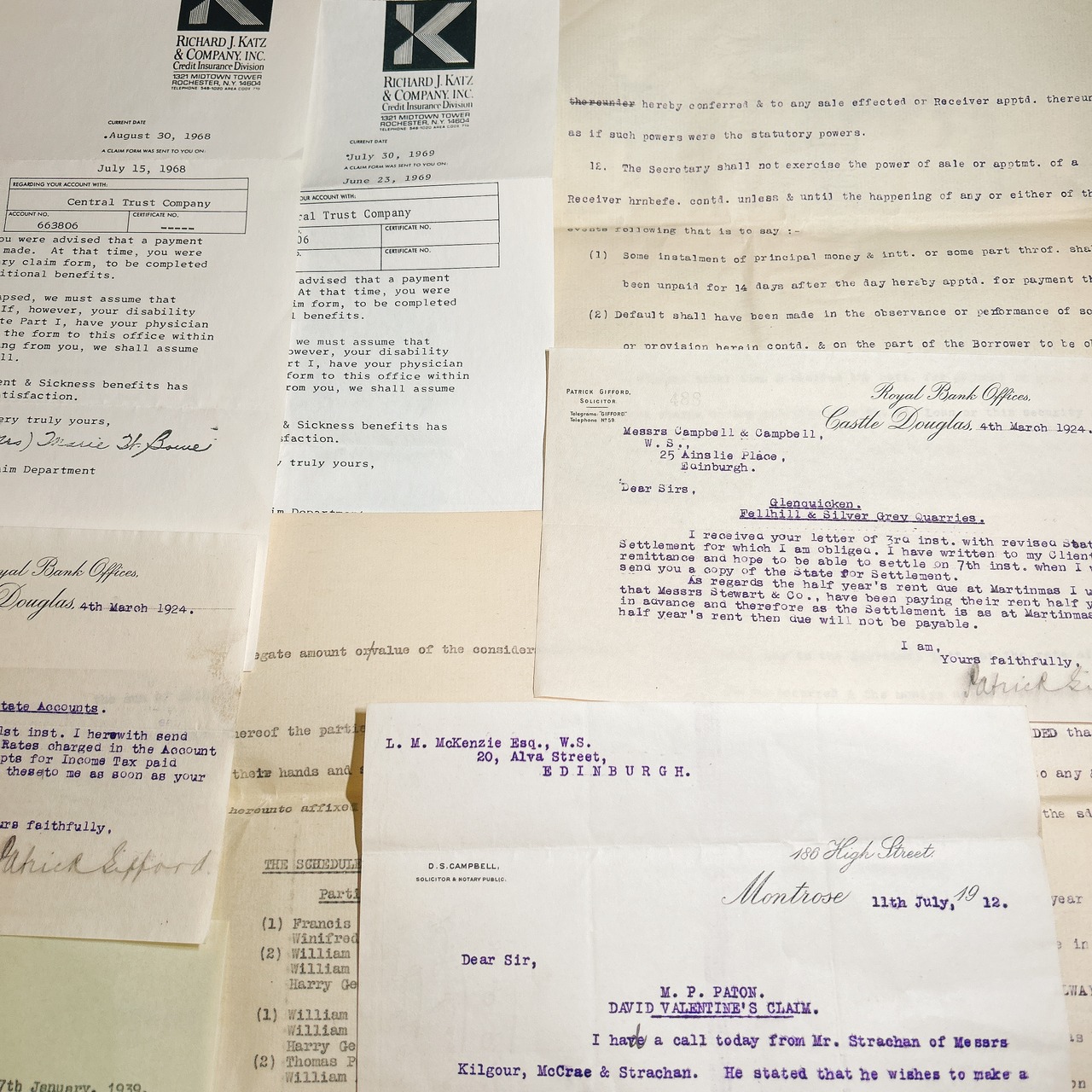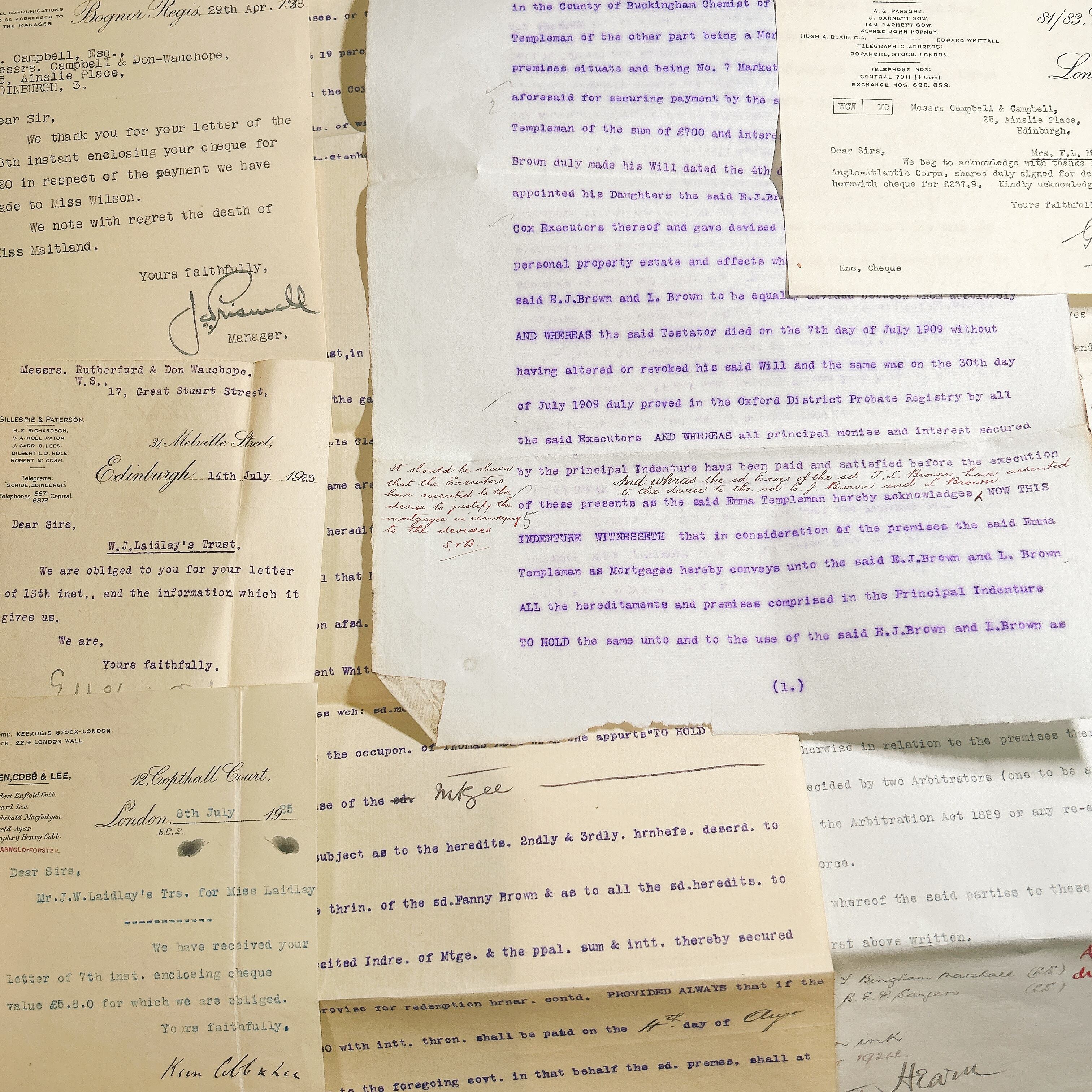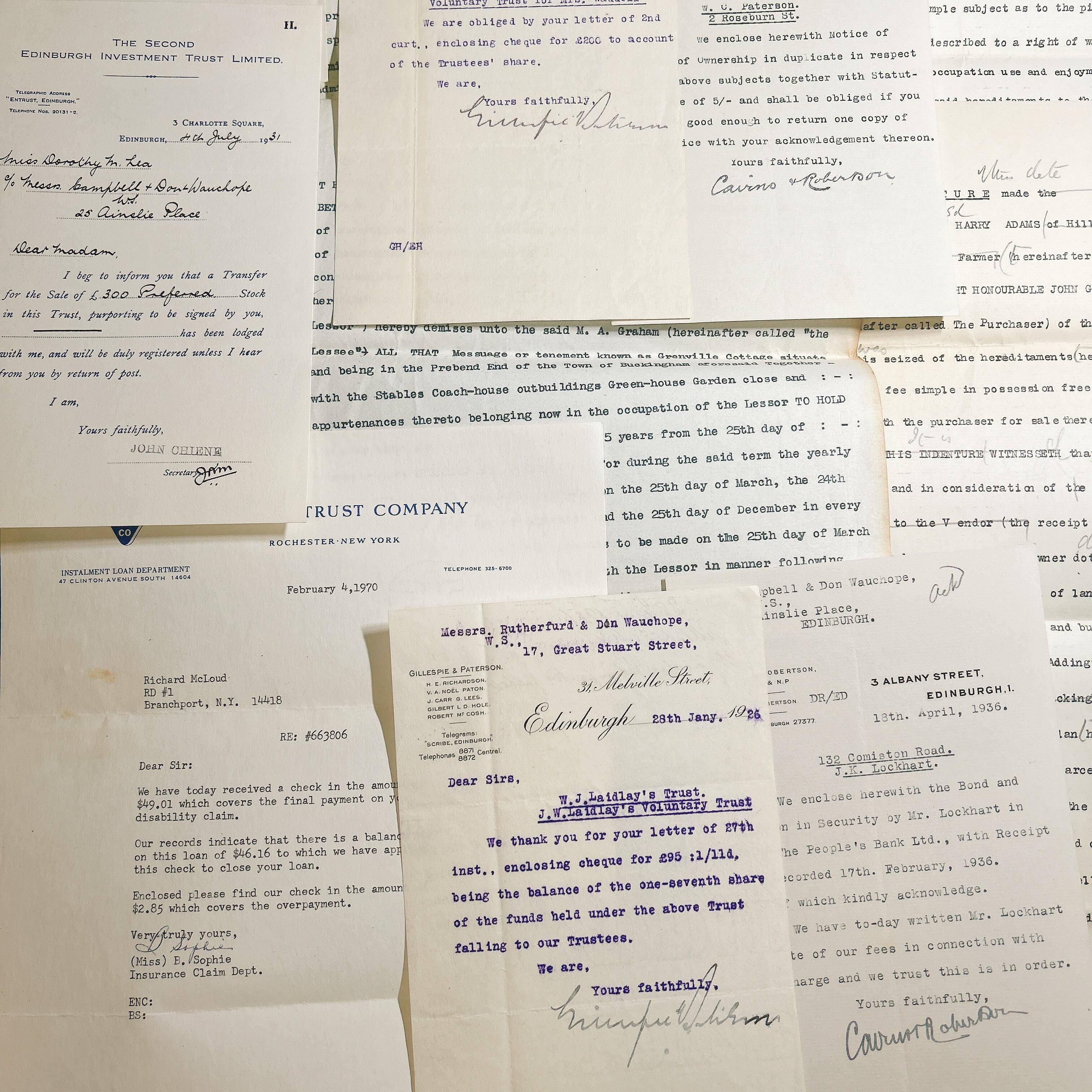 書類の内容は、法律文書や契約書、ビジネスレター、領収書、事務処理に関する記録など、多岐にわたります。いずれも英語で書かれており、手書きの補足や訂正が加えられているものも含まれています。中には青や赤のインクで書き込まれたコメントが見られ、当時の業務がどのように進められていたのかを知る手がかりとなります。手書きの筆跡は、今ではあまり見られなくなった独特の流麗な文字が特徴的で、アンティークの魅力をより一層引き立てています。
