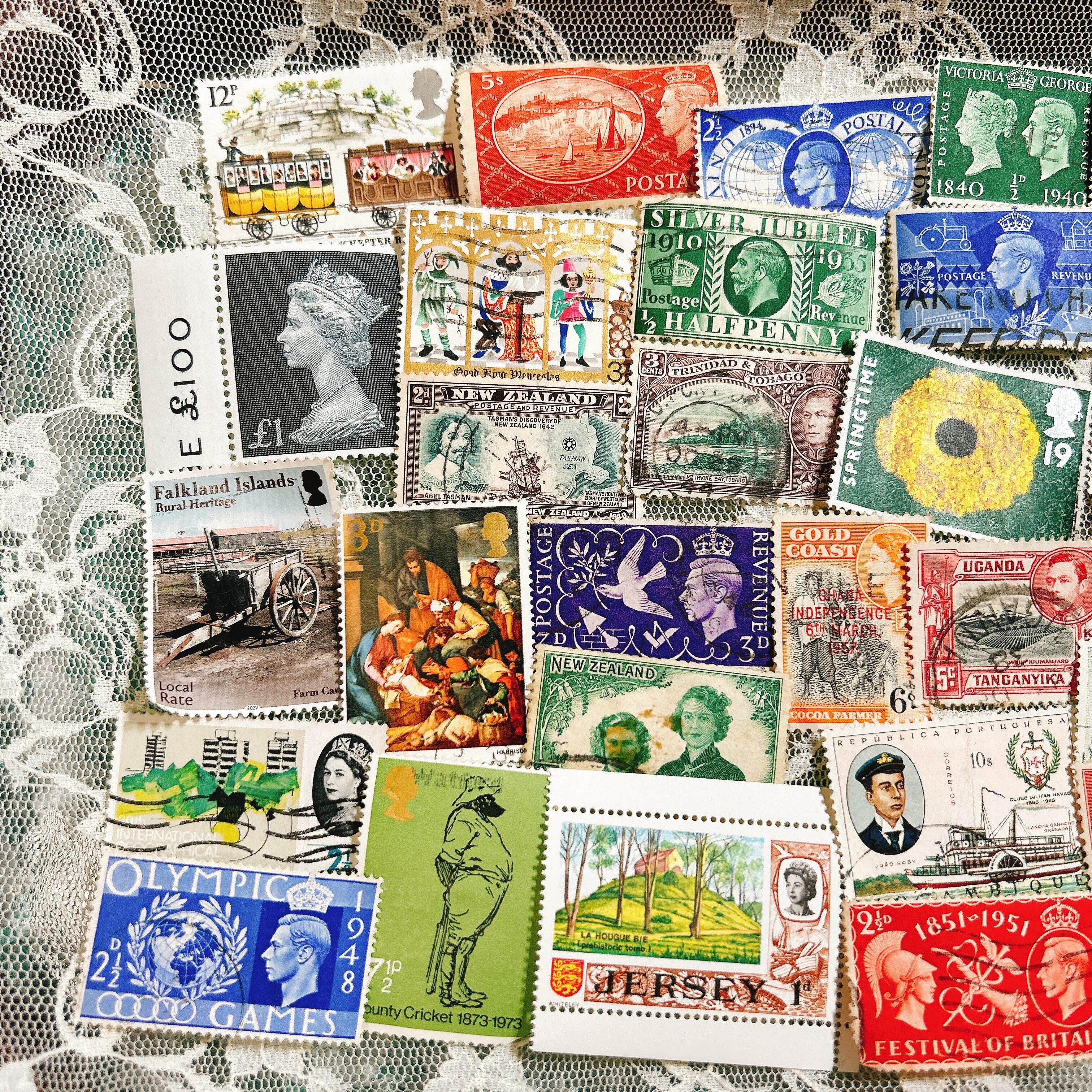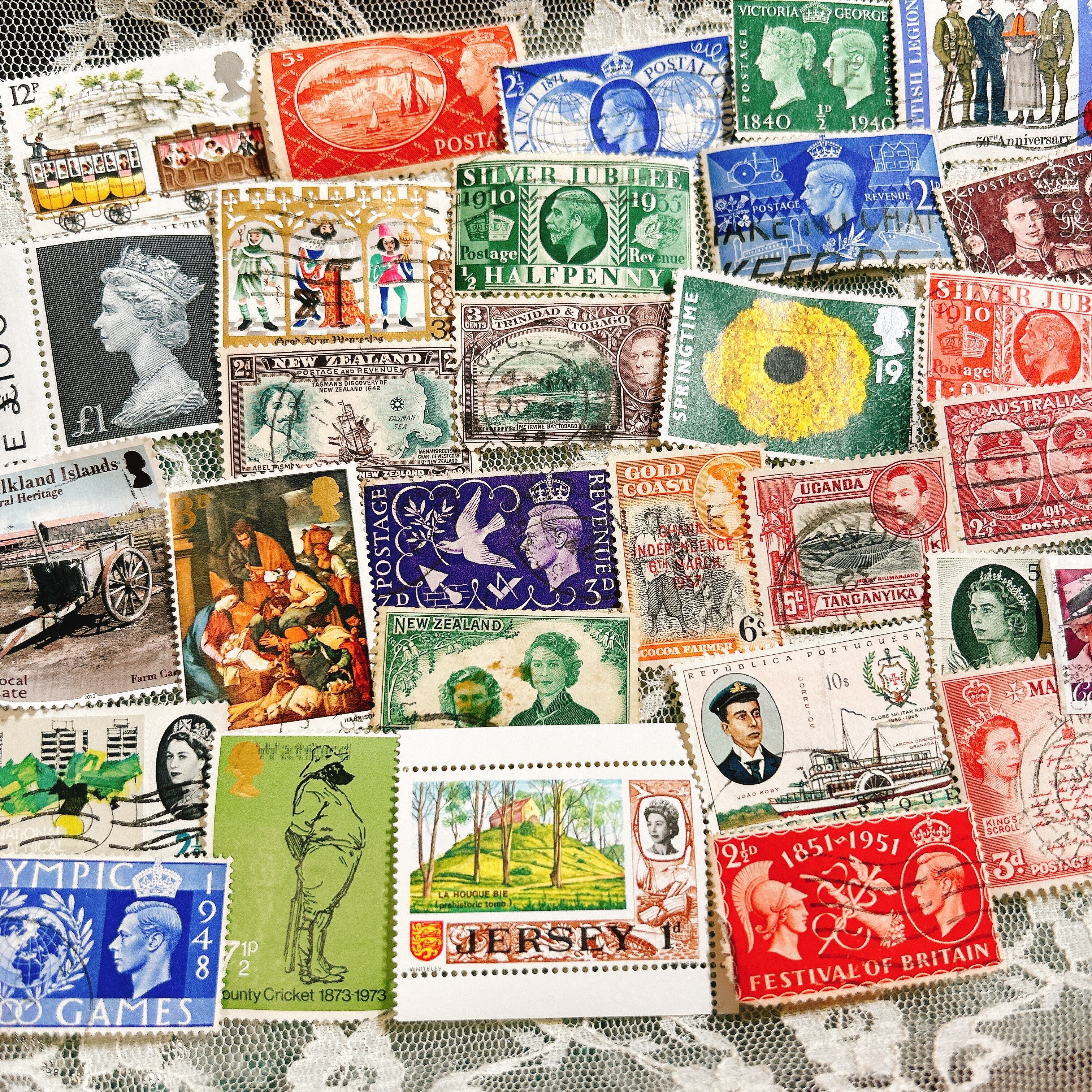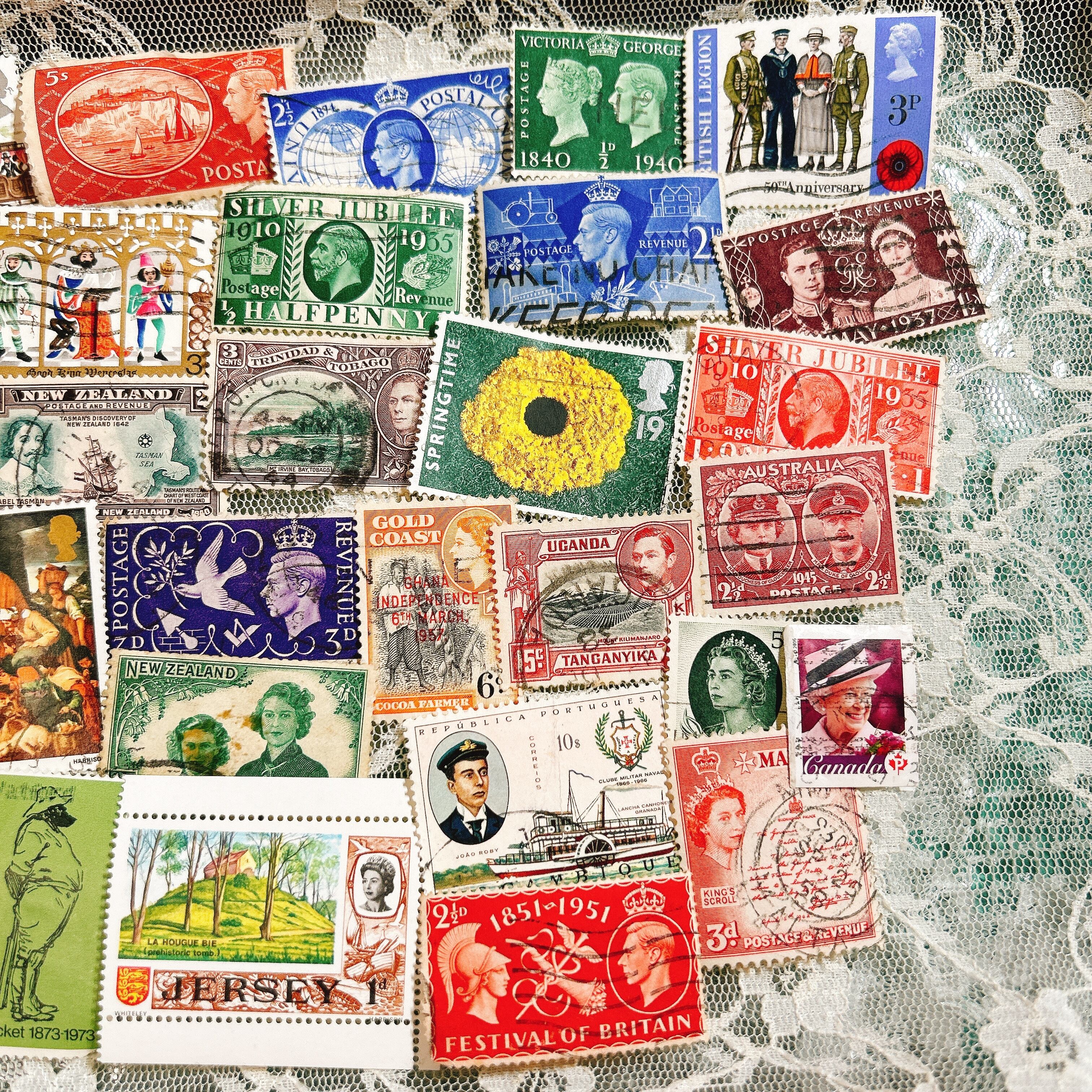 すべて使用済みのため消印が施されており、年月を経た風合いがヴィンテージの趣を引き立てています。切手の色彩は赤、青、緑、紫など多彩で、コレクションとしてはもちろん、ジャンクジャーナルやおすそ分けファイルの装飾にもおすすめです。消印のデザインや場所もそれぞれ異なるため、一枚一枚に個性を感じられる点が魅力的です。