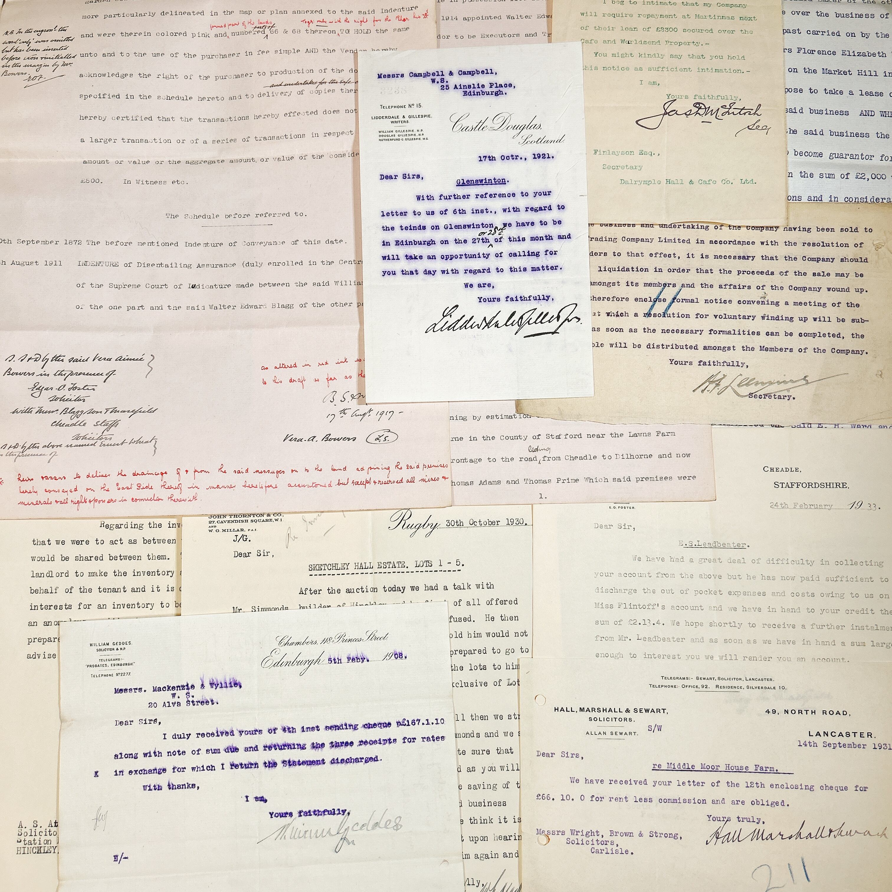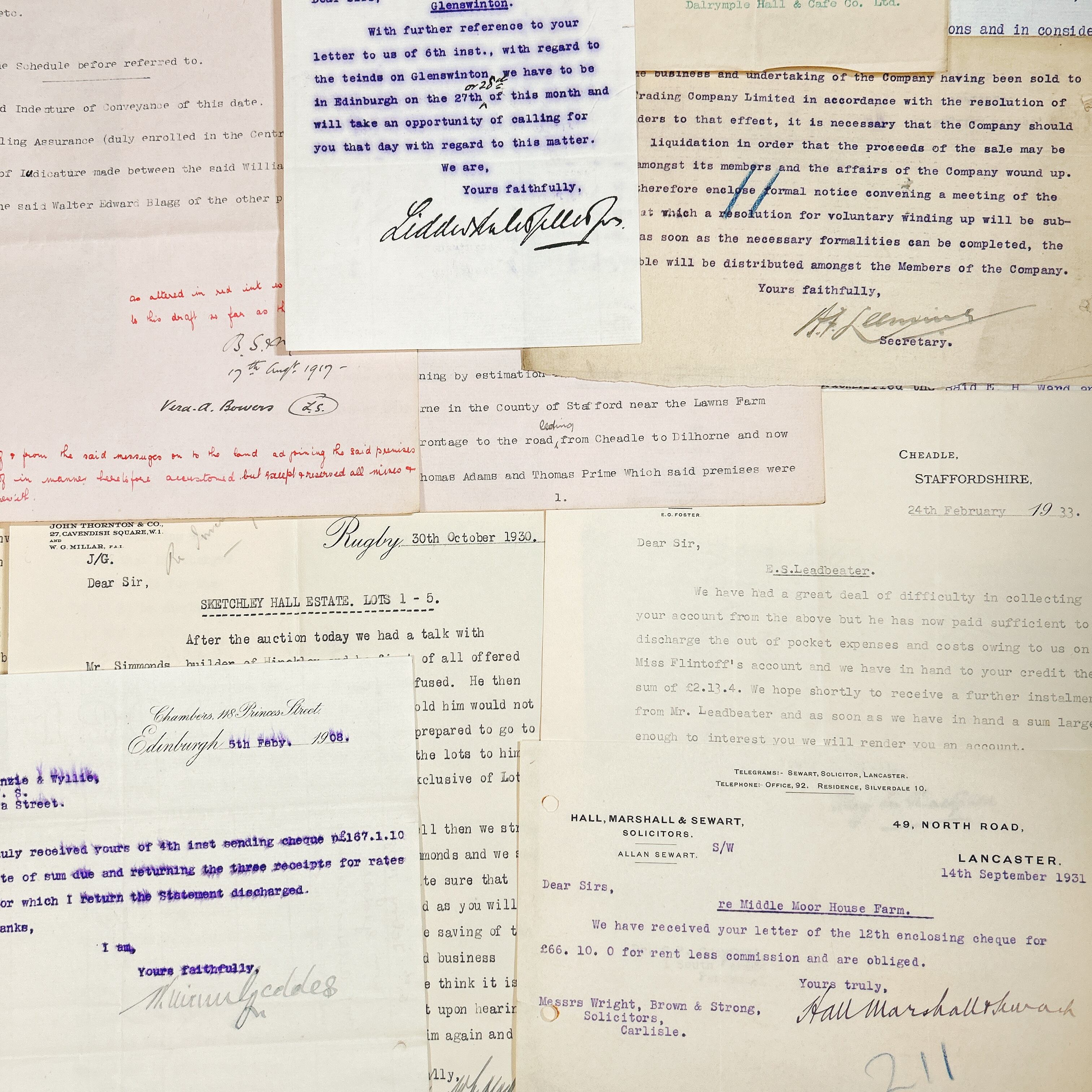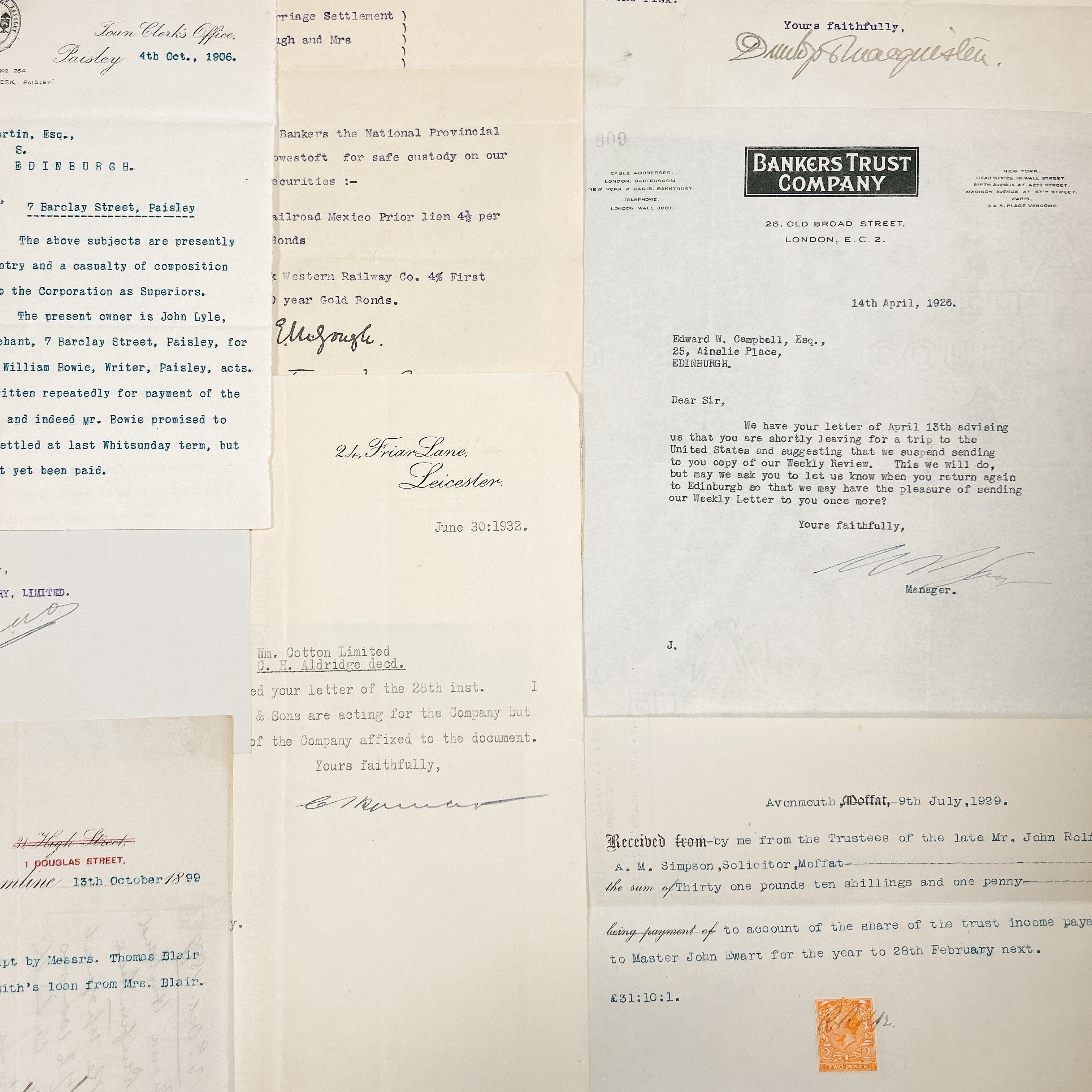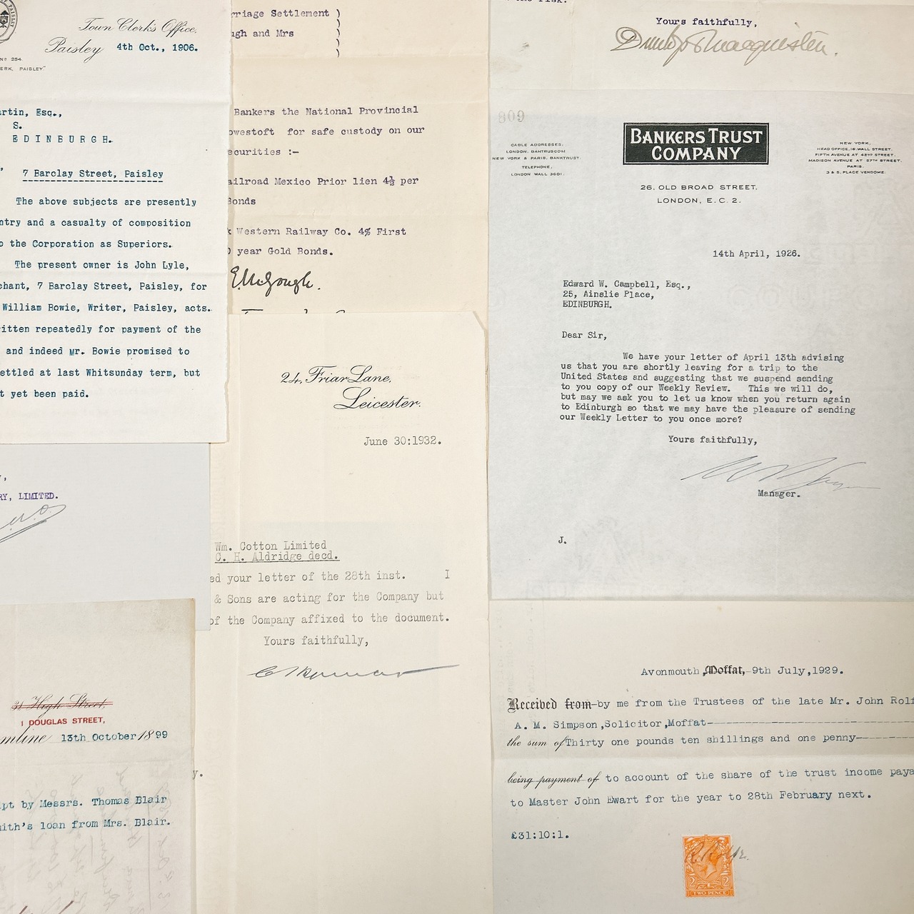 書類の内容は、法律文書や契約書、ビジネスレター、領収書、事務処理に関する記録など、多岐にわたります。いずれも英語で書かれており、手書きの補足や訂正が加えられているものも含まれています。中には青や赤のインクで書き込まれたコメントが見られ、当時の業務がどのように進められていたのかを知る手がかりとなります。手書きの筆跡は、今ではあまり見られなくなった独特の流麗な文字が特徴的で、アンティークの魅力をより一層引き立てています。