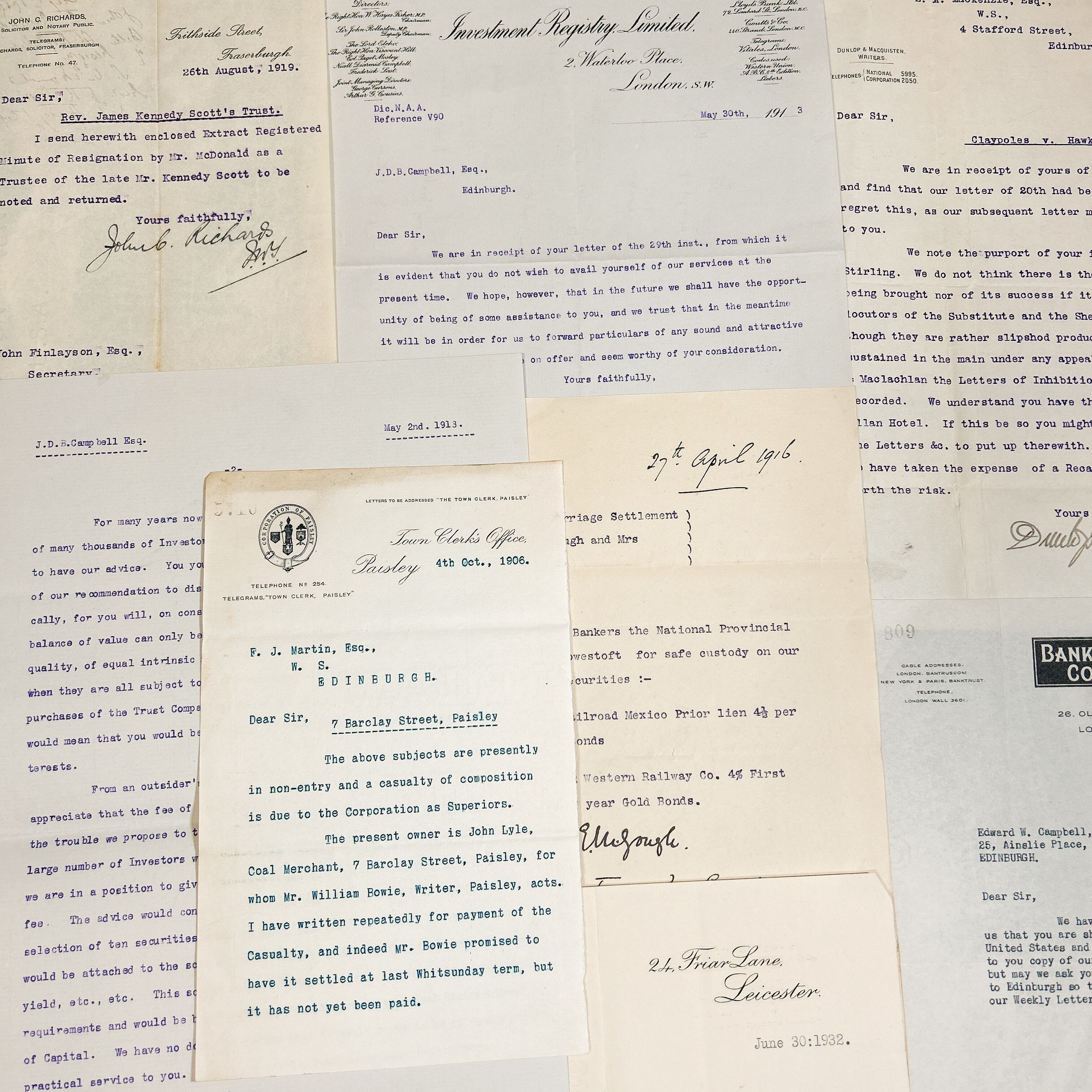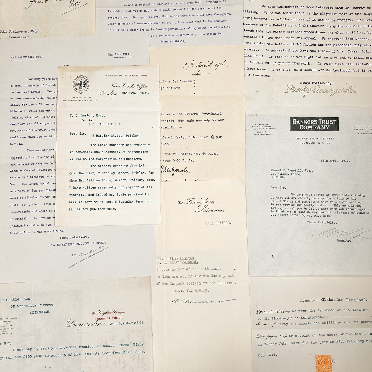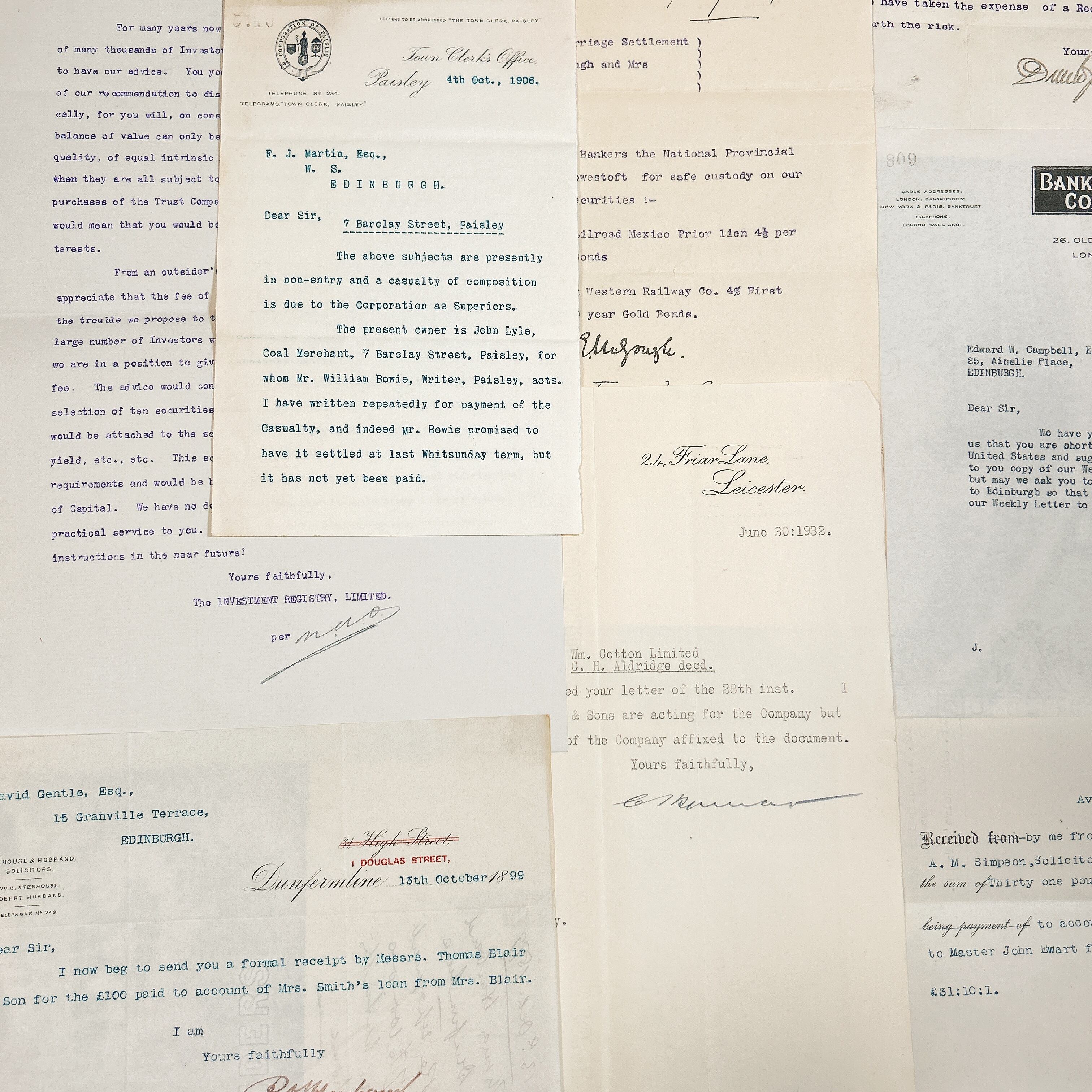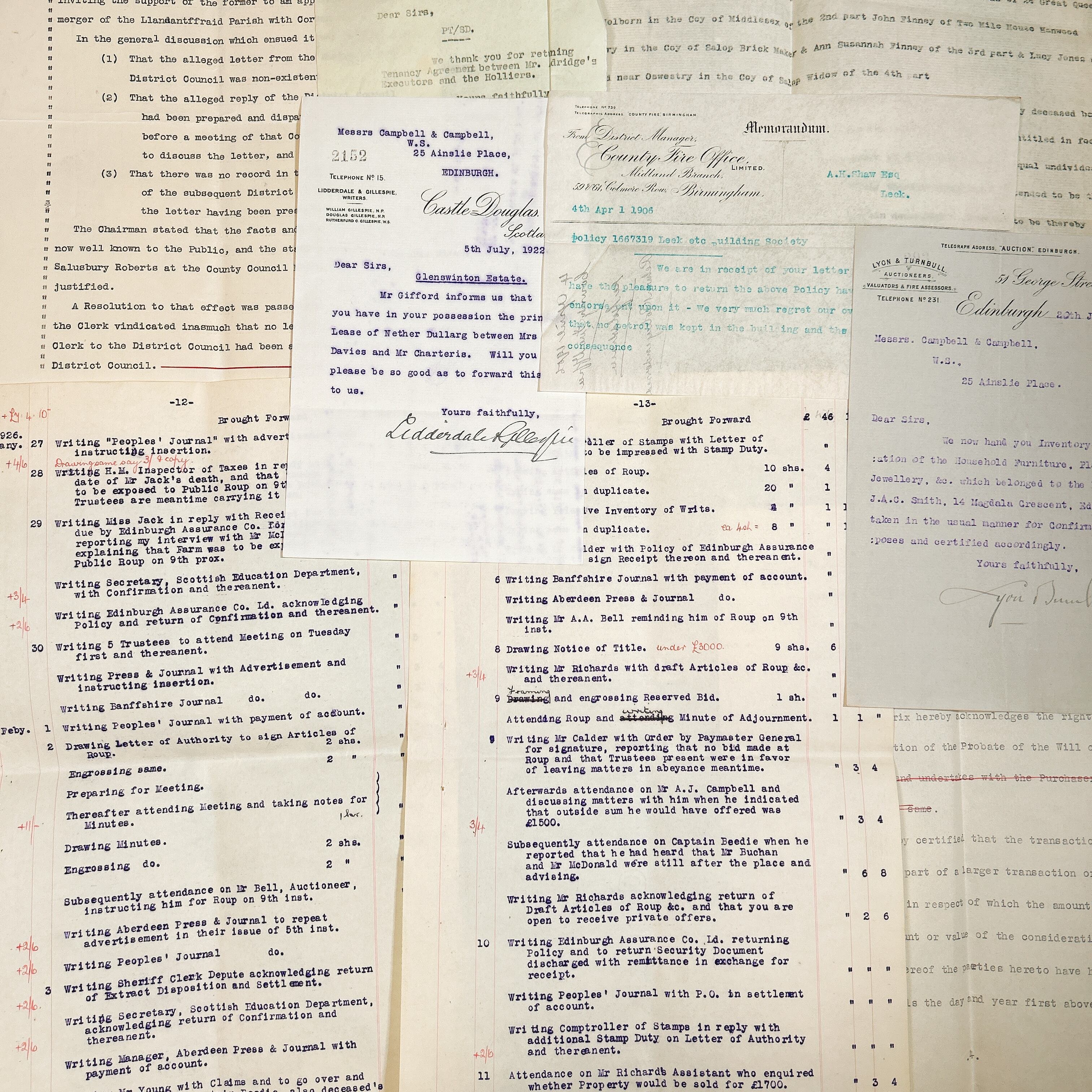 書類の内容は、法律文書や契約書、ビジネスレター、領収書、事務処理に関する記録など、多岐にわたります。いずれも英語で書かれており、手書きの補足や訂正が加えられているものも含まれています。中には青や赤のインクで書き込まれたコメントが見られ、当時の業務がどのように進められていたのかを知る手がかりとなります。手書きの筆跡は、今ではあまり見られなくなった独特の流麗な文字が特徴的で、アンティークの魅力をより一層引き立てています。