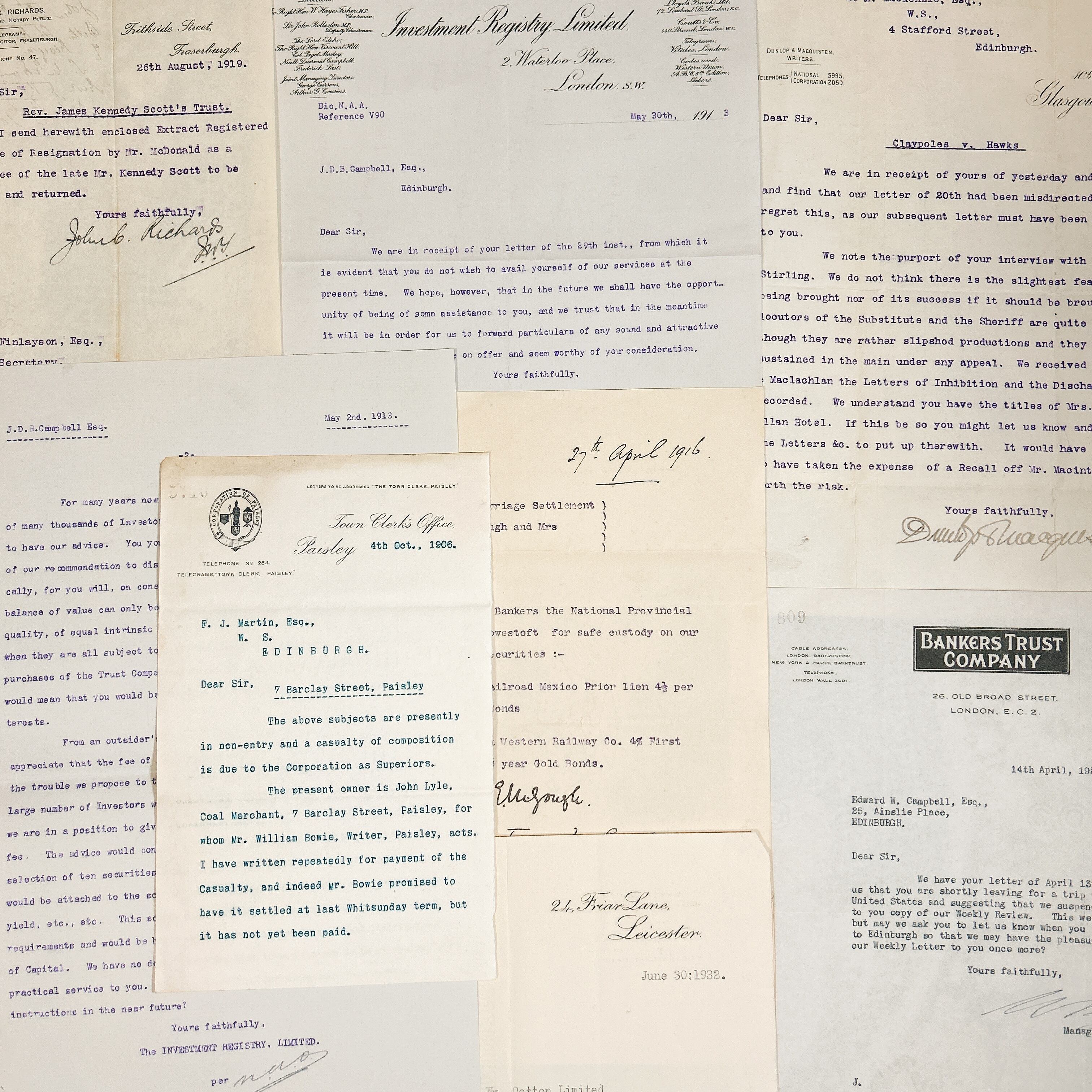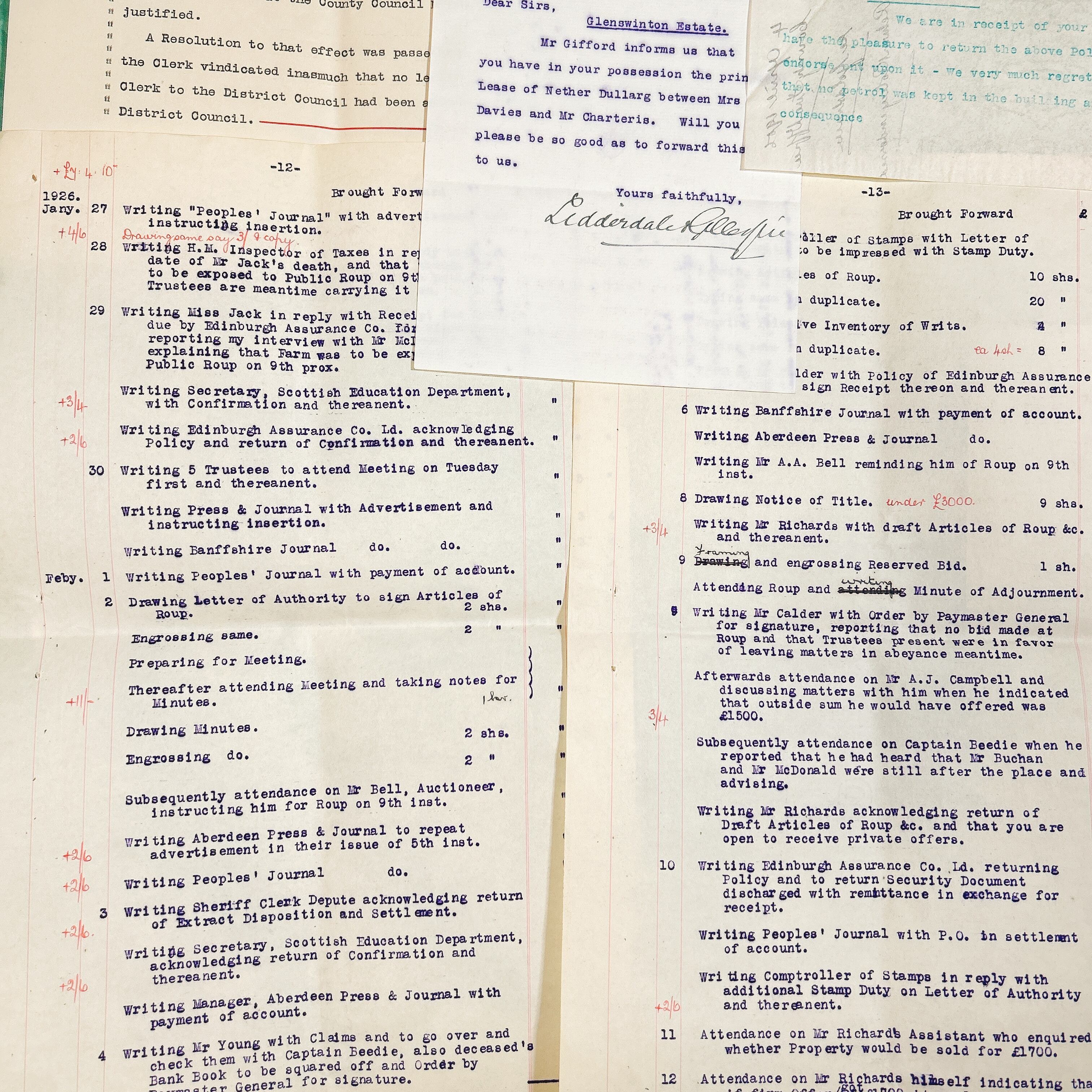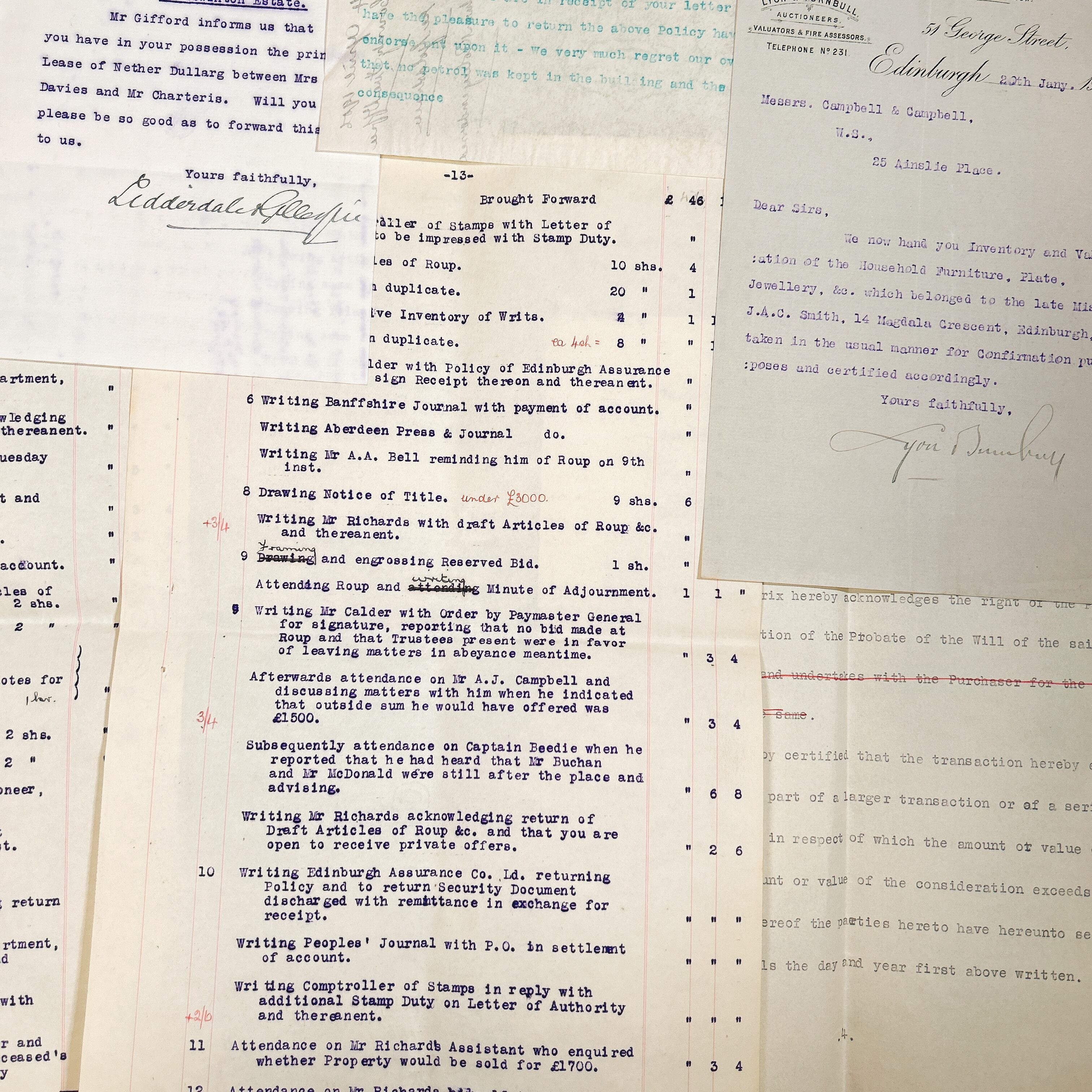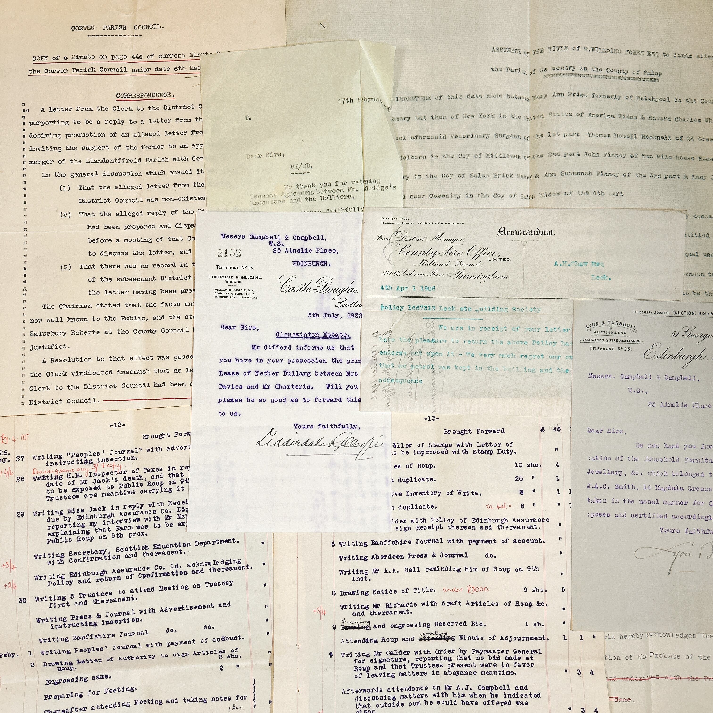 書類の内容は、法律文書や契約書、ビジネスレター、領収書、事務処理に関する記録など、多岐にわたります。いずれも英語で書かれており、手書きの補足や訂正が加えられているものも含まれています。中には青や赤のインクで書き込まれたコメントが見られ、当時の業務がどのように進められていたのかを知る手がかりとなります。手書きの筆跡は、今ではあまり見られなくなった独特の流麗な文字が特徴的で、アンティークの魅力をより一層引き立てています。