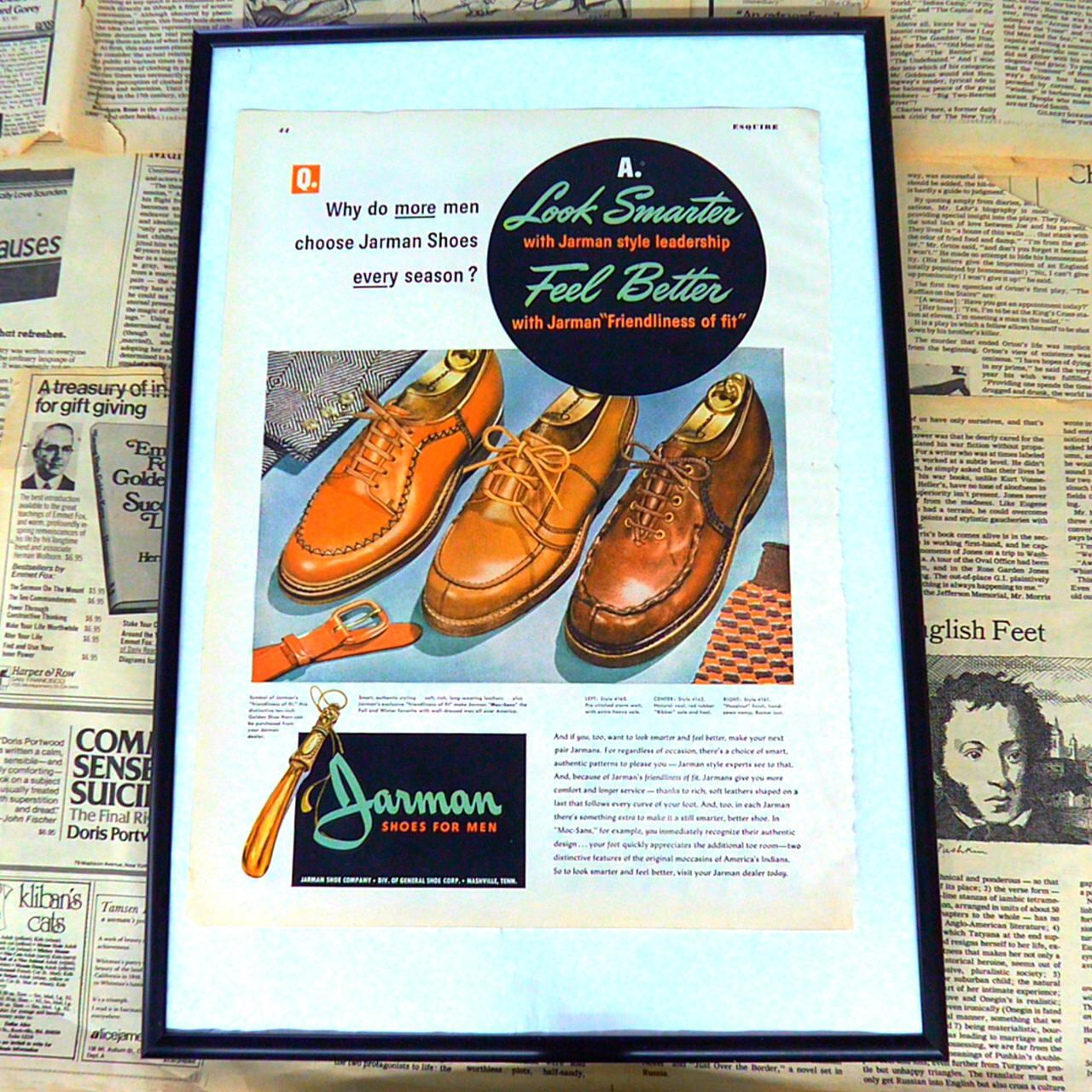 Jarman Shoesは、スタイルとフィット感を重視する男性向けの靴を提供する企業です。洗練されたデザインと快適さを兼ね備えた靴を通して、男性たちに自信を与えることを目指しています。長い歴史を持ち、その経験と技術に基づいて高品質な製品を作り上げています。Jarman Shoesは、優れたフィット感とスタイルのリーダーシップを強調し、毎シーズン多くの男性に選ばれています。 広告 ESQUIRE誌 アメリカ ヴィンテージ ポスター インテリア