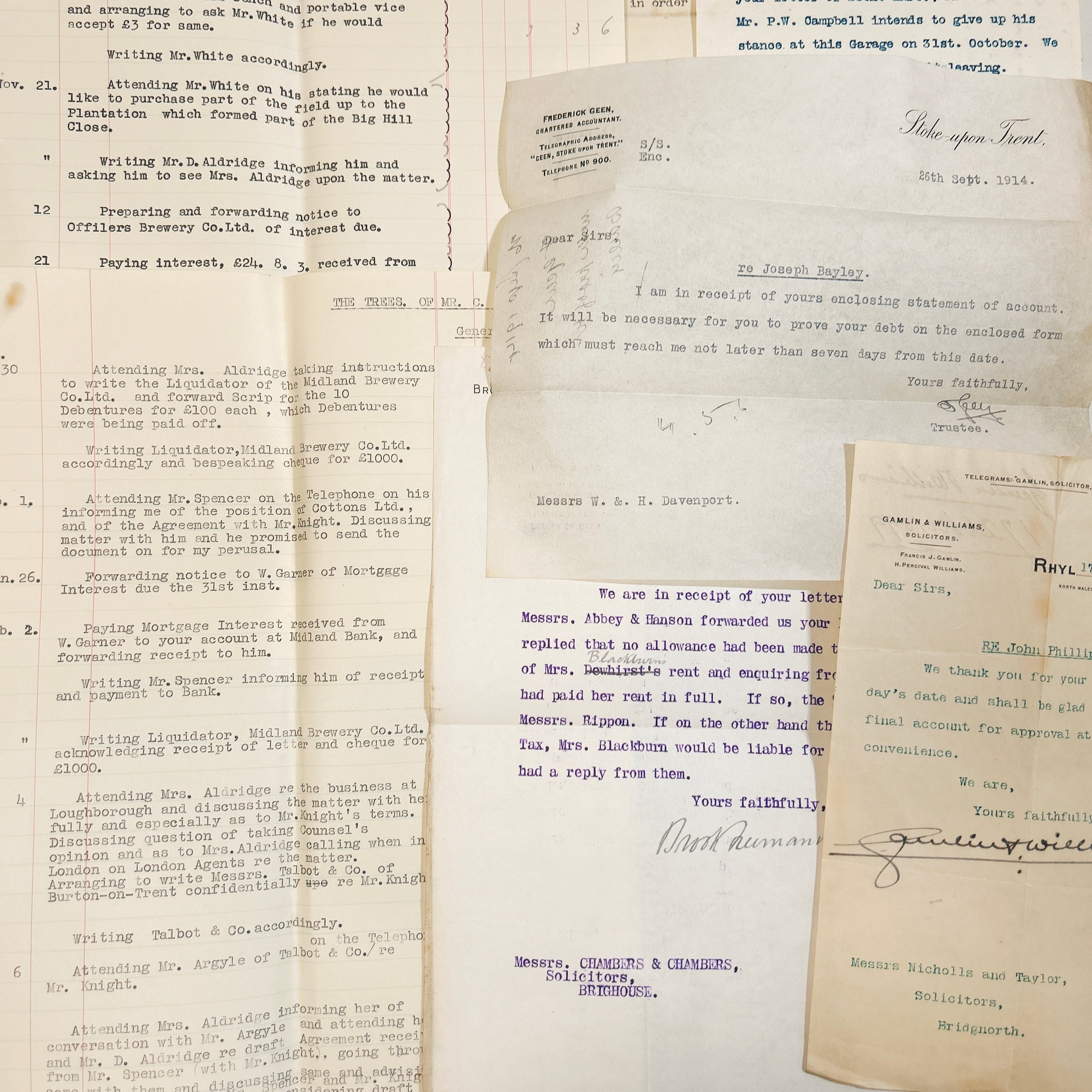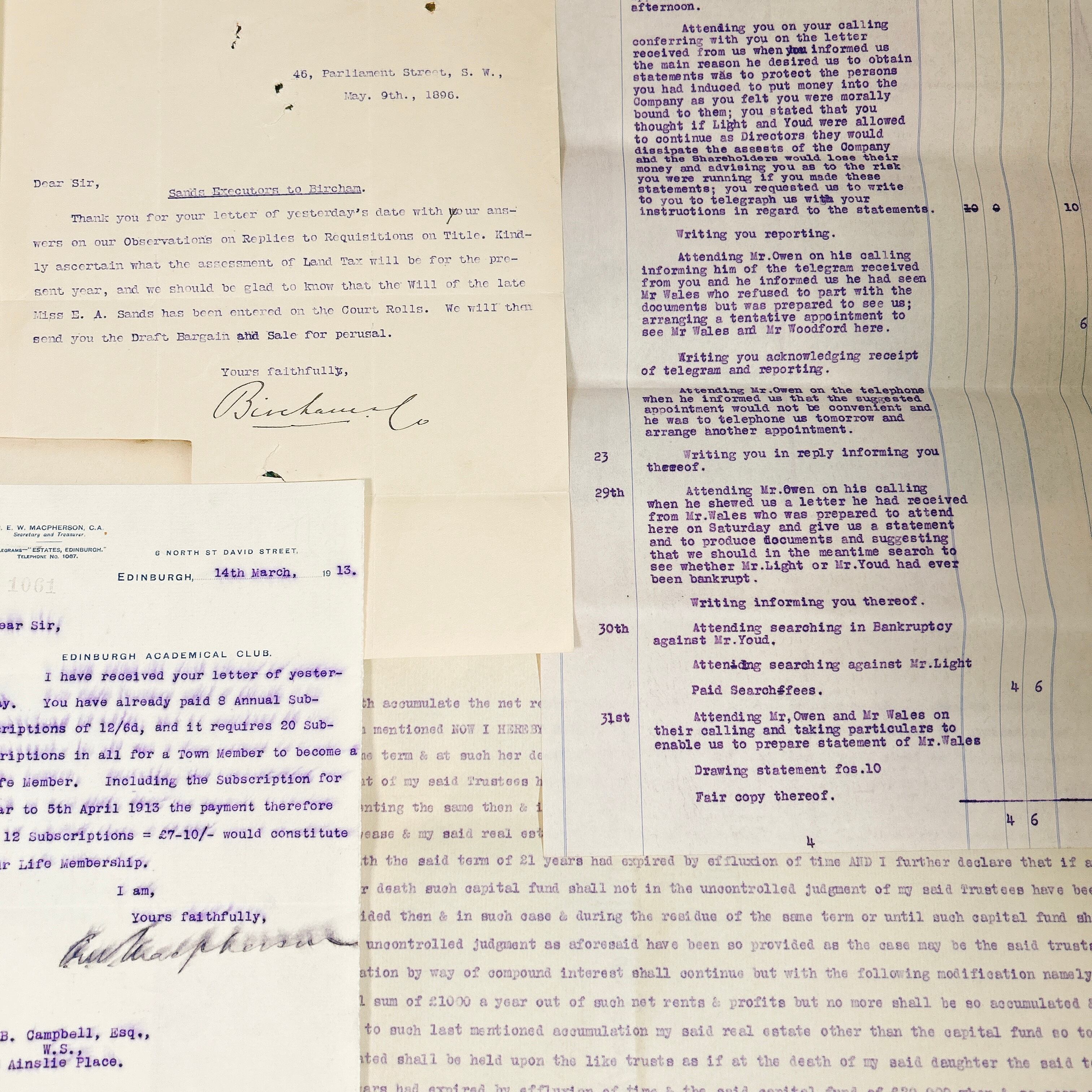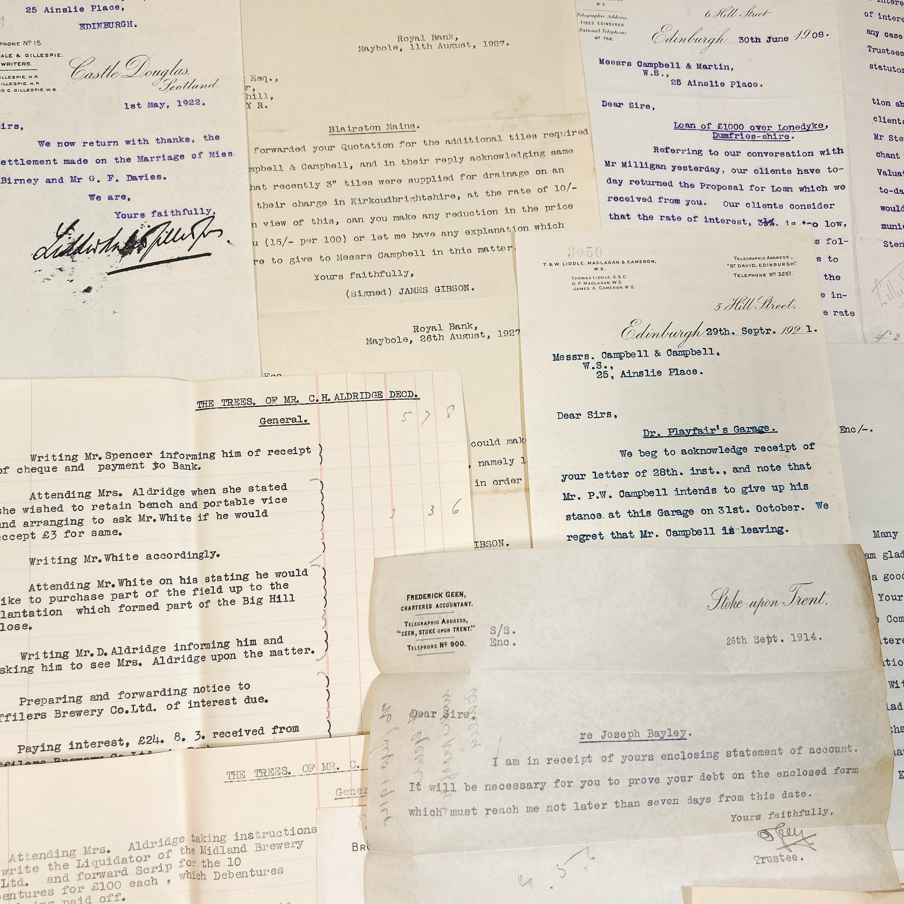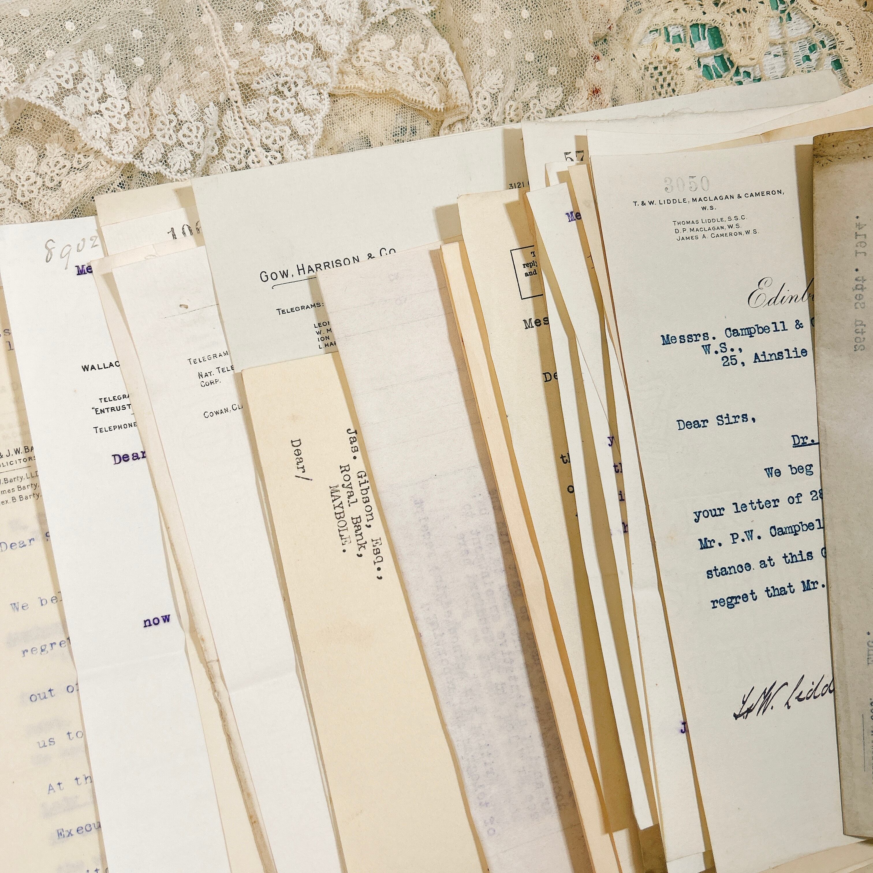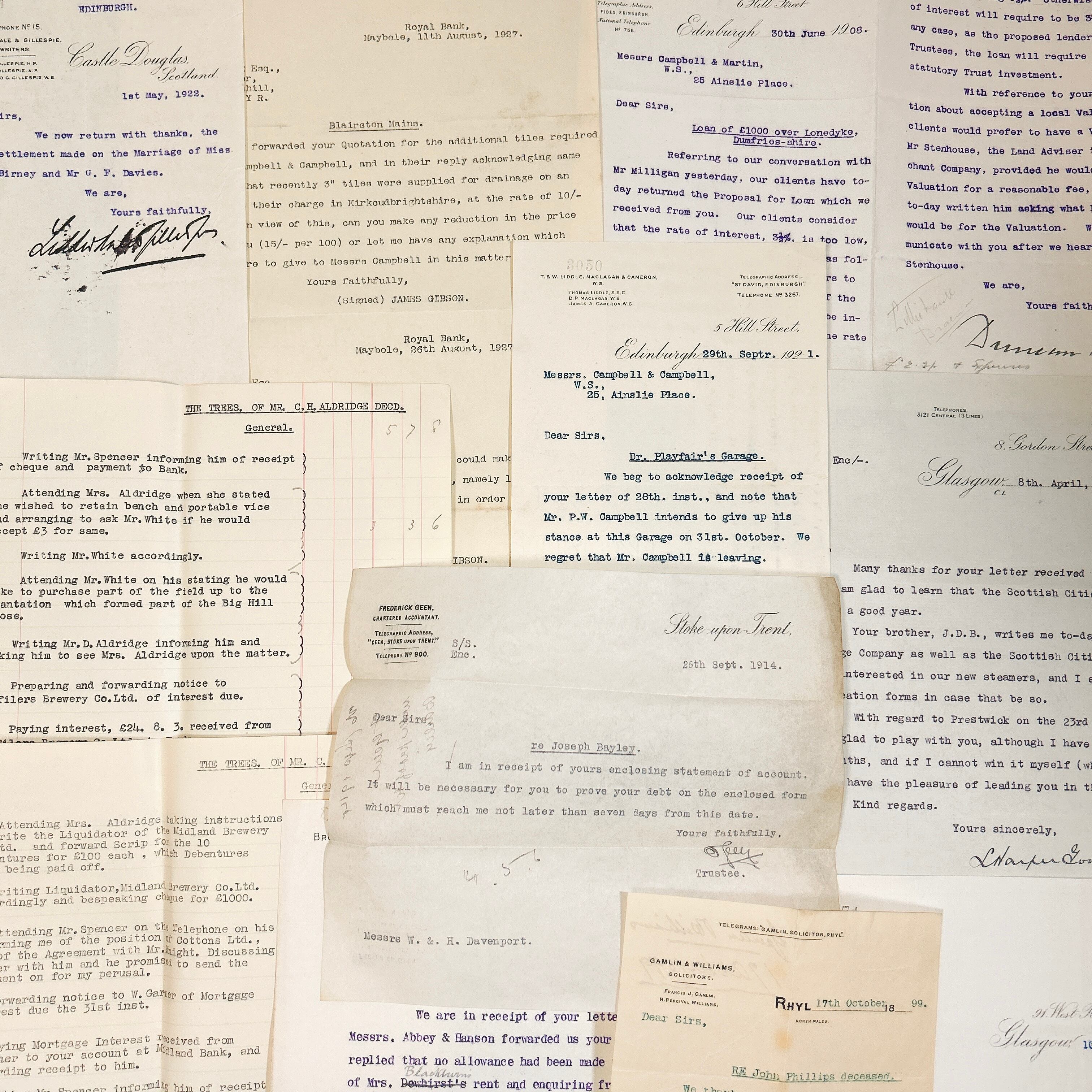 書類の内容は、法律文書や契約書、ビジネスレター、領収書、事務処理に関する記録など、多岐にわたります。いずれも英語で書かれており、手書きの補足や訂正が加えられているものも含まれています。中には青や赤のインクで書き込まれたコメントが見られ、当時の業務がどのように進められていたのかを知る手がかりとなります。手書きの筆跡は、今ではあまり見られなくなった独特の流麗な文字が特徴的で、アンティークの魅力をより一層引き立てています。