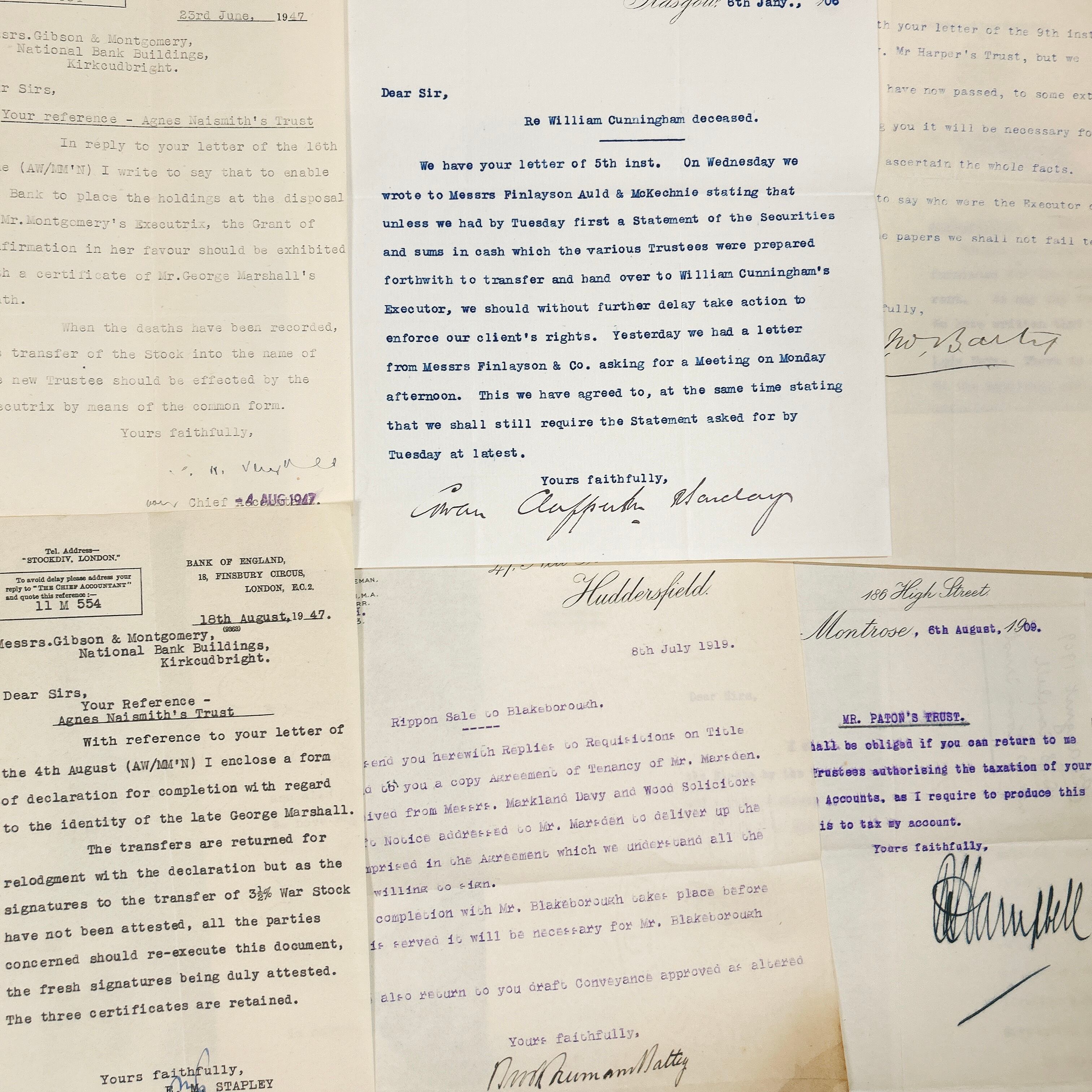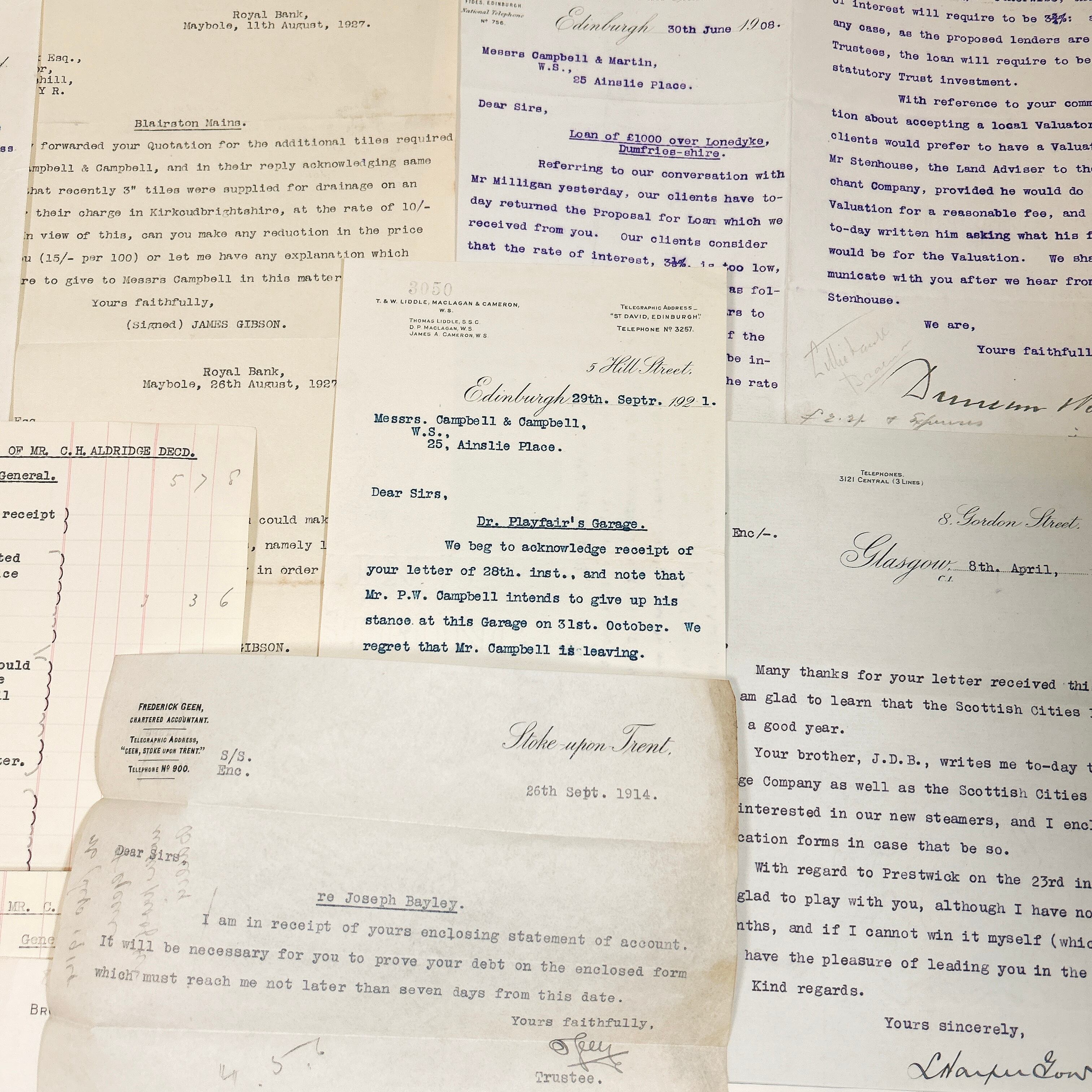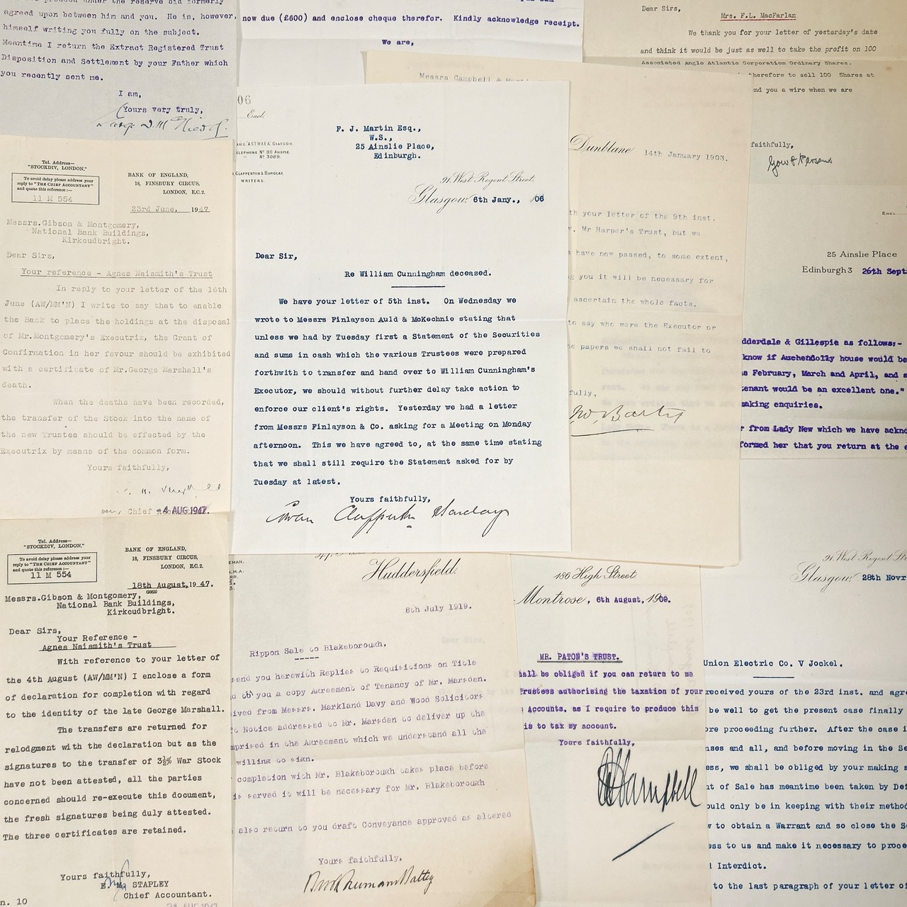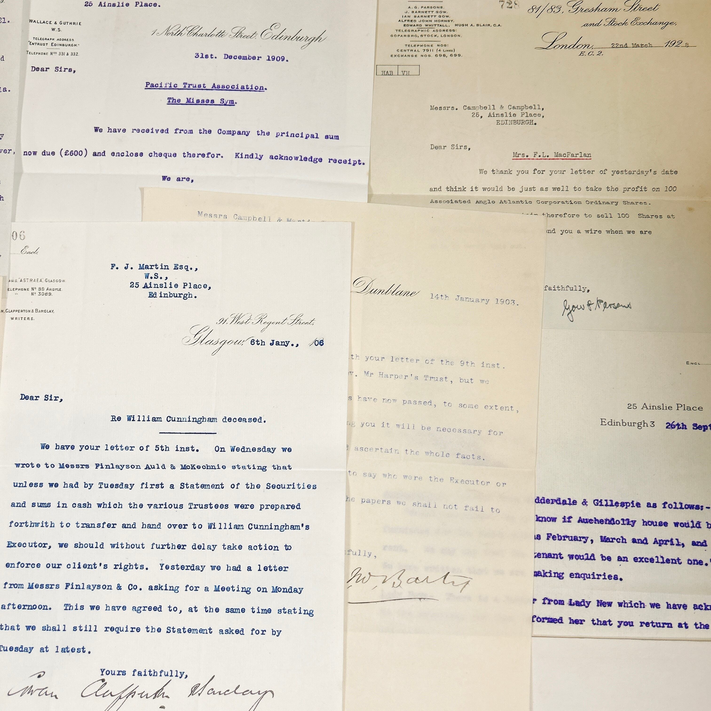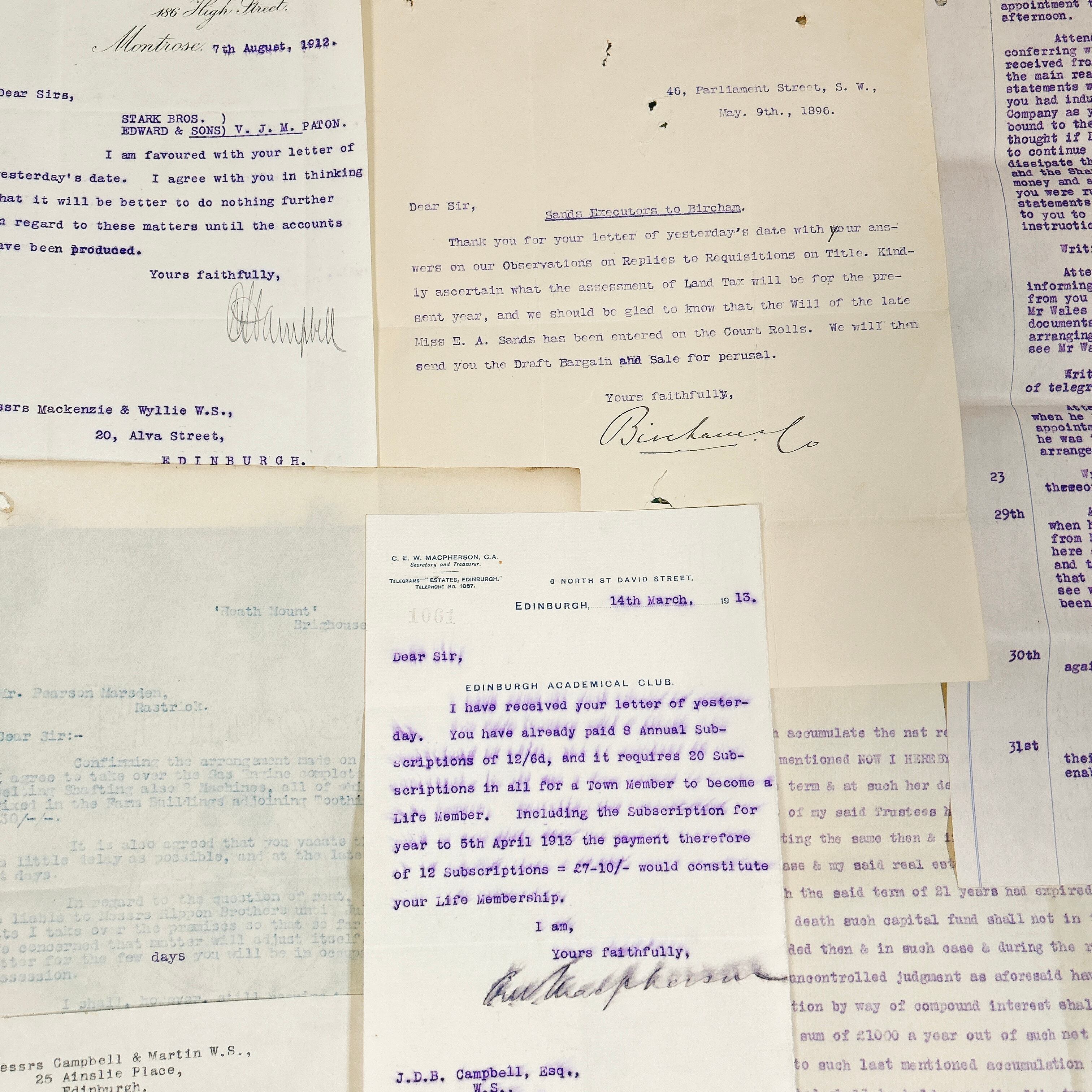 書類の内容は、法律文書や契約書、ビジネスレター、領収書、事務処理に関する記録など、多岐にわたります。いずれも英語で書かれており、手書きの補足や訂正が加えられているものも含まれています。中には青や赤のインクで書き込まれたコメントが見られ、当時の業務がどのように進められていたのかを知る手がかりとなります。手書きの筆跡は、今ではあまり見られなくなった独特の流麗な文字が特徴的で、アンティークの魅力をより一層引き立てています。