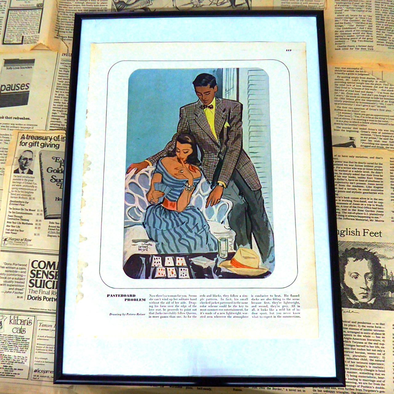 この商品の説明文では、「PASTEBOARD PROBLEM」と題されたイラストが紹介されています。この作品は、トランプゲームに興じる男女の姿を描いており、彼らの間にはゲームがただの娯楽を超えた何かを象徴しているかのような緊張感が感じられます。女性は青いドレスを着ており、カードに集中している様子が描かれています。一方、男性はチェック柄のジャケットを着て女性の側に寄り添い、優しく支える姿が表現されています。このイラストは、カードゲームという日常的な場面を通じて、人間関係の深さや複雑さを繊細に捉えており、親密ながらも何かを競っているかのような二人の関係性を暗示しています。背景に描かれた窓からの光は、この穏やかな昼下がりのシーンに温かみとリアリティを加えています。この作品は、日常の一コマに隠された深い意味を探求する洞察力を持つ視聴者にぴったりのアイテムです。