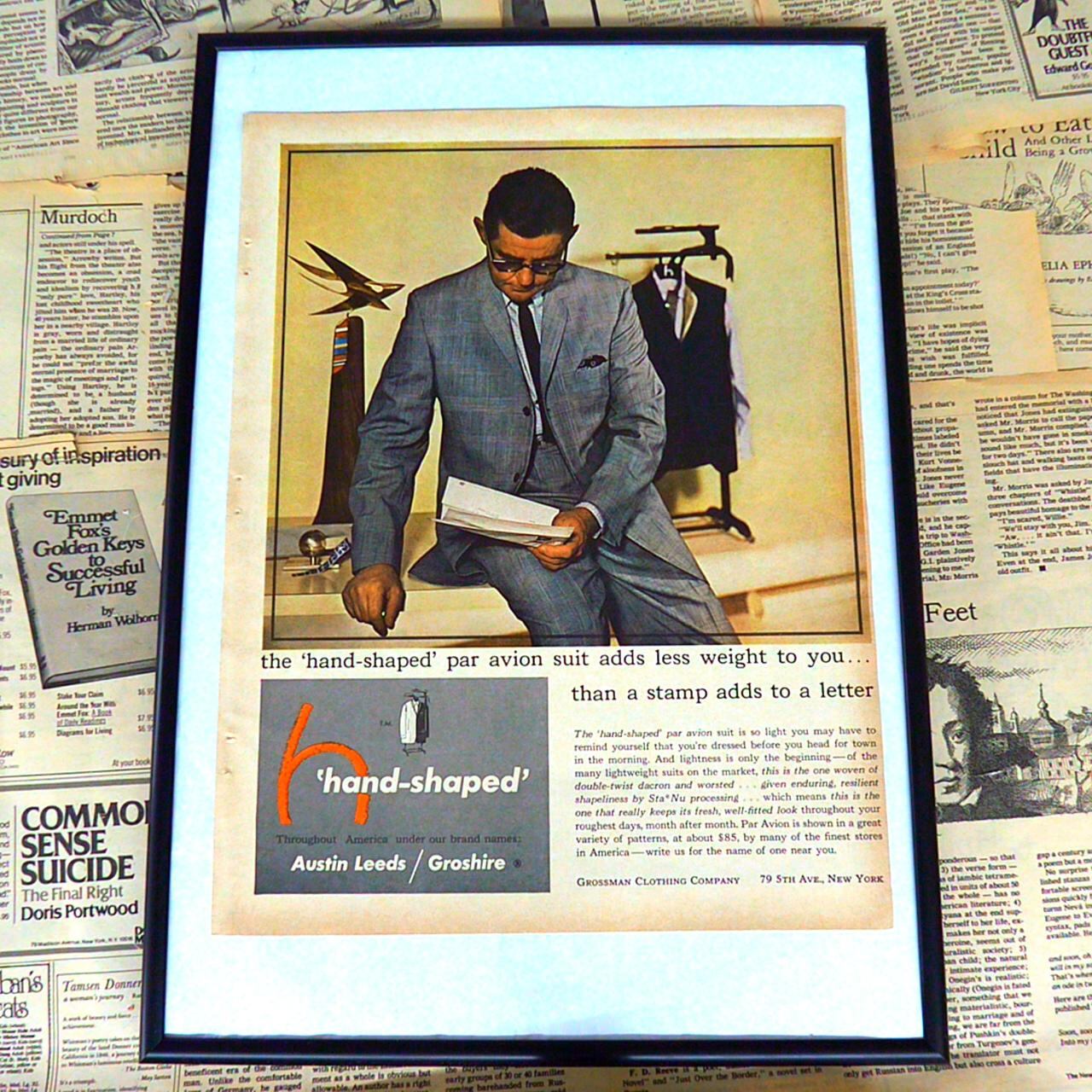 Grossman Clothing Companyは、高品質な紳士服を提供する企業で、特にスーツの軽量化技術に定評があります。彼らの「hand-shaped」パーアビオンスーツは、軽量でスタイリッシュなデザインに重点を置き、着用者に快適さを提供します。この広告は、そのスーツがいかに軽いかを強調し、日常のビジネスシーンでの利便性をアピールしています。スタンプよりも軽いというキャッチコピーは、衣服の軽さと着心地の良さを巧みに表現しています。ニューヨークの5番街に拠点を置くこの企業は、品質とデザインにこだわりを持ち、多くの顧客に支持されています。