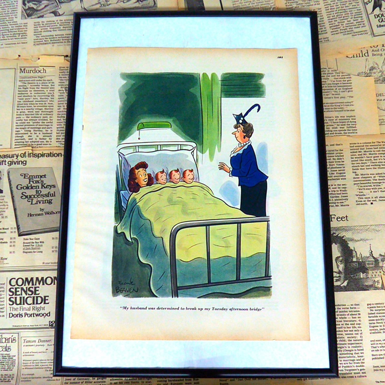 このイラストは、ユーモアと風刺の効いた作品で、家庭内のコミュニケーションや夫婦関係に対する当時の社会的視点がうかがえます。ベッドに横たわる女性とその隣に並ぶ三つ子の赤ちゃん、そして見舞いに来た女性の姿が描かれており、キャプションの『夫は火曜午後のブリッジゲームを何としても邪魔したかったようです』という言葉が情景をさらに面白くしています。女性が友人たちとカードゲームを楽しむ時間に、夫が子どもを増やすことで邪魔した、という風刺的なユーモアが込められています。キャラクターたちの表情や服装、小道具のベッドや背景の描写も細やかで、作者の観察眼とユーモアセンスが光る1枚です。当時の雑誌特有のコミカルな色使いとタッチが、どこか懐かしく温かい雰囲気を醸し出しています。
