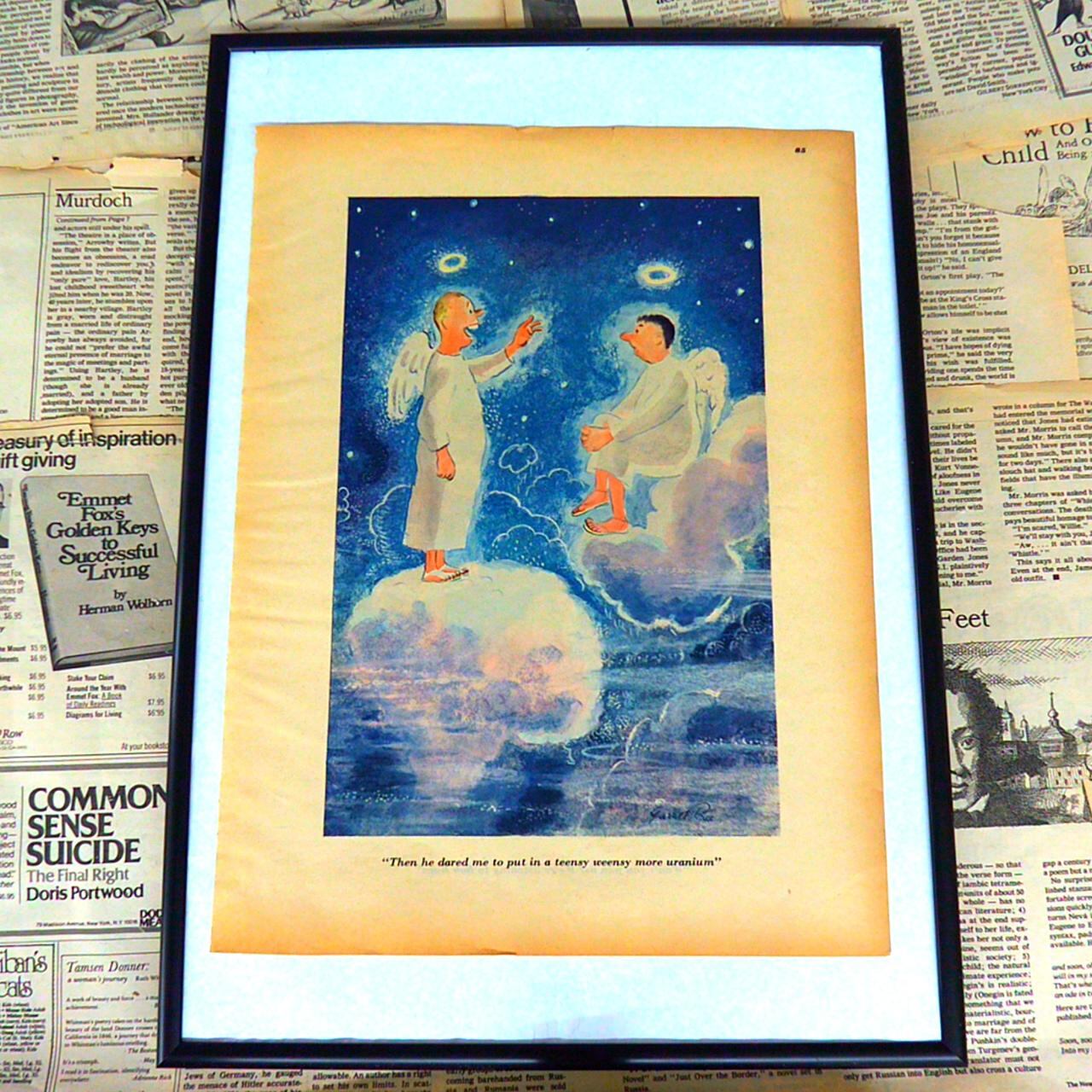 このイラストは、天使の姿をした二人の人物が雲の上に座り、星空を背景に会話をしているユーモラスな作品です。キャプションには「それで彼は、ほんの少しだけウランを多く入れてみろと私に言ったんだ」とあり、これは核エネルギーや原子力の危険性を皮肉たっぷりに描いた風刺的な内容となっています。天使たちが天国で談笑する姿と、地上で起こる重大な出来事が巧みに対比されており、1970年代特有の核問題への関心や社会風刺が感じられる一枚です。イラスト自体は柔らかい色使いと愛らしいキャラクター描写で、ブラックユーモアを上品に包み込んだ仕上がり。時代の空気を映すアートピースとして、インテリアやコレクションにもぴったりの逸品です。
