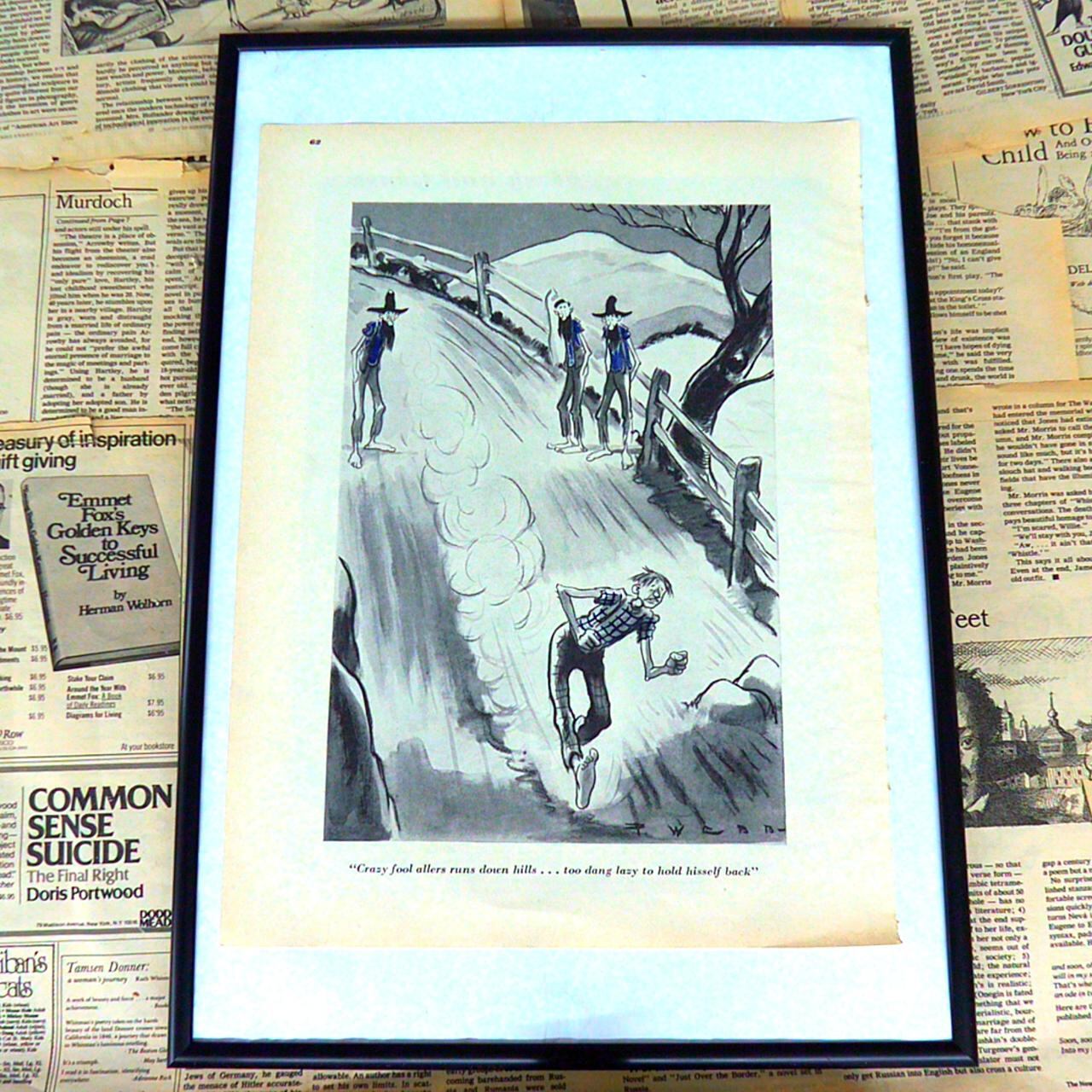 このイラストは、アメリカンな田舎道を舞台に、若者が坂道を勢いよく駆け下りていく瞬間を描いたものです。絵の中心には、チェック柄のシャツを着た若者が全身を大きく使って走り下りており、その後方には煙のような疾走の軌跡が残されています。さらに奥には、カウボーイハットを被った田舎風の男性たちが2人、柵のそばでその様子を呆気に取られたように見守っています。キャプションの英語もユーモラスで、勢いだけで坂を下りる愚かさと、それを止めようともしない“怠け者”ぶりを軽妙に表現しています。このイラストは、当時のアメリカのカントリーライフや素朴なユーモア、風刺的な視点を象徴的に切り取った一枚であり、額装して飾ることで空間にレトロで味わい深い雰囲気を与えます。
