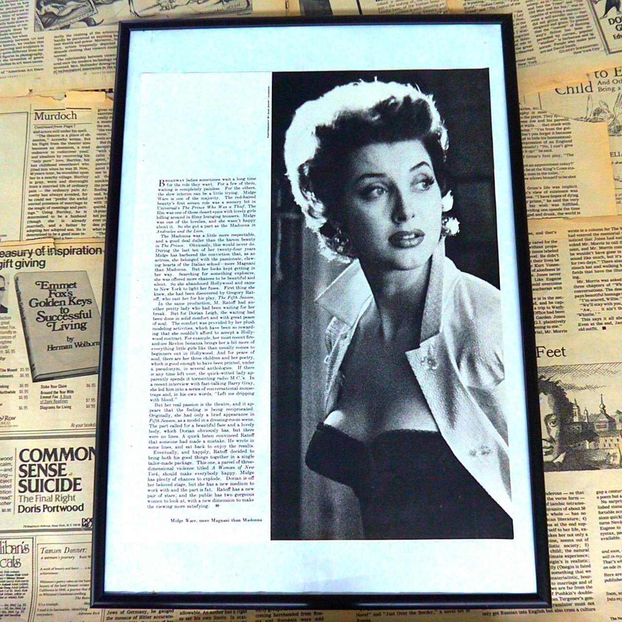 このイラストは、古き良き時代の書店を背景に、二人の女性が会話している場面を描いています。イラストはモノクロで仕上げられており、当時のファッションや雰囲気が繊細なタッチで表現されています。キャプションには『ノンフィクションの本を持ち上げていると、もっと質の高い男性を引き寄せるわよ』というユーモアと皮肉を込めた一言が添えられており、女性の知性や読書趣味が恋愛市場での価値とされる風潮を風刺しています。エスクワイヤー誌らしい、時代背景を反映した機知に富んだユーモアが感じられ、インテリアとしても会話のきっかけとなるアートピースです。