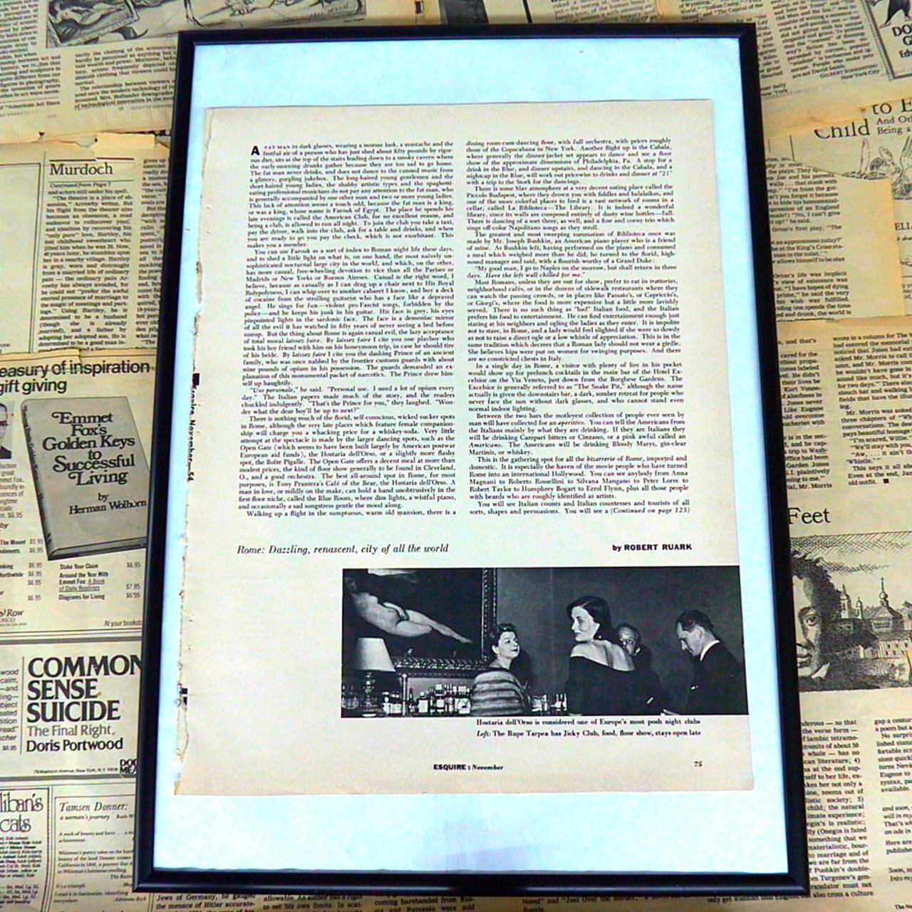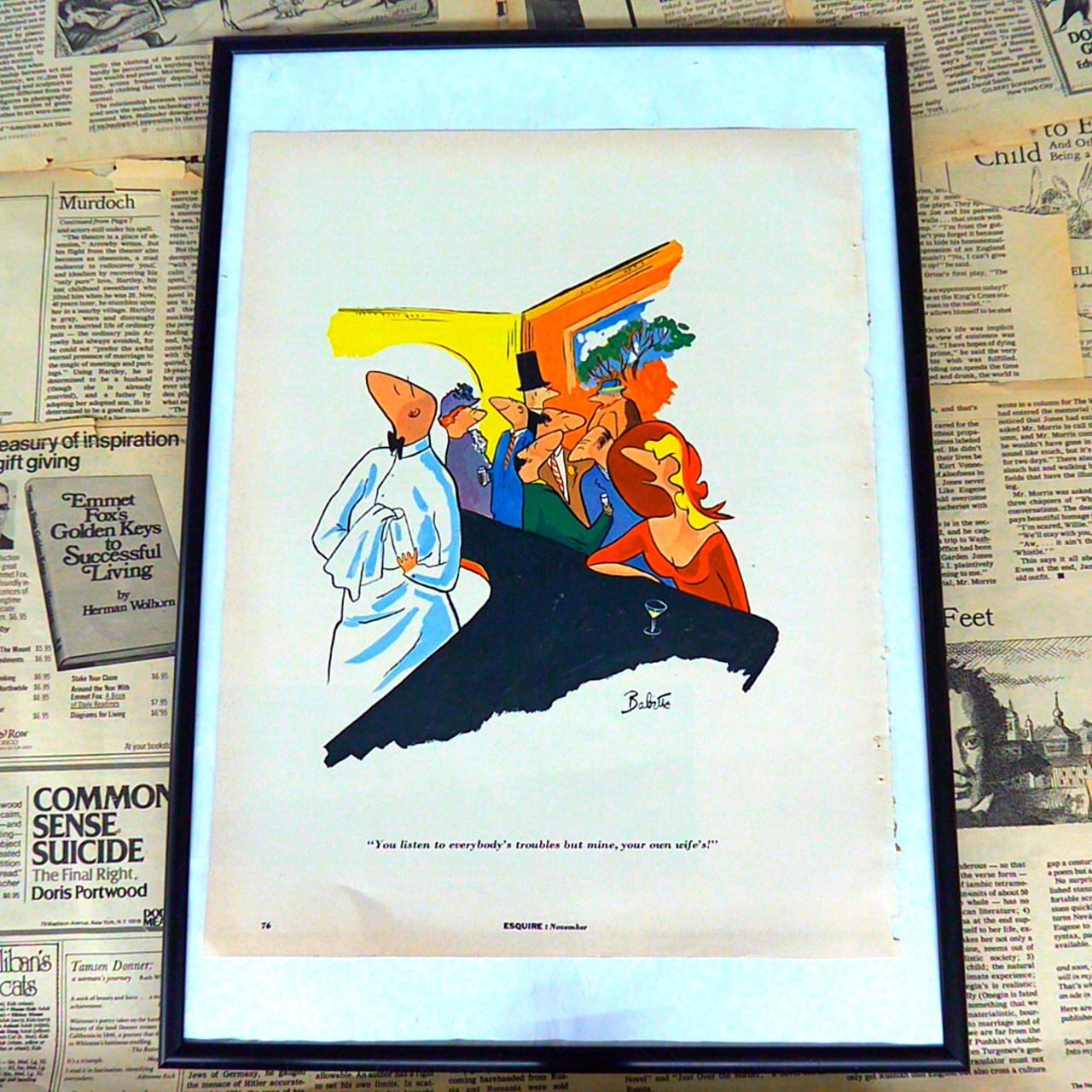 こちらは1970年代の「ESQUIRE(エスクワイヤー)」誌からの1ページで、著名なイラストレーターによるカリカチュア風のイラストが描かれています。場面はバーのカウンターで、バーテンダーらしき人物とその前に座る鮮やかなドレス姿の女性、その背後にさまざまな個性的な客が並び、賑やかな雰囲気が伝わります。キャプションには「あなたはみんなの悩みは聞くのに、私の悩み、自分の妻の話は聞いてくれないのね!」とやや皮肉を込めた一文が添えられており、夫婦の日常のすれ違いやコミュニケーションの難しさをユーモラスに風刺しています。イラストは鮮やかな色彩と大胆な線で描かれており、当時の雑誌ユーモアページの雰囲気をそのまま楽しめる逸品です。現代でも色褪せないウィットとデザイン性を感じさせ、インテリアとしてもおすすめできるヴィンテージアイテムです。