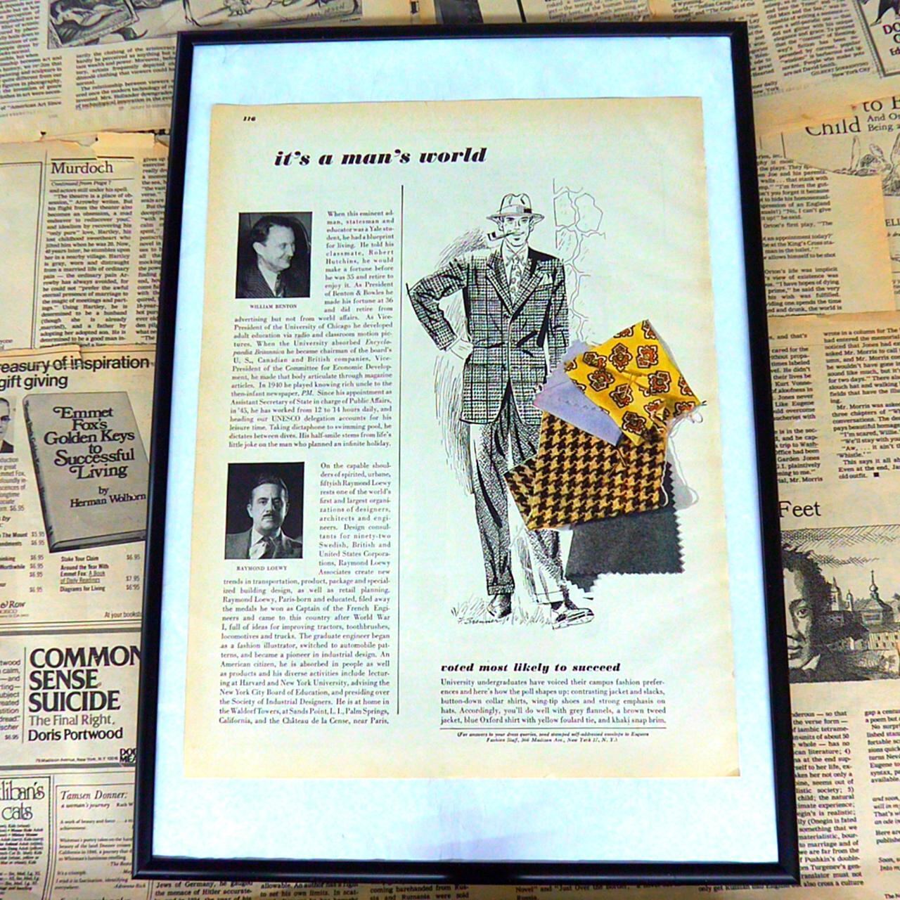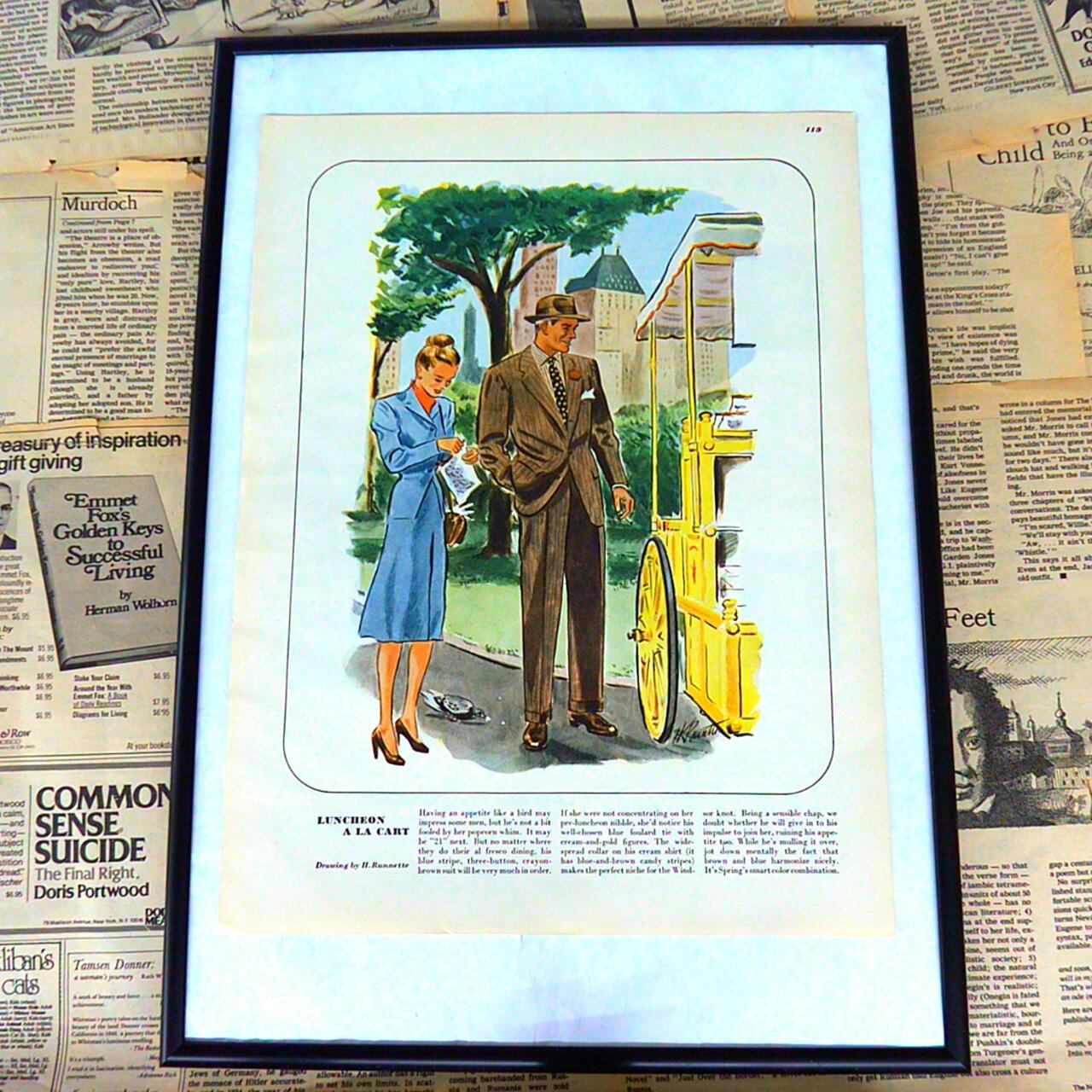 このイラストは、美しい公園の一角でランチワゴンの前に立つ紳士と淑女を描いています。二人とも上品な装いで、男性はブラウンのスーツと帽子、女性はブルーのワンピースとヒールを身につけています。背景には緑豊かな木々とクラシカルな建物が見え、都会の中の憩いの時間を切り取ったような1枚です。イラスト右側には黄色のカート(ワゴン)が描かれており、当時のアメリカのストリートランチの雰囲気を感じさせます。このようなシーンからは、1940~50年代の紳士淑女の優雅な日常や、気軽に外で食事を楽しむカルチャーが伝わってきます。キャプションには英語で「LUNCHEON A LA CART」と書かれており、外でのランチタイムの一コマであることが示唆されています。色彩や筆致も柔らかく、レトロで温かみのある雰囲気が魅力的なヴィンテージイラストです。インテリアとして飾れば、当時のエレガントなライフスタイルやファッションのエッセンスを空間にプラスしてくれる一品です。