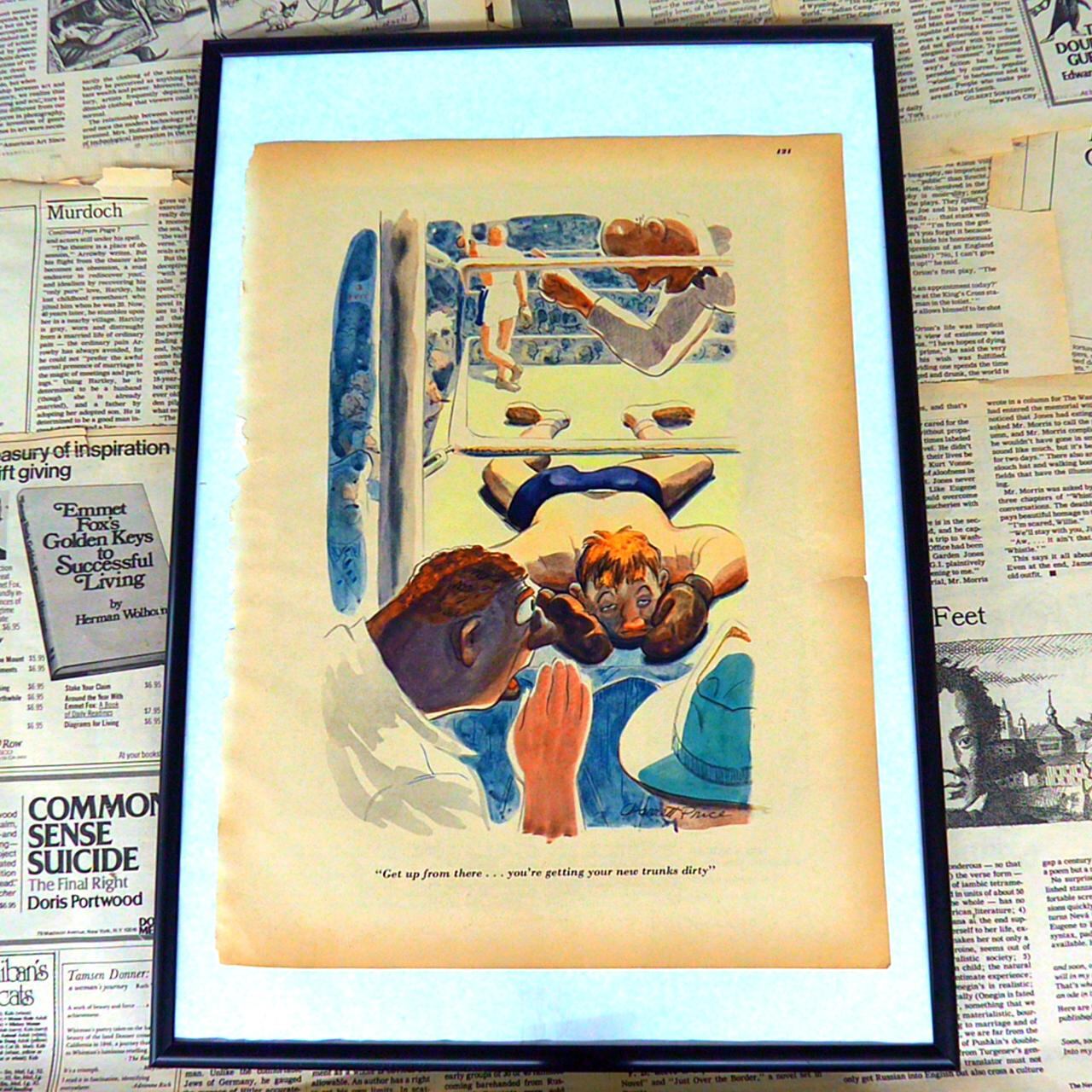 このイラストは、ボクシングの試合中のワンシーンをユーモラスに描いています。リングサイドでしゃがみ込む若いボクサーと、その様子を心配そうに見つめて声をかけるコーチらしき人物が描かれています。キャプションには「そこから立ちなさい……新しいトランクスが汚れるだろう」とあり、試合の勝敗や緊張感よりも、ユーモアや日常のちょっとした気遣いが前面に出ているのが特徴です。イラストの色彩は鮮やかで、人物の表情や動きも生き生きと描かれており、当時の雑誌イラストの温かみを感じさせます。ボクシングという激しいスポーツを題材にしながらも、親しみやすく微笑ましい雰囲気が漂うアートワークとなっています。そのため、インテリアとしても楽しめる一枚です。