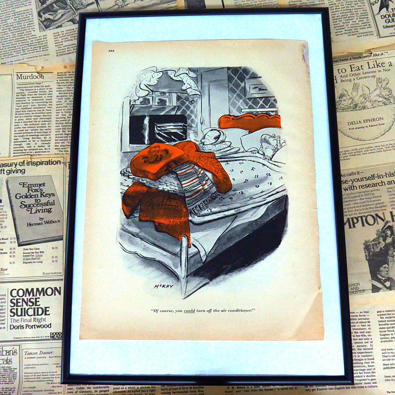 このイラストは家庭内のユーモラスな日常の一場面を切り取っています。ベッドに寝ている家族が厚手のセーターや毛布を何重にもかぶり、寒そうに身を寄せ合っている様子が描かれています。背景にはキッチンや生活感のある家具が配置され、リアリティと温かみが感じられます。キャプションの『もちろん、エアコンを切るという手もあるけどね!』というセリフが添えられており、現代人が陥りがちな“便利な電化製品に頼りすぎてしまう”ユーモラスな矛盾を風刺しています。過剰な冷房のために厚着を余儀なくされるシュールな状況がコミカルに表現されており、見る人にクスリと笑いを誘う作品です。イラストの柔らかなタッチと部分的なカラー使いが、当時の雑誌らしいレトロな雰囲気を醸し出しており、インテリアとしても存在感のある一枚です。