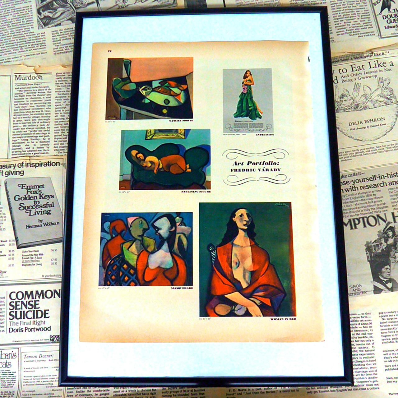 このページは、アーティストFredric Varadyの作品ポートフォリオを紹介しています。紙面には『STILL LIFE』『IMPRESSION』『RECLINING FIGURE』『MASQUERADE』『WOMAN IN RED』といったタイトルが記された5点のカラフルなイラストが並び、それぞれが独自の表現で人物や静物を描いています。モダンアートらしい大胆な色使いと、抽象的かつ個性的なタッチが特徴的です。例えば『WOMAN IN RED』では、赤いローブをまとった女性の表情とポーズが印象的に描かれており、鑑賞者を魅了します。『MASQUERADE』は複数の人物が絡み合う構成で、マスクや仮面舞踏会の雰囲気を感じさせます。『RECLINING FIGURE』ではソファに横たわる女性が柔らかなラインで表現され、くつろぎと静けさが伝わってきます。どの作品も20世紀モダンアートのエッセンスを持ち、インテリアとしても強い存在感を放つ一枚です。