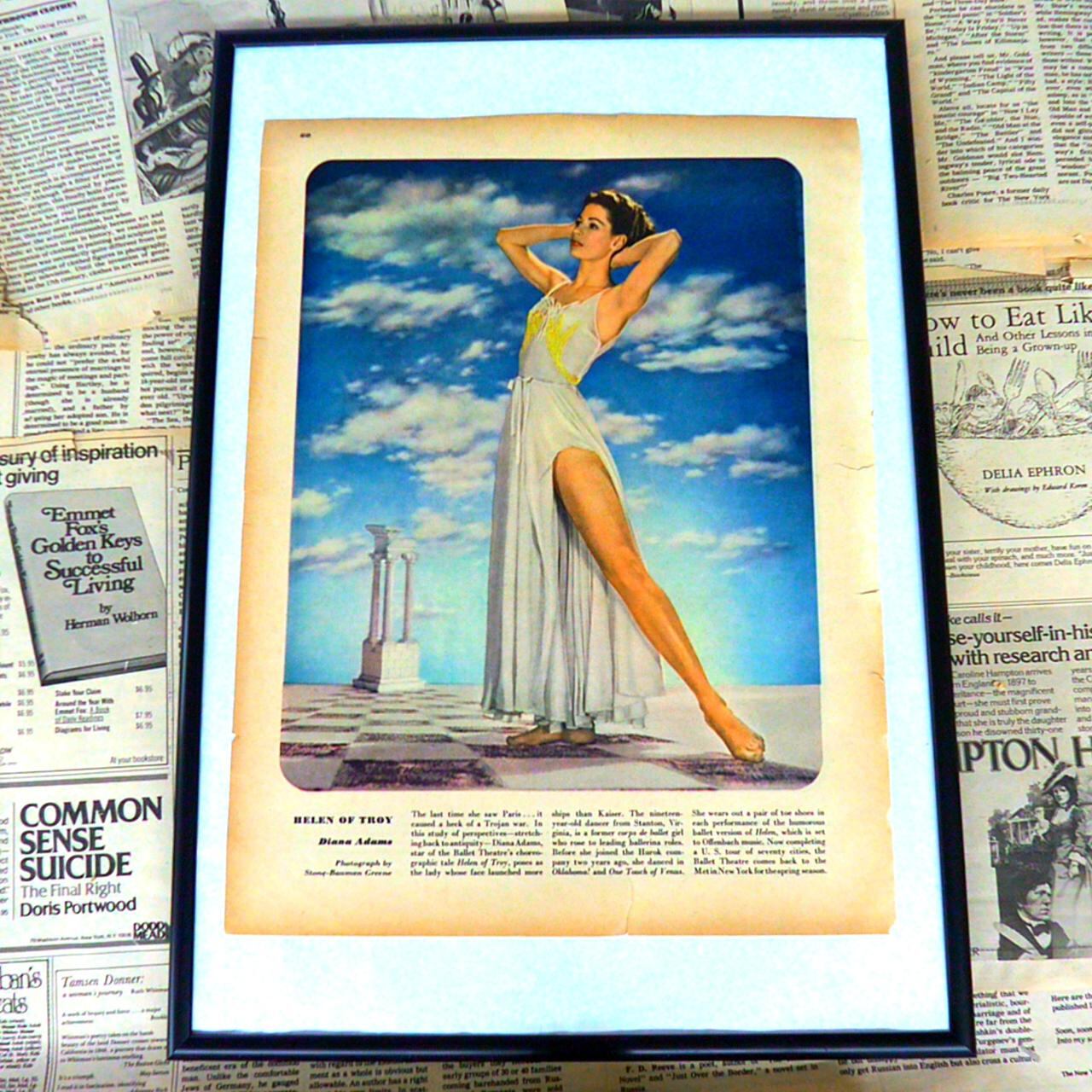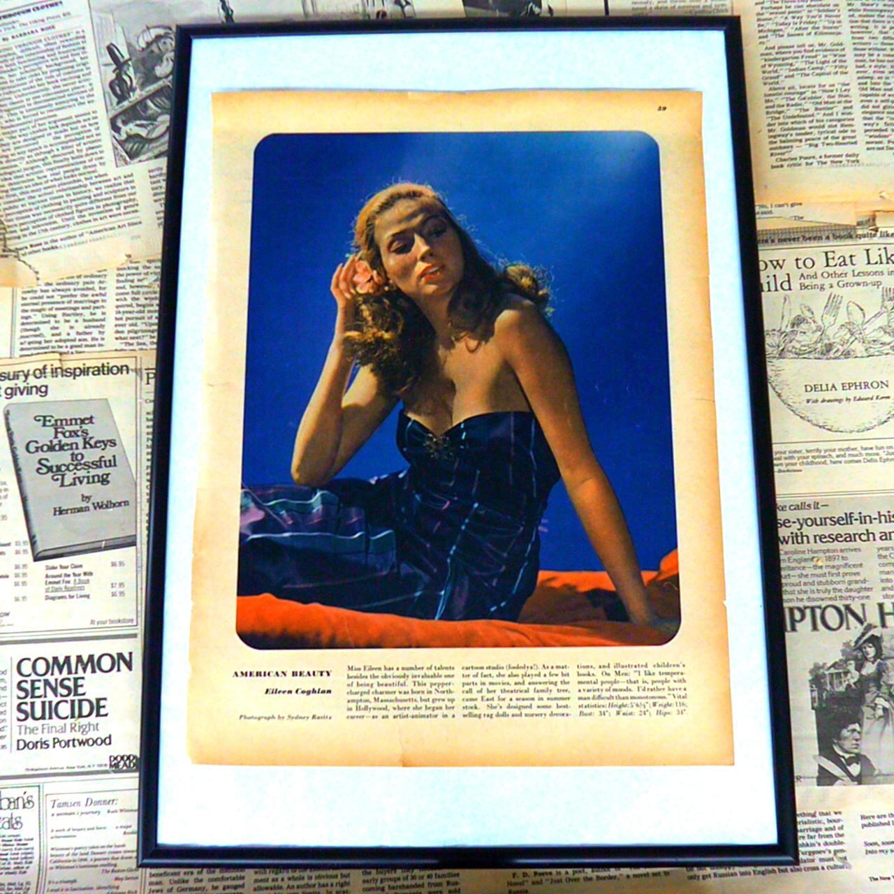 このフレーム内の紙は、アメリカの雑誌に掲載された美しい女性のポートレート写真ページです。鮮やかな青空を背景に、エレガントなストラップドレスをまとった女性が赤い布の上に座り、リラックスした自然なポーズでこちらを見つめています。その表情はやや遠くを見つめるような憂いを帯びており、クラシカルな美しさとともに、当時のアメリカの美的感覚やファッションの雰囲気が色濃く表現されています。キャプションには「AMERICAN BEAUTY」と書かれており、写真の被写体であるイーリーン・コグラン(Eileen Coghlan)についての簡単な紹介も記載。カメラマンはSydney Bustinです。装飾的な要素は控えめながら、色彩のコントラストが印象的で、インテリアとして飾っても目を引く一枚です。ヴィンテージな雰囲気やノスタルジックな空気感を楽しみたい方におすすめの一品です。