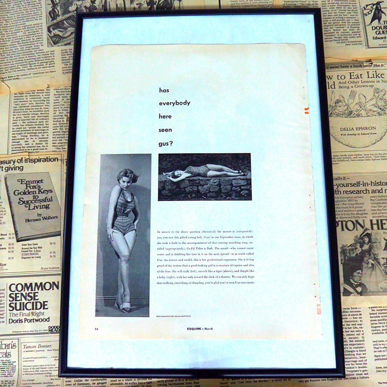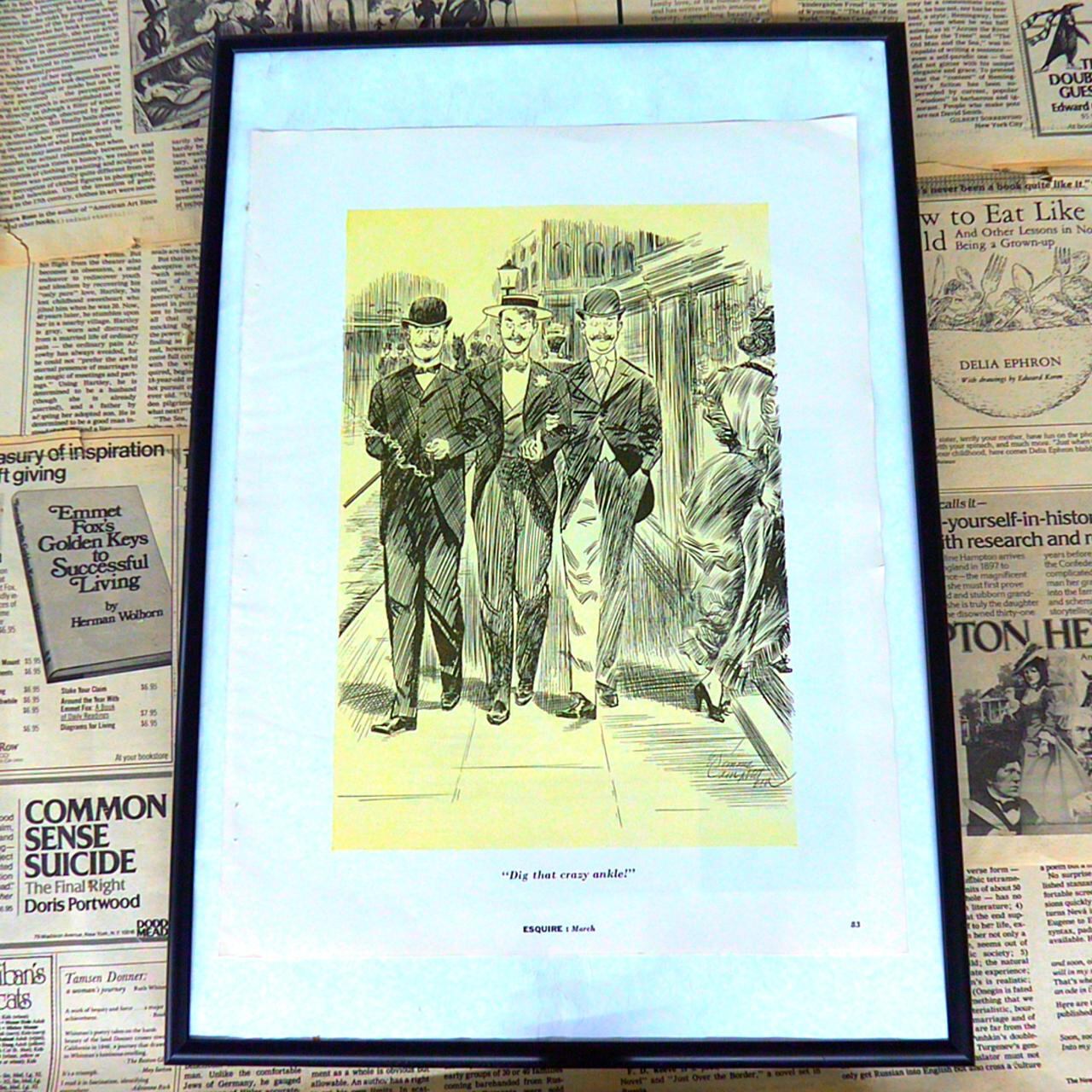 このイラストは、エスクワイヤー誌に掲載されたユーモラスな一コマで、3人の紳士が街を歩きながら、すれ違う女性の足元に目を奪われている様子を描いています。キャプションの“Dig that crazy ankle”(直訳すると「そのクレイジーな足首を見ろ!」)という表現は、1940〜50年代アメリカの俗語で、魅力的な女性の姿に惹かれた時の男性の気持ちをコミカルに表現しています。イラストは細やかな線画で描かれ、クラシックな服装の男性たちの表情や仕草、そしてセクシーな足元だけが強調された女性の姿が対比的に描かれており、当時の紳士たちの遊び心やユーモアを感じさせます。時代の雰囲気やジェンダー観、そして洒脱な風刺のセンスが詰まった作品で、インテリアとしてもヴィンテージ雑誌らしい洗練された雰囲気を醸し出します。