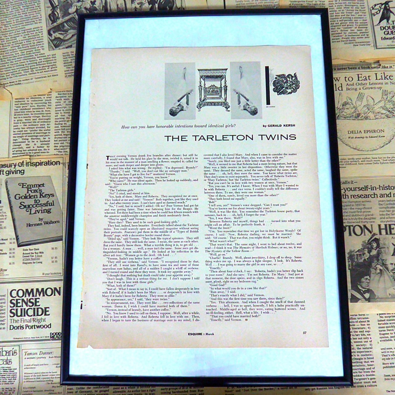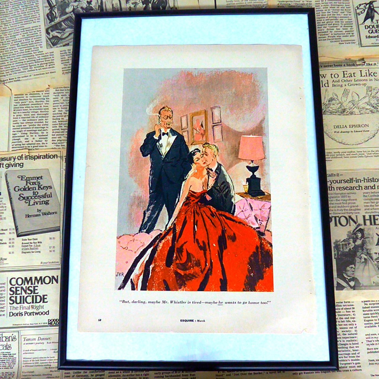 このイラストは、エスクワイヤー誌の一ページを飾った典型的なミッドセンチュリーアートです。絢爛な赤いドレスをまとった女性がソファに座り、隣にはタキシード姿の男性が彼女に寄り添っています。その背後には、葉巻をくわえたもう一人の紳士が立ち、少し気まずそうな雰囲気が漂います。背景にはピンク色のランプや壁の絵画が配され、室内の華やかさと緊張感が絶妙に描かれています。キャプションは「でも、ダーリン、ウィスラーさんは疲れてるのかも—彼もそろそろ帰りたいのかも?」というセリフで、少し皮肉混じりなユーモアが感じられます。社交界やパーティーの終盤、気まずい空気と大人の駆け引きを風刺的に描いた、時代を感じさせる1枚です。アートとしても、その色使いと構図がインテリアに映える一枚です。