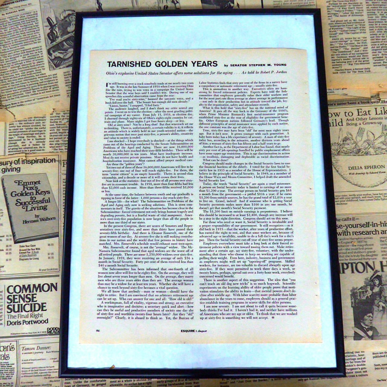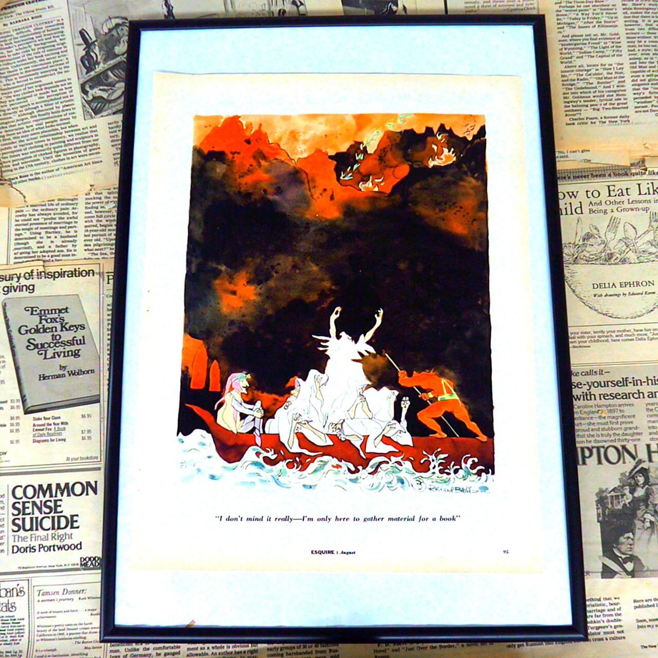 このイラストは、どこか幻想的かつ風刺的な世界観を感じさせる作品です。中央には白い衣服の人物が腕を掲げており、その周囲には様々なキャラクターが集っています。背景は炎や煙が渦巻くような赤黒い雰囲気で、まるで地獄や異世界を想起させます。手前には激しく波打つ水が描かれ、登場人物たちがその上に集っています。キャプションには「私は本当に気にしていません—本の素材を集めるためにここにいるだけです」とあります。これは、登場人物が過酷な状況や混沌とした世界に身を置きながらも、目的のためにあくまで冷静に行動しているという皮肉やユーモアを感じさせます。この一枚は、70年代エスクワイヤーらしい知的な風刺と独自の美的センスが見事に融合したアートピースです。部屋に飾れば、見る人の想像力や会話を刺激してくれることでしょう。
