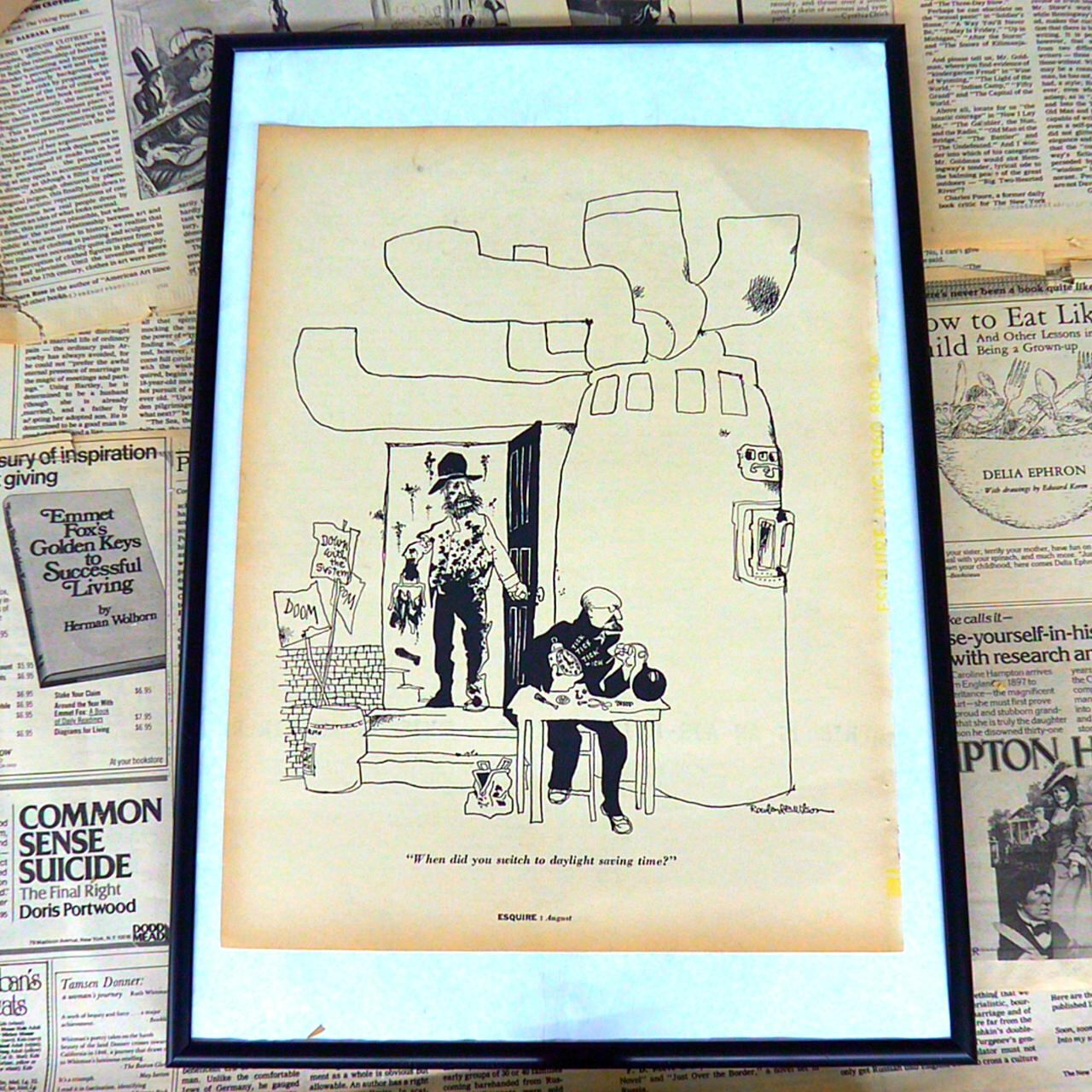 こちらは1970年代のエスクワイヤー誌に掲載されたユーモラスなイラストです。キャプションには「When did you switch to daylight saving time?」(いつ夏時間に切り替えたの?)と記されており、登場人物たちの間で交わされる皮肉めいたやり取りが描かれています。イラストの中央には、工場や装置のような建物の前でテーブルに座る人物と、扉から現れる風変わりな装いの男性が描かれています。ドアのそばには「DOOM」や「DAY OF DOOM」と書かれた紙が貼られ、不穏な雰囲気を漂わせていますが、全体にはどこか滑稽さも感じられます。複雑な装置や人物の表情は、時代背景や社会風刺を感じさせる一方で、アートとしても存在感を放ちます。インテリアとして飾れば、来訪者との会話のきっかけにもなる、ユニークなヴィンテージアイテムです。