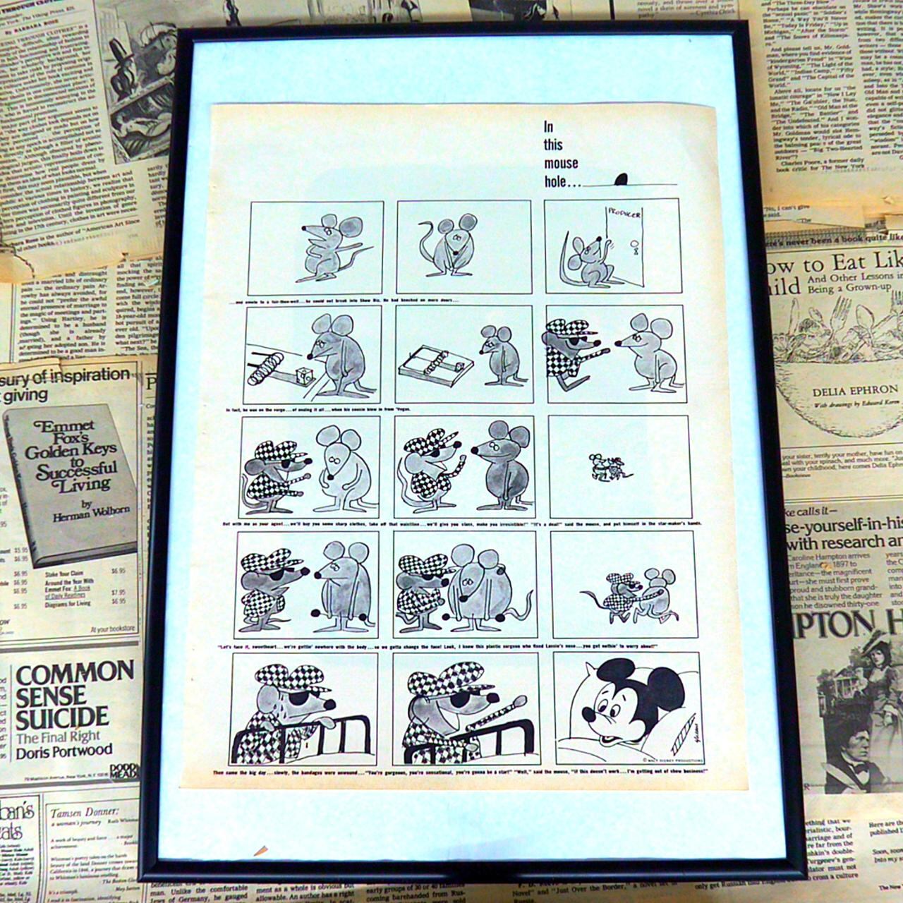 このイラストは、漫画のコマ割り形式でネズミたちの日常をユーモラスに描いた作品です。帽子をかぶったネズミが、他のネズミと会話したり、チーズの罠を調査したりする様子が続きます。最初はのんびりと生活しているように見えるネズミたちですが、次第に外部からの脅威(猫や人間の罠など)について議論し始めます。ユーモアを交えながら、ネズミたちが知恵を絞って生き抜く姿や、仲間と一緒に困難に立ち向かう様子が描かれています。最後のコマには、ネズミたちが有名なキャラクター「ミッキーマウス」のポートレートを眺めており、これが彼らの“希望”や“憧れ”であることをほのめかしています。風刺的でありながら、どこか温かみのあるイラストで、当時のアメリカン・サブカルチャーやユーモアを感じさせる一枚です。雑誌ページならではの印刷の風合いも、ヴィンテージらしい魅力を引き立てています。