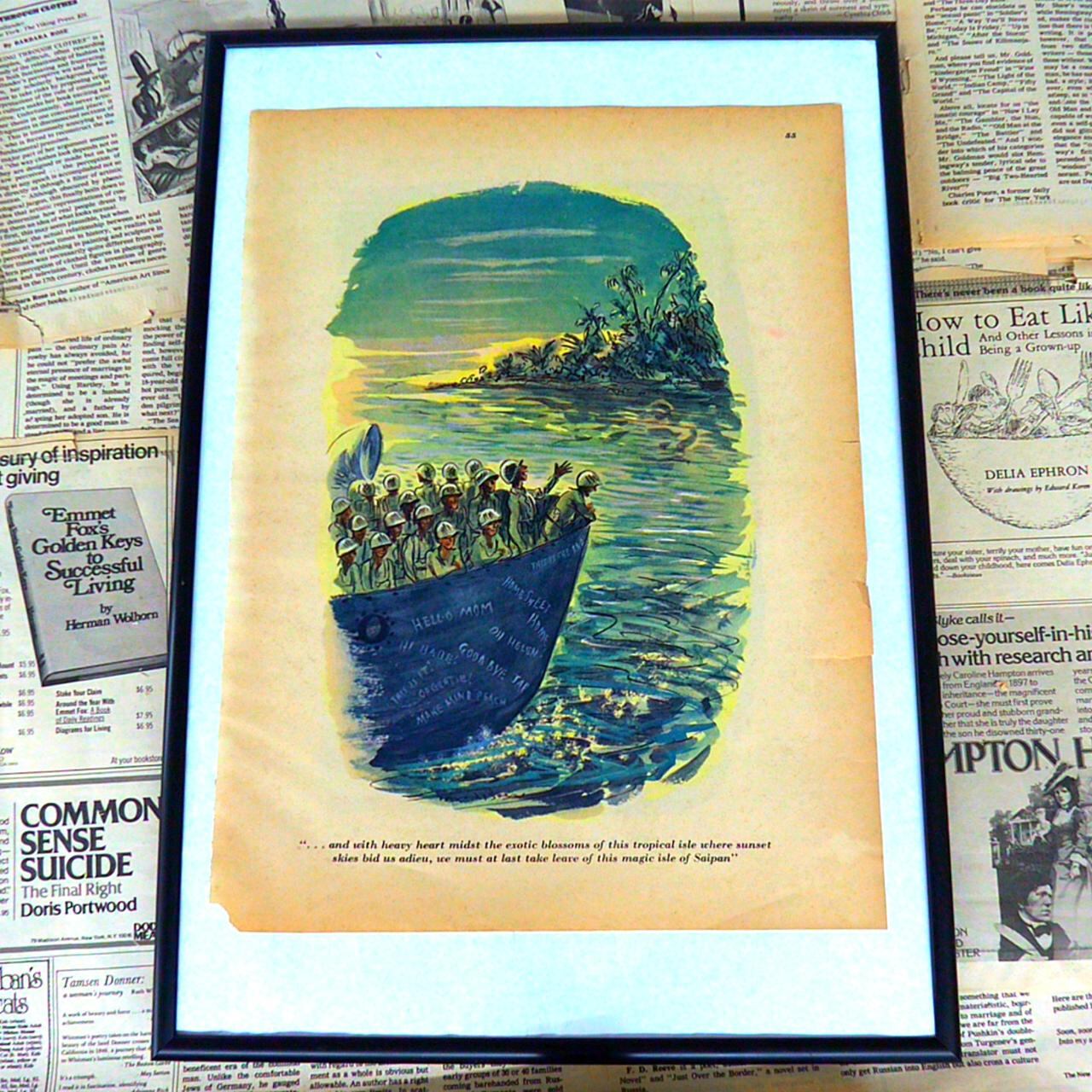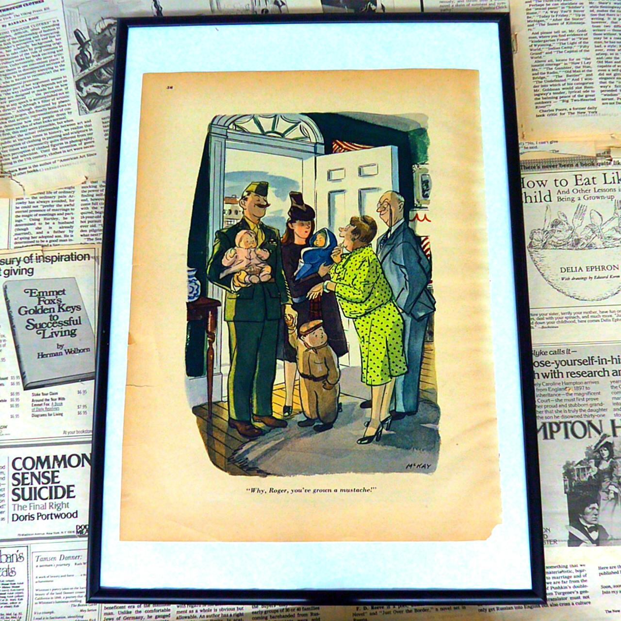 このイラストは、帰宅した軍服姿の男性と家族の再会の瞬間を描いています。玄関先で大きく開かれたドアの向こうには、笑顔で迎える家族たち。男性は赤ちゃんを抱いており、妻らしき女性や、元気な子供、そして年配の夫婦が集まっています。キャプションの「Hy, Roger, you've grown a mustache!」は、久しぶりに帰ってきたロジャーに対し、ひげが生えたことを家族が冗談交じりに驚いている様子です。この場面は、戦時中や戦後の家庭の温かさや、家族の再会の喜び、そしてさりげないユーモアが織り交ぜられており、見る者の心を和ませます。鮮やかな色使いと細やかな表情描写が印象的な、時代背景を感じさせる素敵なイラストレーションです。
