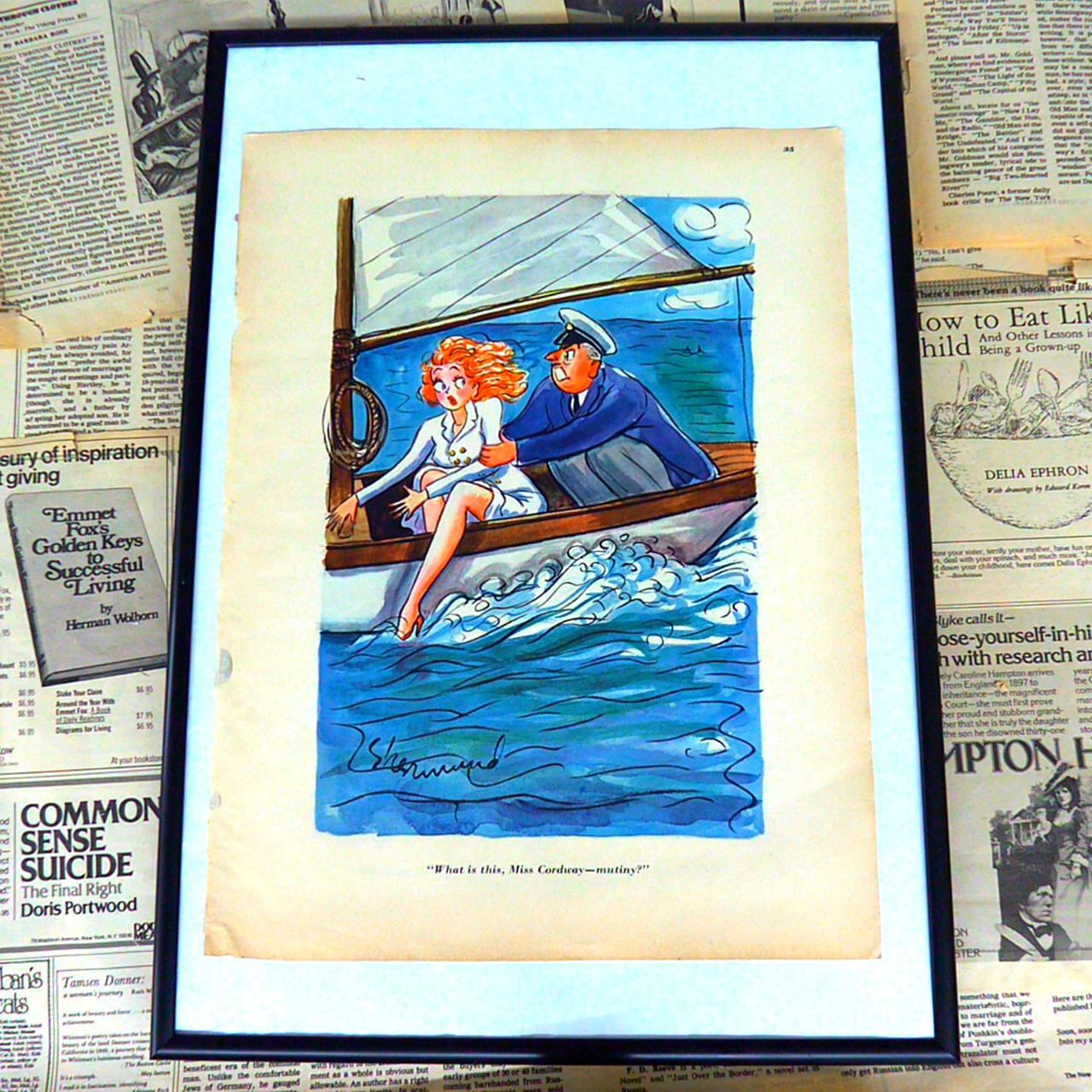 このイラストは、異国情緒あふれる建築物の下、エキゾチックな衣装を身にまとった男性二人が会話しているシーンを描いています。右側の男性の後ろには、多数の女性が控えており、ユーモラスな雰囲気が漂っています。キャプションの『なぜハーレムを連れてきたのか、今日は楽しく出かけるつもりだったのに』というセリフから、異文化の習慣を皮肉や風刺の形で表現していることがうかがえます。イラストは1970年代の雑誌特有の鮮やかな色使いで、当時流行したユーモアと社会風刺が感じられます。観賞用としてもインパクトがあり、ヴィンテージアートやレトロな雰囲気をお部屋に加えたい方におすすめの一枚です。