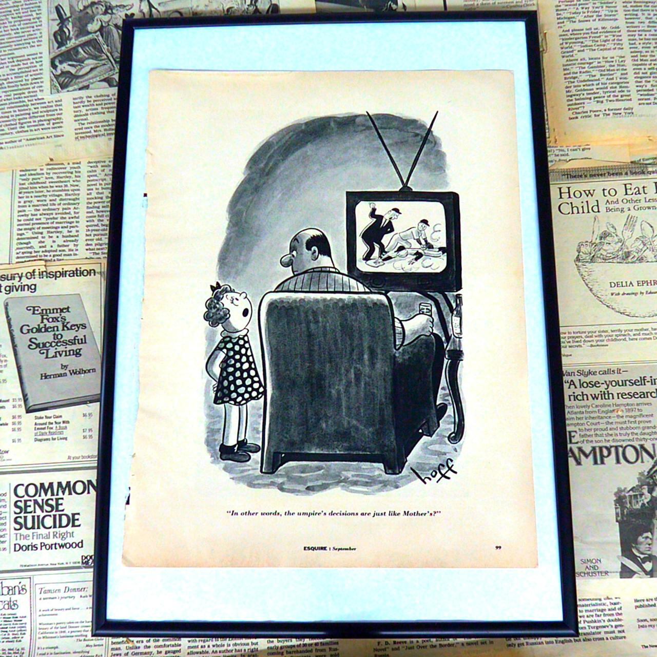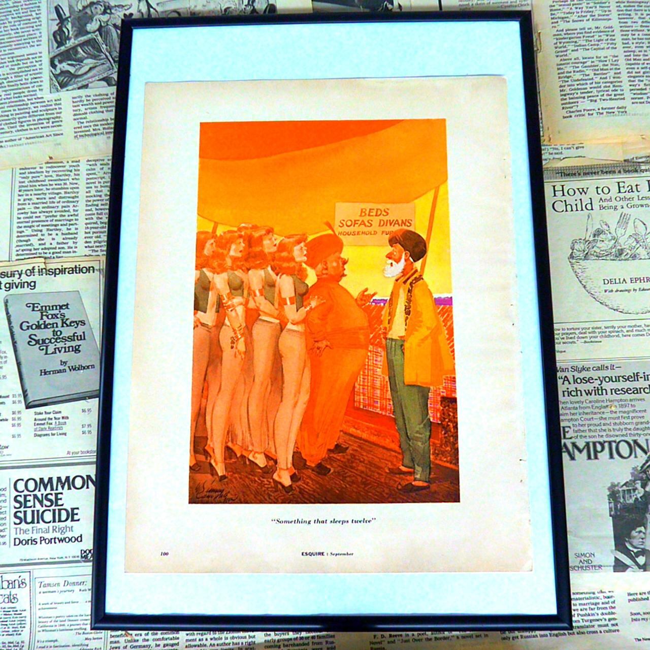 本イラストは、12人の女性が並んで立っている前に、ふたりの男性が会話しているというユーモラスなシーンを描いています。背景には『BEDS SOFAS DIVANS』といった家庭用家具を示す看板が掲げられ、家具売り場での一幕であることが示唆されています。キャプションの“Something that sleeps twelve”(『12人が寝られるもの』)は、家具売り場でよく使われる表現『sleep(何人用ベッド)』を文字通り受け止めた風刺的なユーモアです。通常ならば『12人用のベッド』を指すはずですが、実際には12人の女性が一列に並んでいる様子が描かれていて、広告や日常表現の言葉をイラストで直訳することで見る者にくすりと笑いを誘います。1970年代のエスクワイヤー誌らしい、斬新でウィットに富んだ作品です。飾るだけで部屋の雰囲気を和ませ、アメリカンヴィンテージのユーモアを感じさせる一枚です。