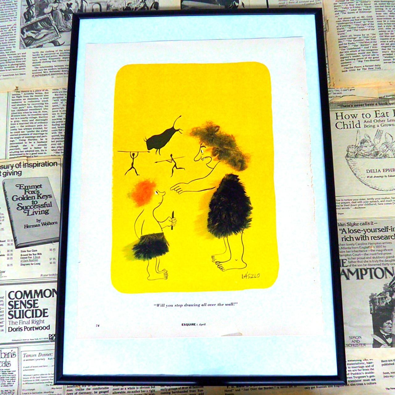 このイラストは、原始時代の洞窟に住む親子をユーモラスに描いた作品です。黄色い背景に、毛皮をまとった大人と子どものキャラクターが登場し、大人は子どもに対して「壁じゅうに落書きするのをやめてくれる?」と話しかけています。子どもは手に描画用の道具を持ち、壁には動物や人物の線画が描かれています。このイラストは現代の親子のやり取りを原始時代に置き換え、壁画芸術の始まりを楽しく想像させる風刺的なユーモアが光ります。家族や芸術、子どもの創造力に対する普遍的な悩みや微笑ましさを、時代を超えて表現した一枚です。インテリアとして飾れば、ユニークなストーリーと笑いを届けてくれる魅力的なアート作品です。