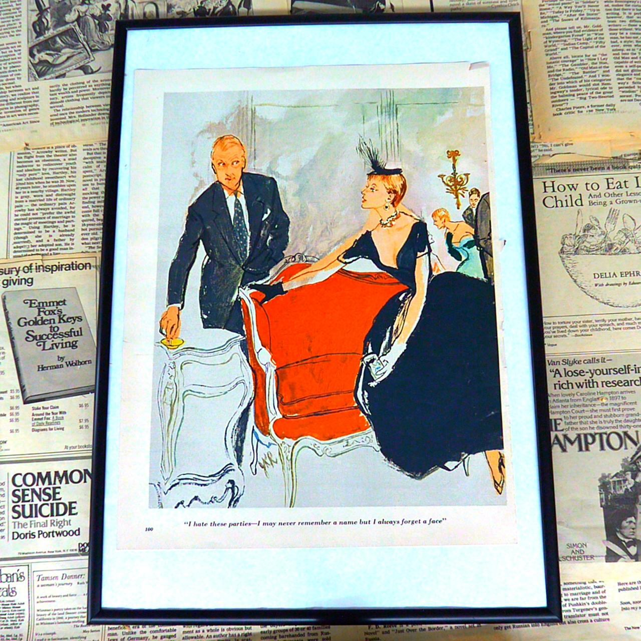 このイラストは、上品なパーティーの一場面を描いたものです。赤いソファに座り、黒いドレスを纏ったエレガントな女性と、その隣に立つタキシード姿の男性が配されています。背景にはロウソクの燭台や、さらに談笑する別の女性たちも描かれ、華やかな社交界の雰囲気が伝わります。イラストの下部には『このパーティーが嫌いなんだ——私は名前は思い出せなくても、顔はいつも忘れてしまう』というウィットに富んだキャプションがあり、上流階級の人々が頻繁に出会う社交イベントの皮肉や、軽いユーモアが表現されています。繊細な線と鮮やかな色使いが印象的で、当時のファッションや社交文化の雰囲気を味わえる一枚です。アートとしても、インテリアアクセントとしてもおすすめです。