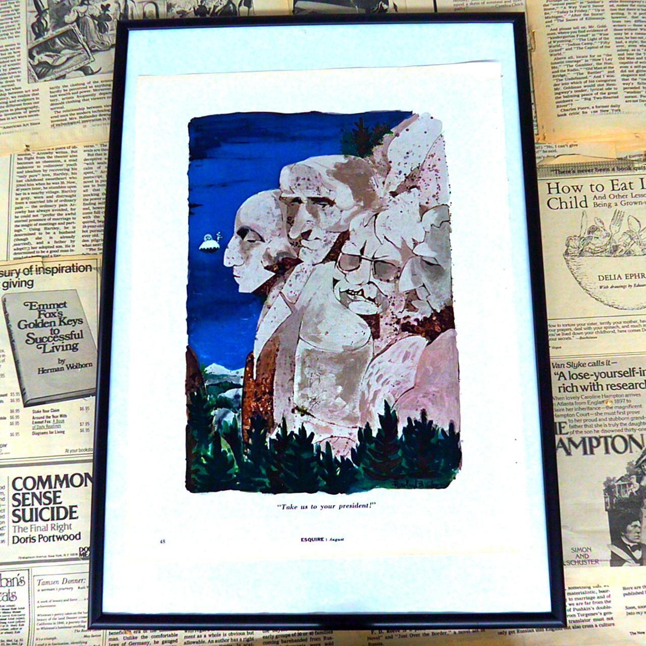 このイラストは、有名なマウント・ラシュモアの大統領彫像をモチーフに描かれています。彫像のうち3体は通常通りアメリカ歴代大統領の顔ですが、右端の1体にはユーモラスな表情や丸い眼鏡が加えられており、遊び心が感じられます。また、左側の空にはUFOのような未確認飛行物体が浮かんでおり、その下に「Take us to your president!(我々をあなたの大統領のもとへ連れて行ってくれ!)」というキャプションが添えられています。このキャプションとUFOの描写は、異星人が地球を訪れた際にアメリカ大統領に会いたいという定番のジョークを風刺的に表現しています。イラスト全体は、1970年代らしいユーモアと社会風刺、そして独特の色彩感覚が魅力となっており、壁に飾るだけで当時の雑誌文化や時代精神を感じられるアイテムです。