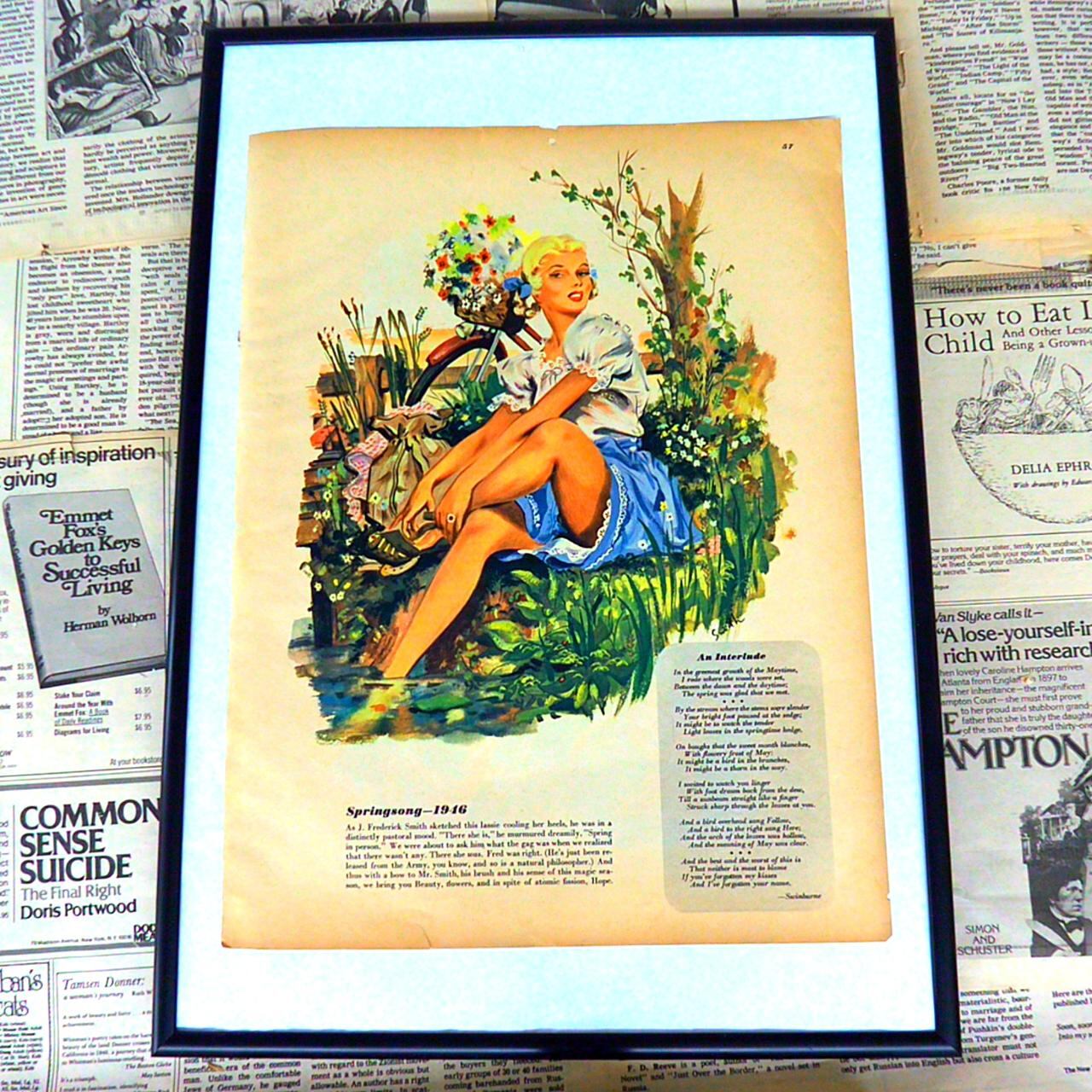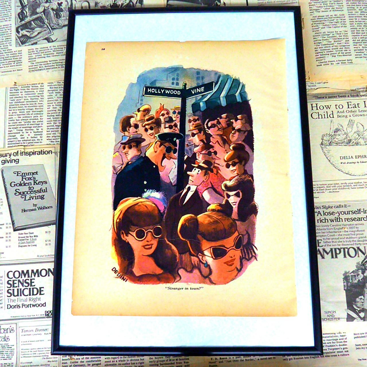 このイラストは、賑やかな交差点『HOLLYWOOD』と『VINE』の標識のもとに集まる大勢の人々を描いています。ほとんどの人々がサングラスをかけ、個性的なファッションやヘアスタイルがカラフルに表現されており、都会的で洗練された雰囲気が漂います。中央手前には、明らかに他の人々とは雰囲気が異なる2人の女性が描かれており、その表情やポーズもどこか自信に満ちています。キャプションの“Stranger in town?!”(『この町のよそ者?』)が示すように、彼女たちがこの地に新しくやってきたこと、あるいは周囲の雰囲気に溶け込めていない様子がユーモラスかつ風刺的に描かれています。都会の華やかさや集団心理、人々の個性の違いなど、見る人によってさまざまな解釈ができる魅力的なイラストです。アメリカのカルチャーやファッションの一コマをコミカルに切り取った、70年代らしいセンスが光る一点です。