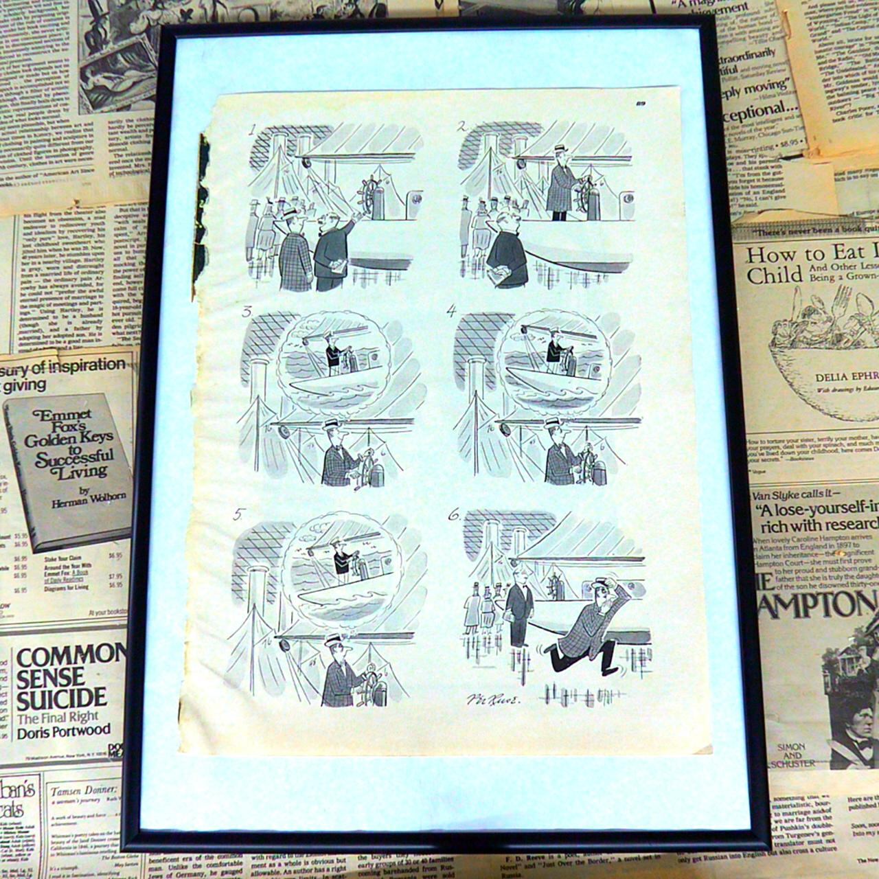 このイラストは、大勢の人々が『QUIZ-O 6:00』と書かれた会場に集まり、クイズイベントへの参加を待っている様子を描いています。手前には『QUIZ FORM 50¢』と書かれた申込用紙を販売する男性が立ち、周囲の人々に声をかけているのが印象的です。キャプションには「冷蔵庫を当てよう!準備して正しい答えを選ぼう!」とあり、1950〜70年代アメリカで流行したテレビやラジオのクイズ番組の熱狂ぶりや、賞品として家電がよく用意された時代背景を風刺的に表現しています。賑やかな群衆の中には大人から子供まで様々な人が描かれ、当時の社会全体がこうしたイベントに夢中になっていた様子がうかがえます。ユーモラスなタッチで、当時の生活や人々の高揚感がリアルに伝わる作品です。
