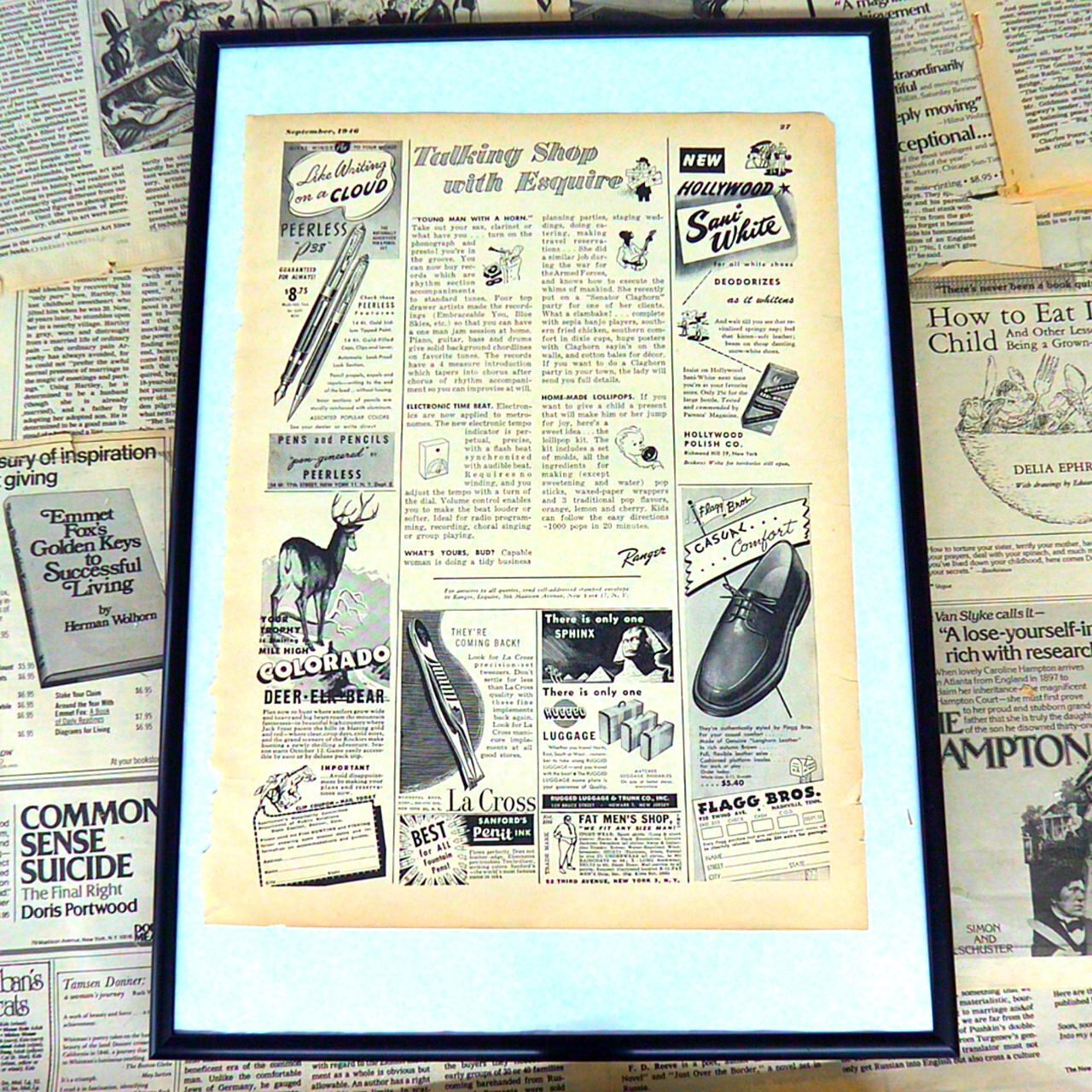 このイラストは、ヴィンテージなユーモアが感じられるエスクワイヤー誌の1ページで、2人の女性が旅行の準備をしているコミカルなシーンが描かれています。一人はスーツケースの上に座り、必死に蓋を閉めようとしていますが、あふれ出す衣服の山に困惑している様子です。もう一人は立ったまま、驚きと半ば諦めの表情でその様子を見守っています。キャプションは「Guess we'll have to leave most of our clothes at home—I still can't get it shut!(ほとんどの服は家に置いていかないとダメね—どうしても閉まらないのよ!)」とあり、女性たちの旅行前のリアルな苦労と、日常のちょっとしたドタバタがユーモラスに描かれています。イラストの線画は柔らかで流麗、1940~50年代のアメリカン・イラスト特有のチャーミングな雰囲気を楽しめる作品です。