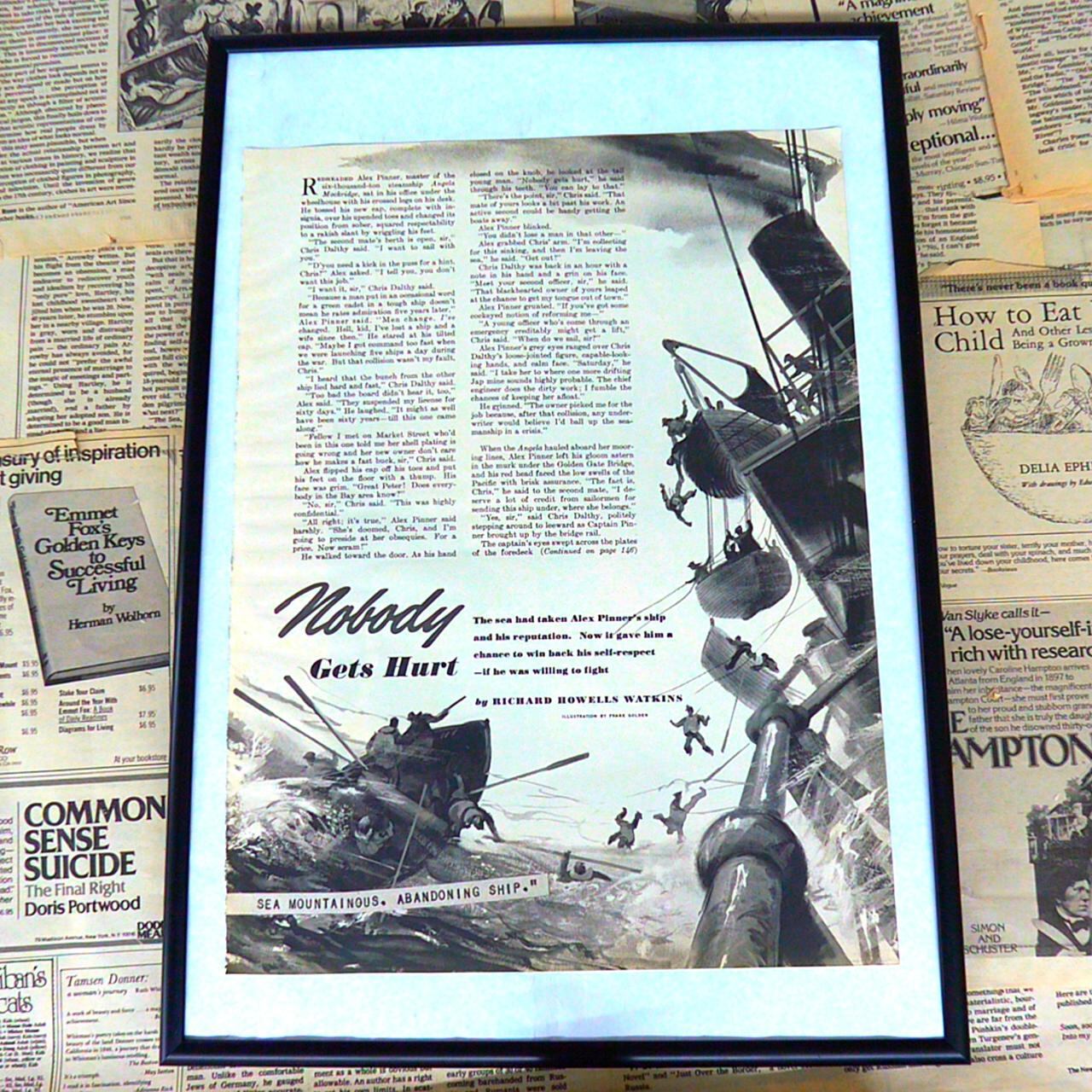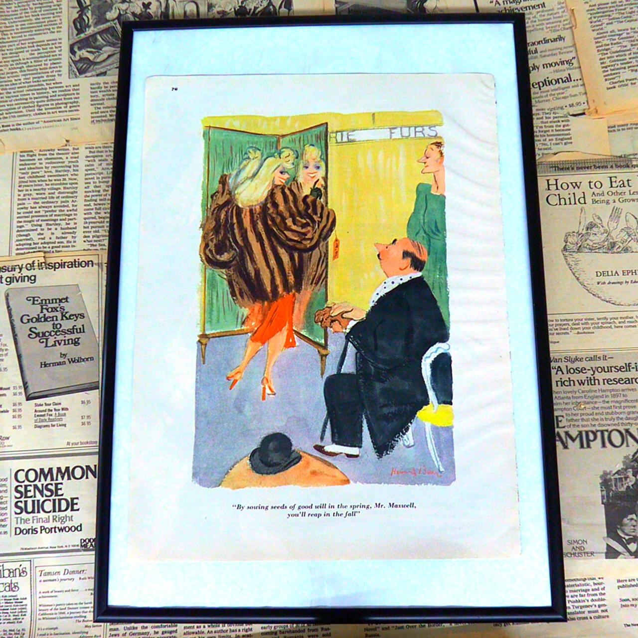 このイラストは、毛皮のコートを着た女性が試着室から現れ、鏡越しに自身の姿を確認している様子を描いています。手前には上品な紳士が椅子に座り、満足そうにその様子を見つめているのが印象的です。背景には「FURS(毛皮)」の文字が見え、毛皮店の一角でのワンシーンであることが伺えます。イラストの下には「春に善意の種をまけば、秋にその実りを得られるでしょう」という風刺的なキャプションが添えられており、商売や人間関係において、良い行いがやがて自分に返ってくるという教訓めいたユーモアが込められています。鮮やかな色彩や、人物の表情豊かな描写も魅力で、当時の雑誌らしい上品かつウィットに富んだ一枚です。