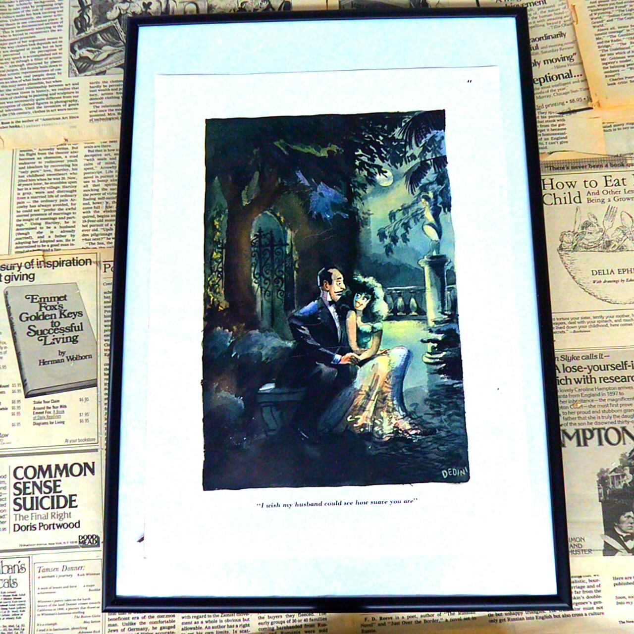 このイラストは、夜の庭園のようなロマンティックな雰囲気の中、ベンチに座った男女が親密そうに会話をしている様子を描いています。男性はタキシード姿、女性はエレガントなドレスを着ており、二人とも上品でクラシカルな印象です。イラストの下には「I wish my husband could see how smart you are(私の夫があなたの賢さを知っていればいいのに)」というキャプションが添えられており、ユーモラスかつ少し風刺的な意図が感じられます。このキャプションは、女性が夫以外の男性と知的な会話を楽しんでいる状況を示唆し、当時の社交界や人間関係の微妙な駆け引きをコミカルに描写しています。イラストレーターの筆致はやわらかく色彩豊かで、幻想的な光と影のコントラストが印象的。インテリアとしても雰囲気を高めるアートピースです。