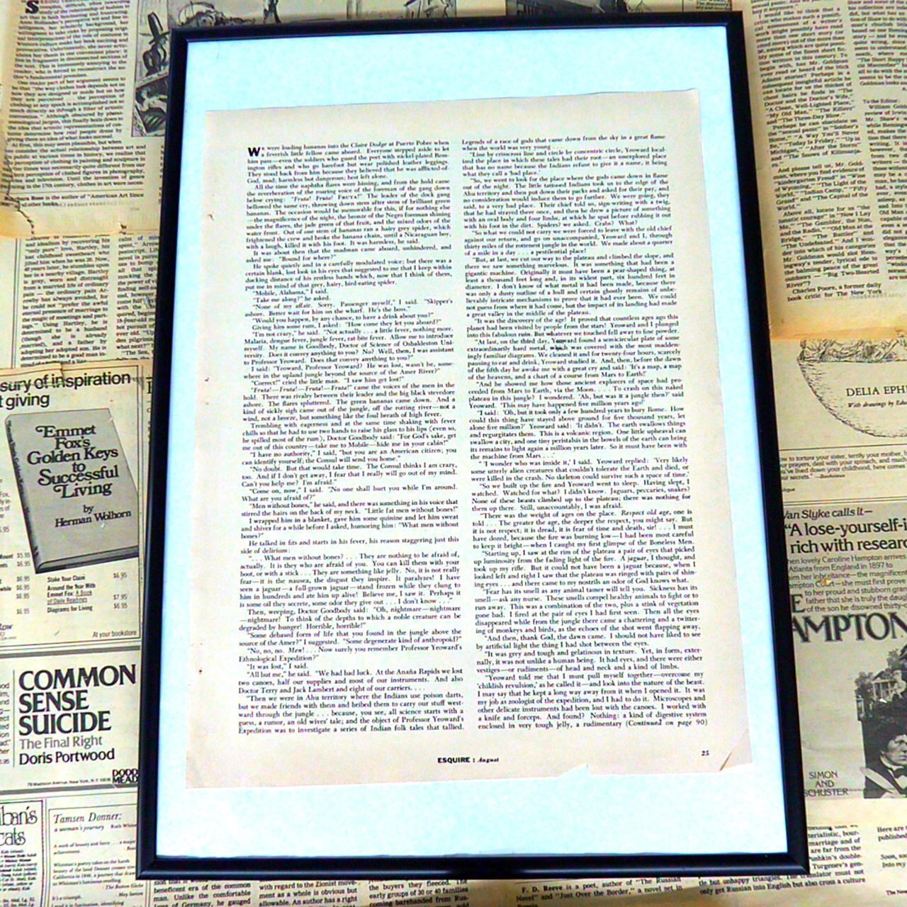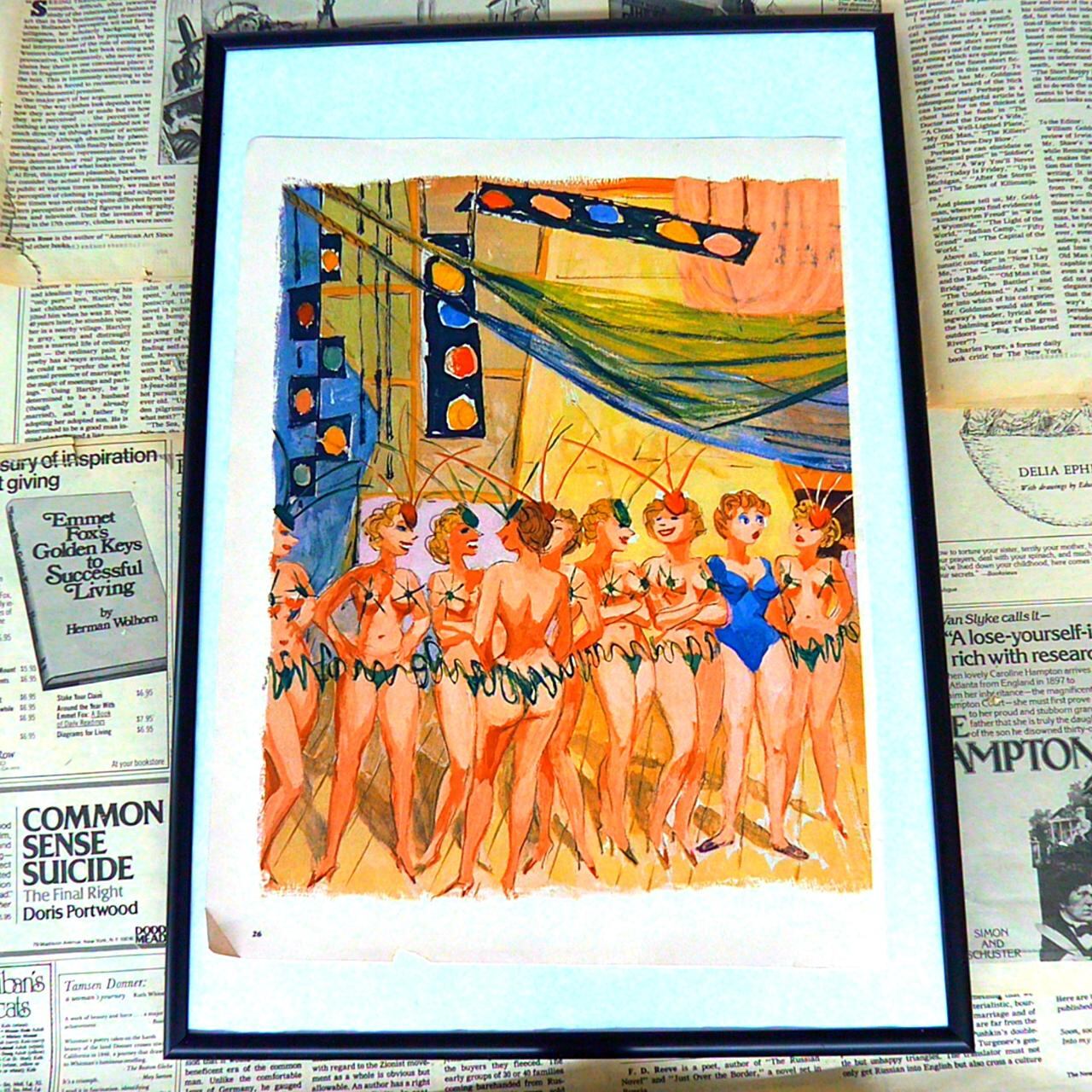 この1970年代の雑誌ページは、カラフルで生き生きとした舞台裏の一幕を描いたイラストです。画面中央には、ショーガールたちがステージ衣装を身にまとい、楽しげに談笑したり準備したりしている様子が描かれています。舞台照明や背景幕、スポットライトのカラフルな光が、彼女たちの明るい表情や華やかな雰囲気を一層引き立てています。衣装は水着のようなデザインで、頭には飾りや羽根を付けており、レトロなショービジネスの魅力が存分に表現されています。イラスト全体からは、舞台裏のワクワク感や高揚する気持ちが伝わり、鑑賞者もついその世界に引き込まれてしまいます。温かみのある手描きタッチと鮮やかな色使いが、当時の雑誌ならではのノスタルジックな雰囲気を醸し出しており、インテリアとしてもおすすめできる一枚です。