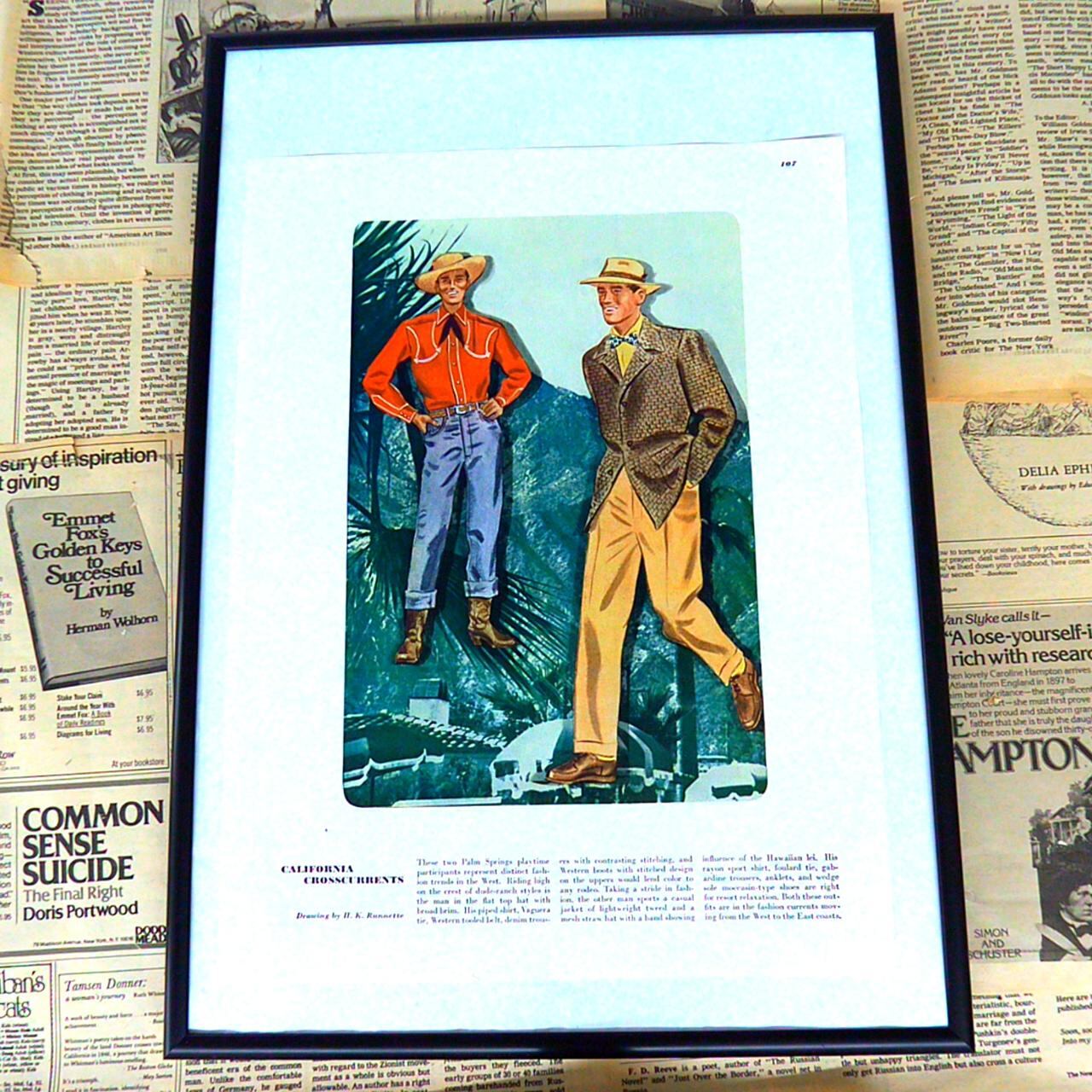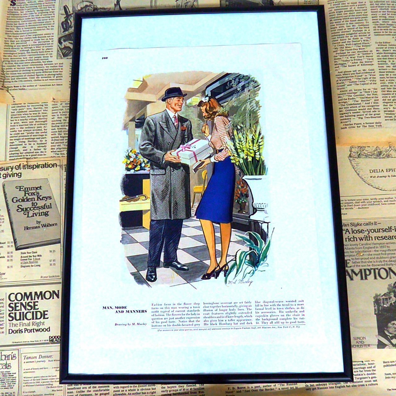 このイラストは、1950年代を彷彿とさせるクラシックな雰囲気のファッションイラストで、男性と女性が花屋の店頭で会話を交わしているシーンが描かれています。男性はグレーのチェスターコートにソフト帽、クラシックなスーツスタイルで、女性にプレゼントの箱を手渡ししています。女性はストライプのブラウスに青いミディ丈のスカート、飾りのついたヘッドバンドをつけ、エレガントかつキュートな装いです。背景には大ぶりの花が美しく活けられ、花屋の明るい店内の雰囲気と共に、当時の上品で洗練された日常の一コマを鮮やかに伝えています。イラストは柔らかなタッチと繊細な色彩で描かれており、物語性を感じさせる温かみのある作品です。キャプションからは、ファッションやエチケットについてのエッセイが添えられていることがわかり、当時の男性の装いと振る舞いに対する社会的な視線や時代背景が読み取れます。このページは、ノスタルジックでスタイリッシュな空気感をお部屋に取り入れたい方におすすめの一品です。