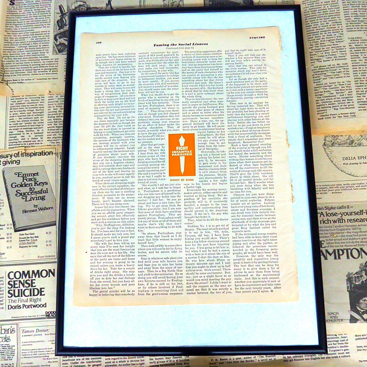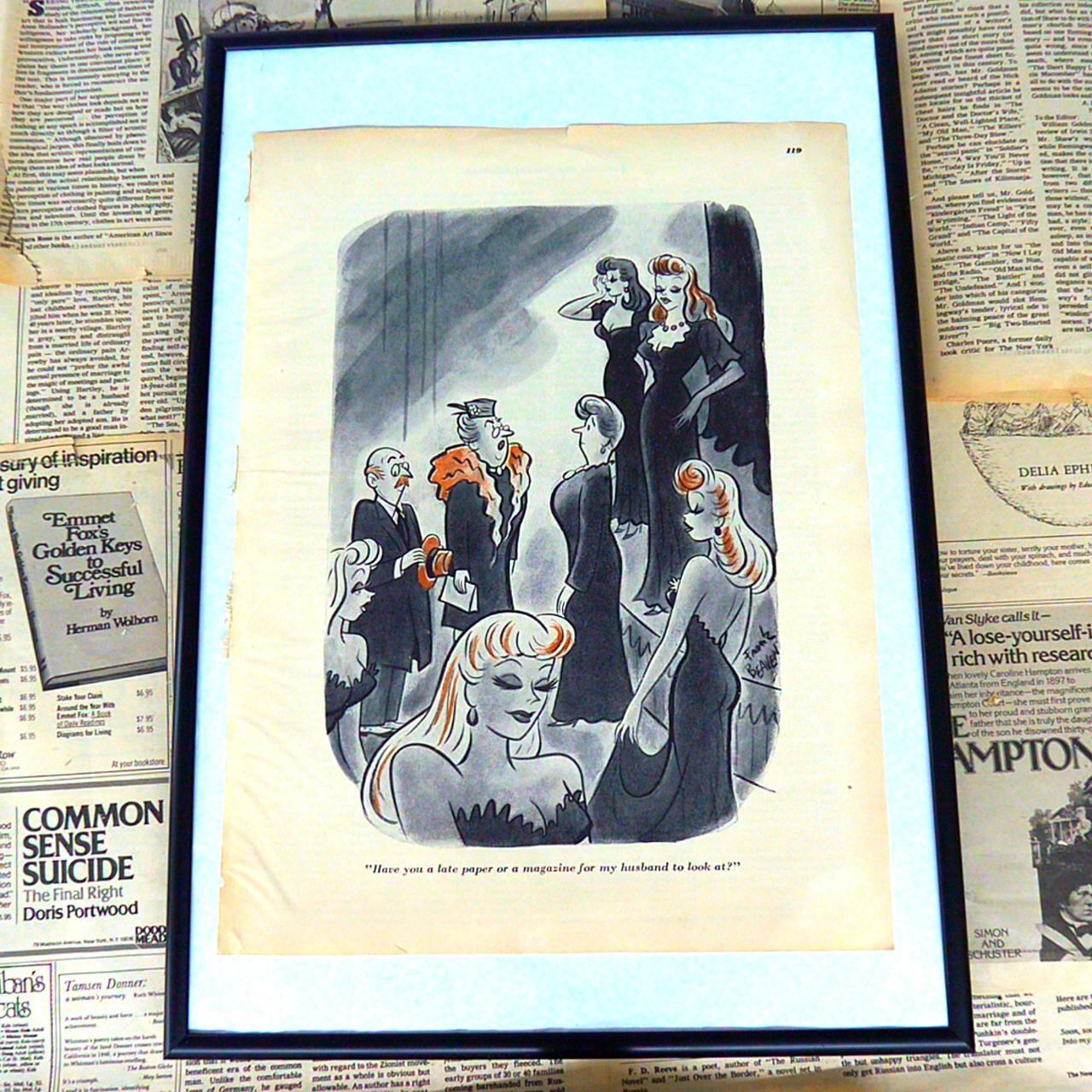 こちらは、モノクロと一部カラーを用いたヴィンテージな雰囲気が魅力のイラストです。イラストには、洗練されたドレスをまとった複数の女性と、紳士がパーティー会場のような場所で集う光景が描かれています。手前にはゴージャスなブロンド女性がほほえみ、奥には気まずそうな表情の紳士とそのパートナーらしき女性が立っています。キャプションには「Have you a late paper or a magazine for my husband to look at?」とあり、これは「夫が視線をそらせるような新聞か雑誌はありませんか?」という意味。パーティー会場で魅力的な女性たちが集まり、夫が居心地の悪さを感じている様子を皮肉たっぷりに描いたウィットに富んだイラストです。1950~70年代のアメリカンユーモアが感じられる一枚で、当時の世相や男女の関係性をユーモラスに表現しています。