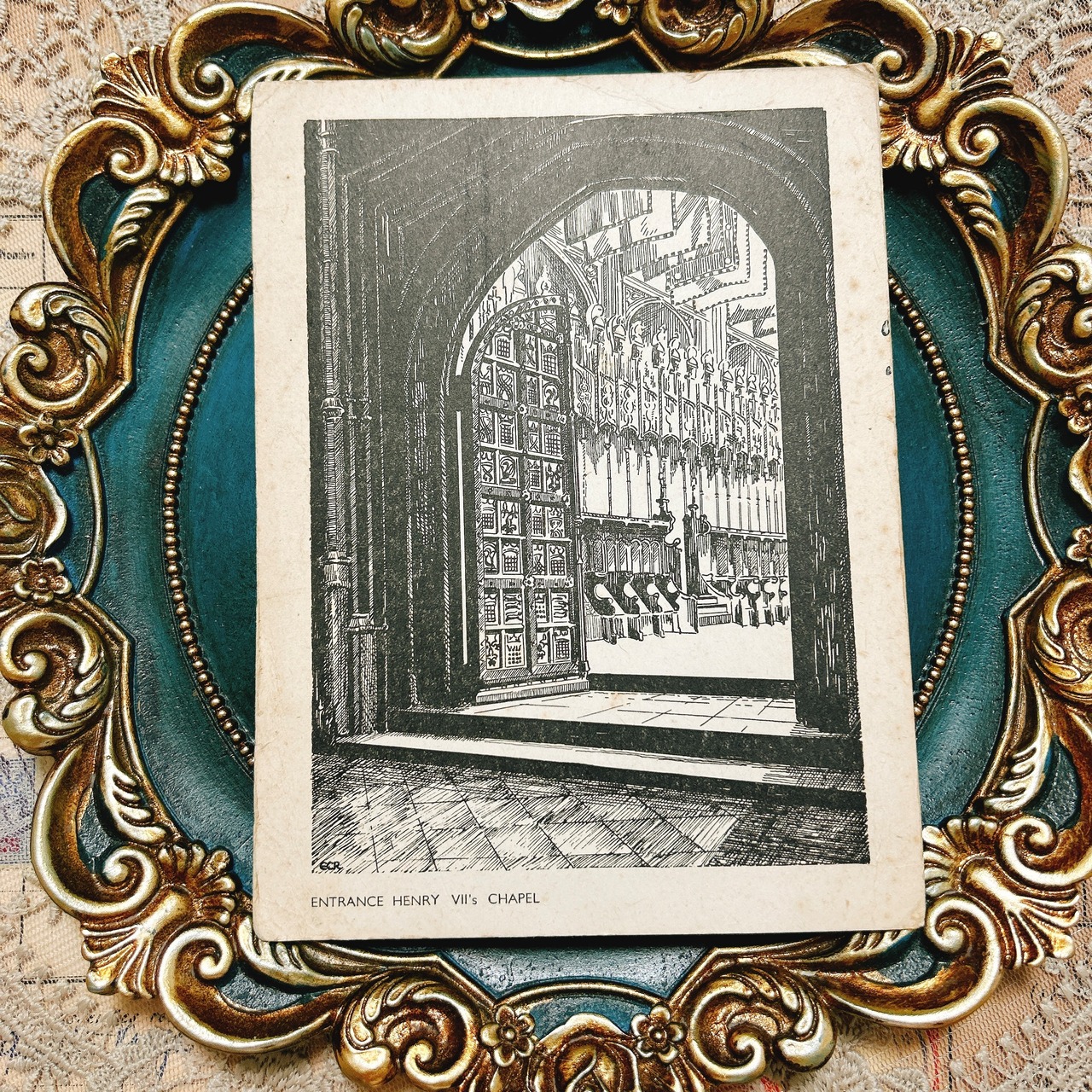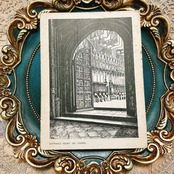 こちらは、ヘンリー7世礼拝堂の入り口を繊細な線画で描いた、アンティーク調のポストカードです。西洋建築の荘厳さと重厚感を感じさせる見事な構図が印象的で、ゴシック様式の細部まで丹念に描き込まれた扉や内部の彫刻装飾からは、制作者の卓越した技量と芸術的感性がうかがえます。