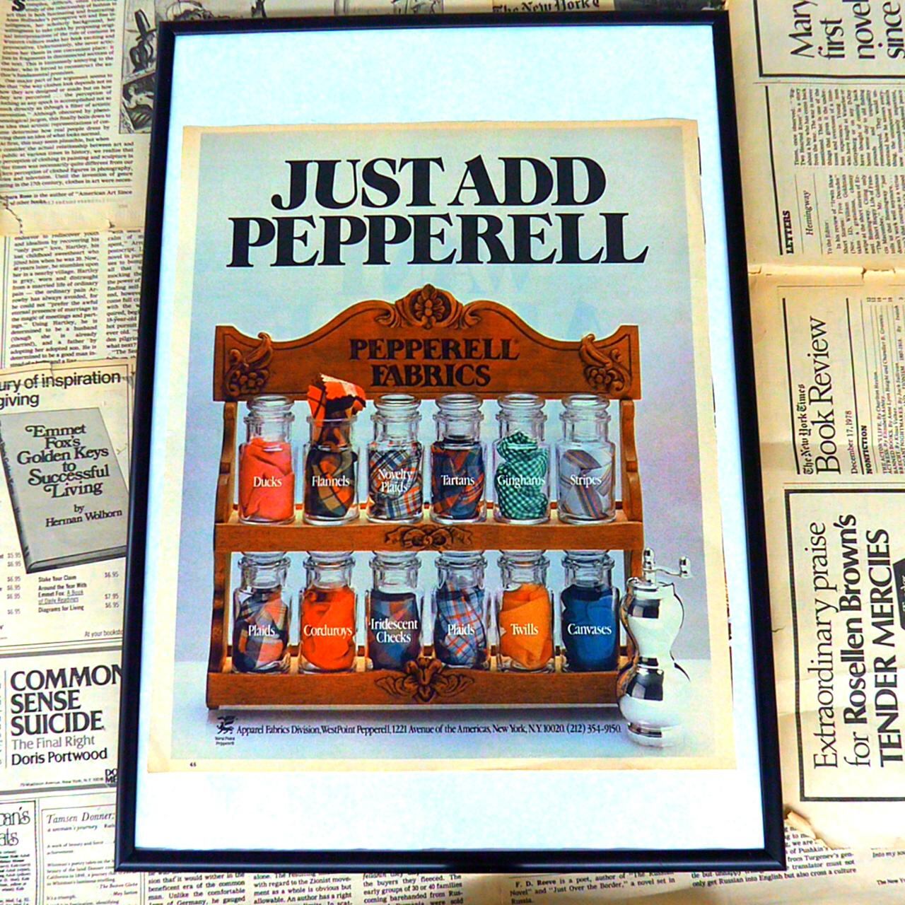 Pepperell Fabricsは、アメリカを拠点とする老舗の繊維メーカーです。長い歴史の中で、品質と多様性に優れた生地を提供し続けてきました。広告には、ダックス、フランネル、コーデュロイ、ツイル、キャンバスといった様々な生地が瓶に入れられて並んでおり、同社が取り扱う幅広いラインナップを象徴的に表現しています。Pepperellは家庭用からファッション用途まで多岐にわたる生地を生産しており、その柔らかさや耐久性、豊富なデザインで多くの消費者に支持されています。時代ごとの流行やニーズに合わせて革新を重ねる一方、クラシックな品質へのこだわりも持ち続ける企業です。