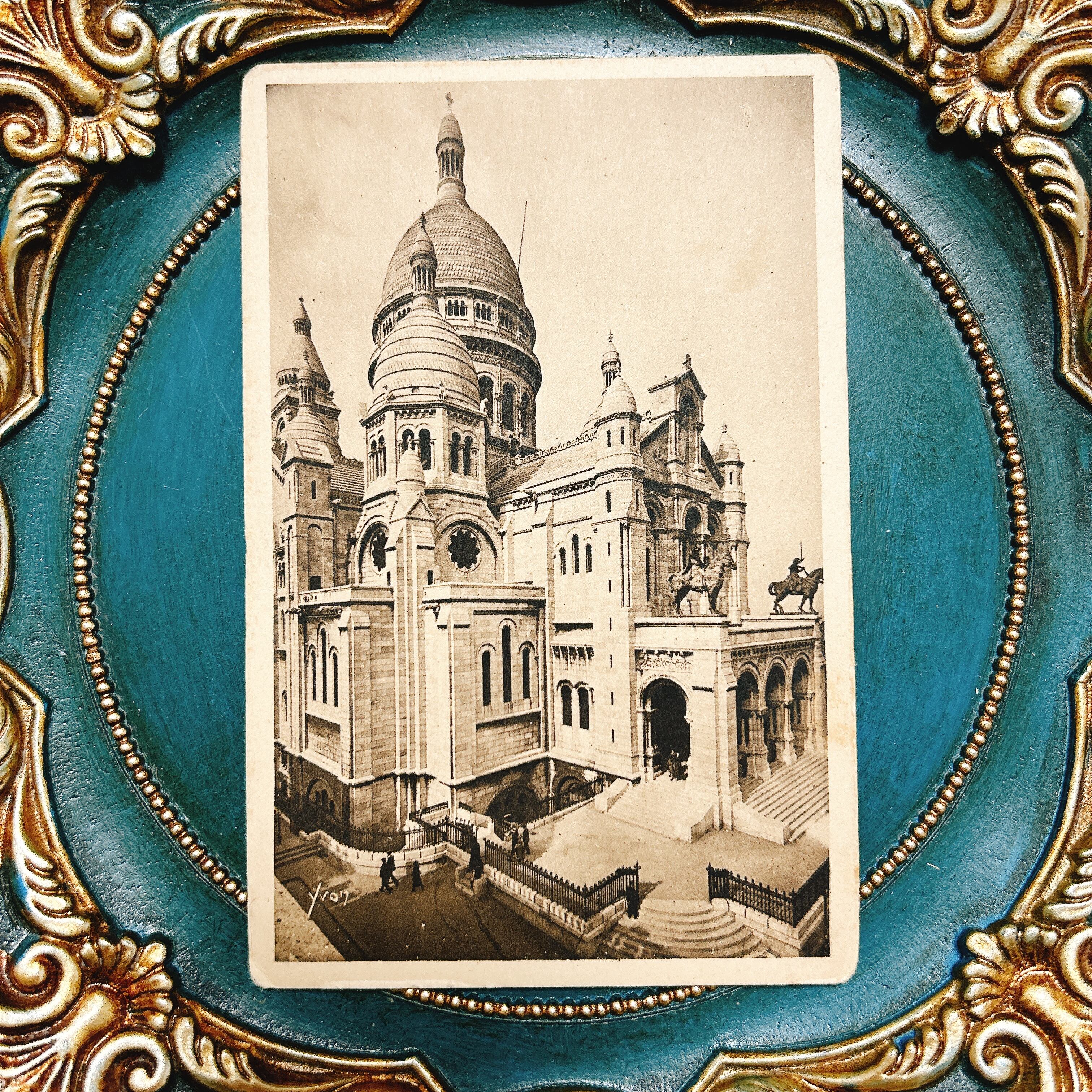 こちらは、フランス・パリのモンマルトルの丘に建つ象徴的建築「サクレ・クール寺院(La Basilique du Sacré-Cœur)」を写した、ヴィンテージポストカードです。堂々たるビザンチン・ロマネスク様式のファサードとドーム、そして寺院前に立つ2体の騎馬像が明瞭に捉えられ、荘厳さと芸術性を兼ね備えた一枚となっています。